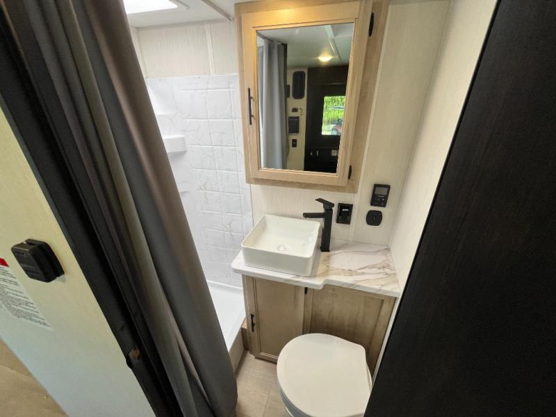 You will undoubtedly love this Cherokee Grey Wolf Black Label toy hauler! Because of its ability to have up to 15' 2" of cargo space, you can easily load up the ramp door and head out to your outdoor toy land, and you can bring much more than just your toys since this trailer also comes with exterior storage, a bedside wardrobe, overhead cabinets, an 10-cubic foot refrigerator, and a kitchen pantry. The full bathroom is another feature that is going to allow you to experience a true getaway since you won't need to find public facilities to use while you're gone, and the USB charging stations will allow you to charge your phone inside while you're outside playing.