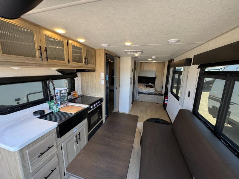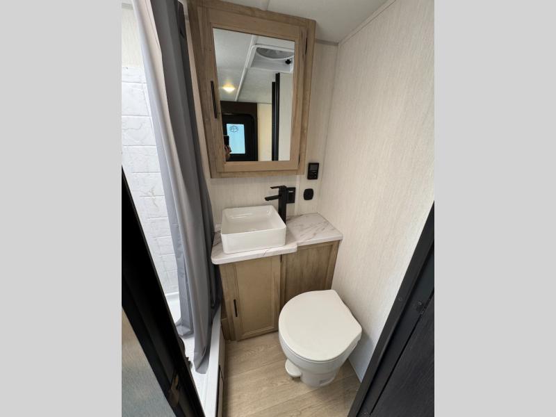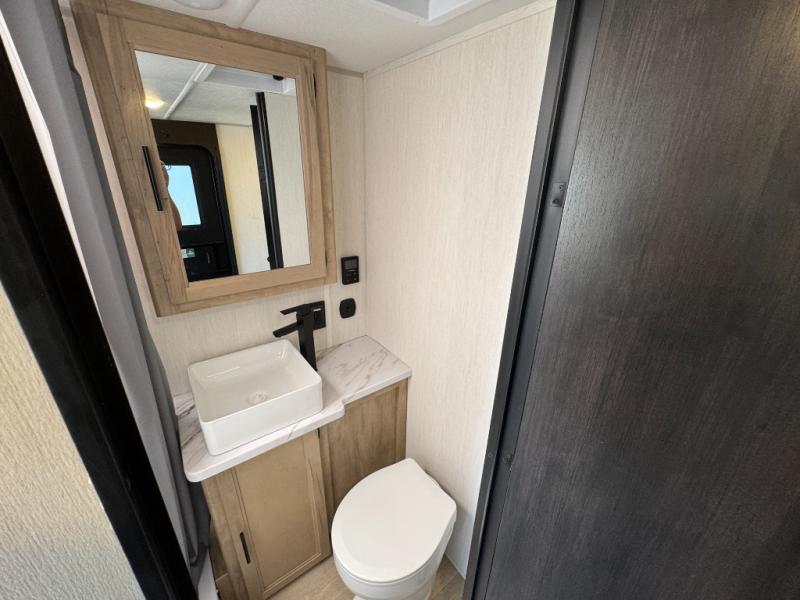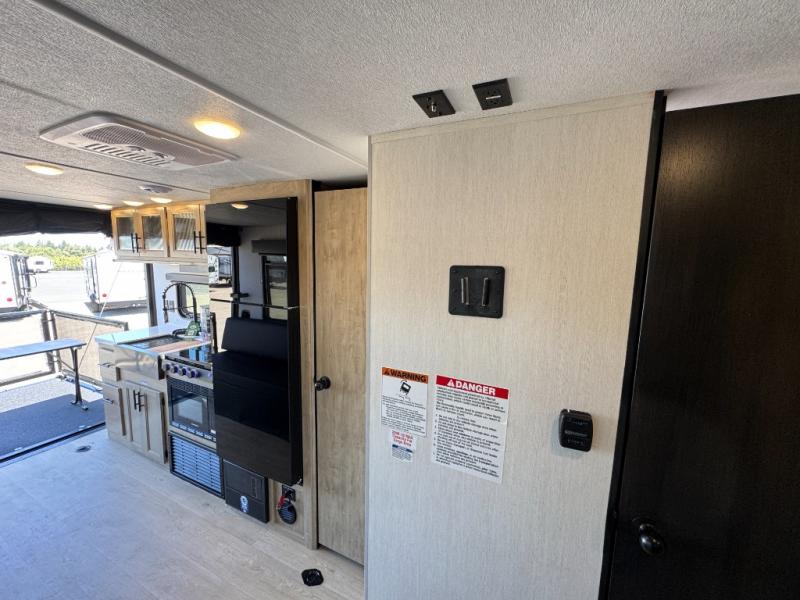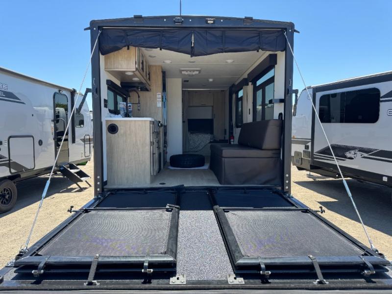 You will undoubtedly love this Cherokee Grey Wolf Black Label toy hauler! Because of its ability to have up to 15' 2" of cargo space, you can easily load up the ramp door and head out to your outdoor toy land, and you can bring much more than just your toys since this trailer also comes with exterior storage, a bedside wardrobe, overhead cabinets, an 10-cubic foot refrigerator, and a kitchen pantry. The full bathroom is another feature that is going to allow you to experience a true getaway since you won't need to find public facilities to use while you're gone, and the USB charging stations will allow you to charge your phone inside while you're outside playing.