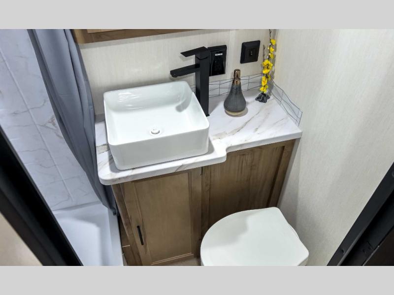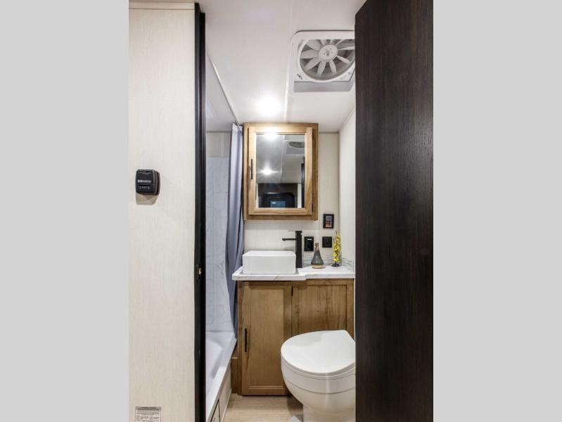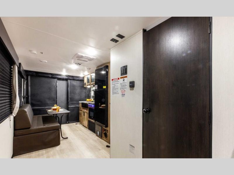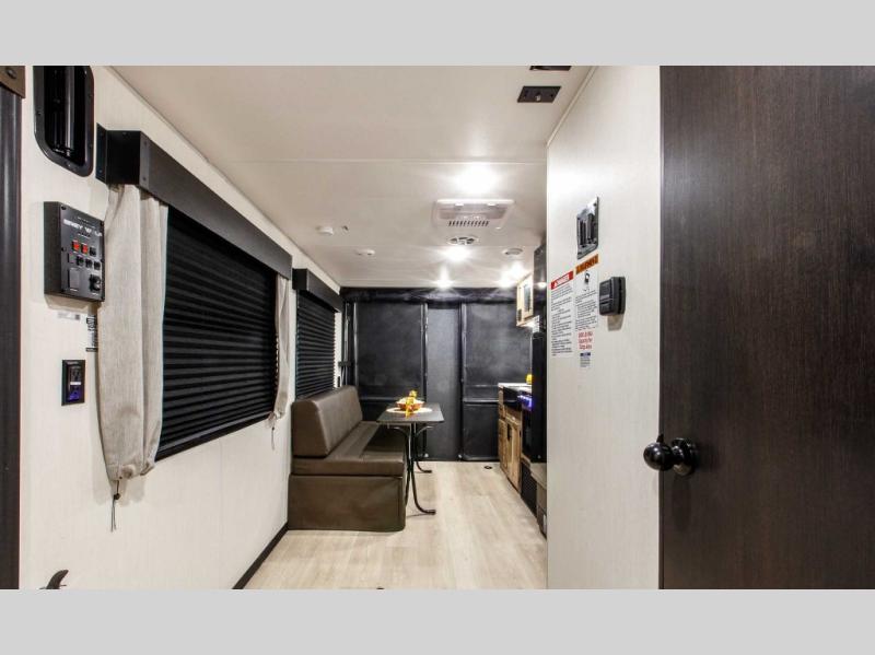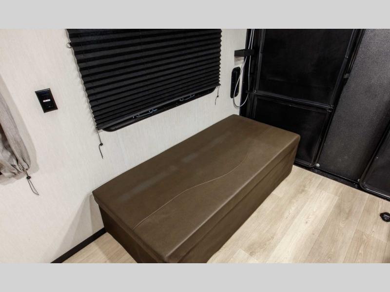 You will undoubtedly love this Cherokee Grey Wolf Black Label toy hauler! Because of its ability to have up to 15' 2" of cargo space, you can easily load up the ramp door and head out to your outdoor toy land, and you can bring much more than just your toys since this trailer also comes with exterior storage, a bedside wardrobe, overhead cabinets, an 10-cubic foot refrigerator, and a kitchen pantry. The full bathroom is another feature that is going to allow you to experience a true getaway since you won't need to find public facilities to use while you're gone, and the USB charging stations will allow you to charge your phone inside while you're outside playing.