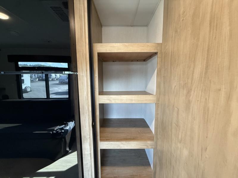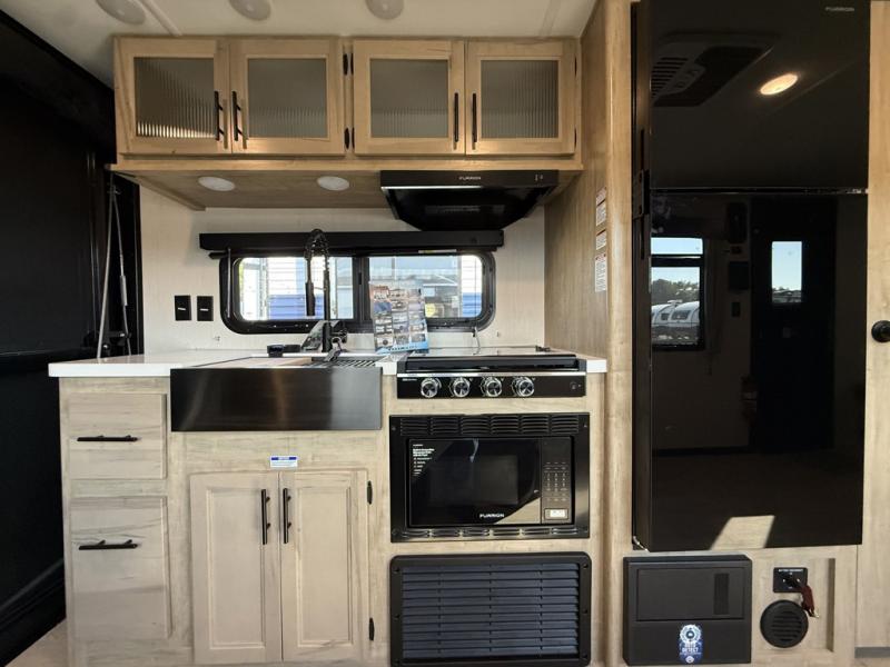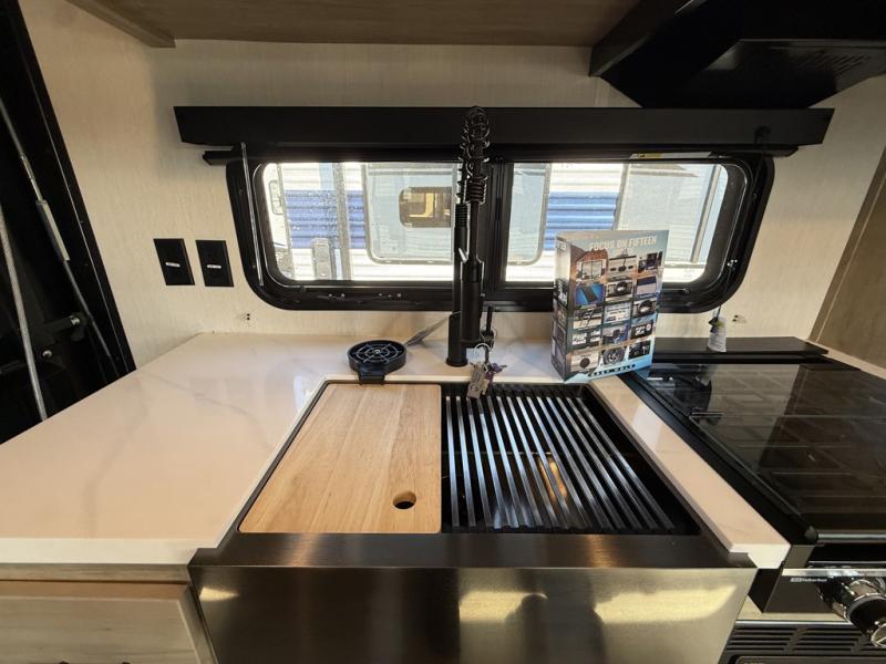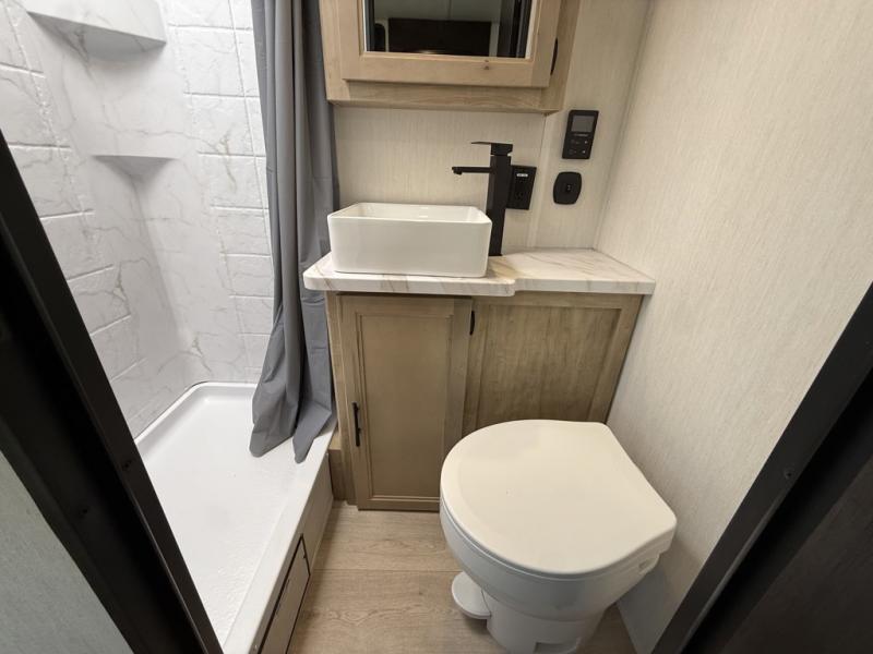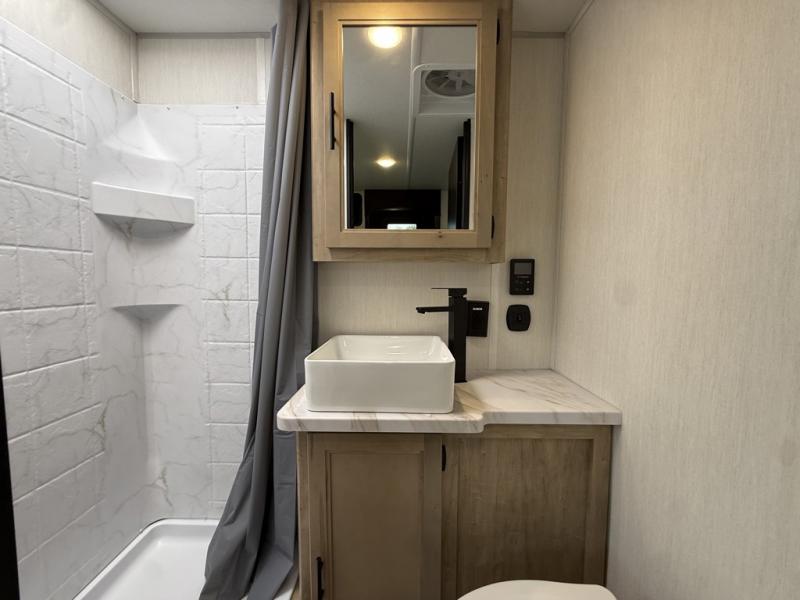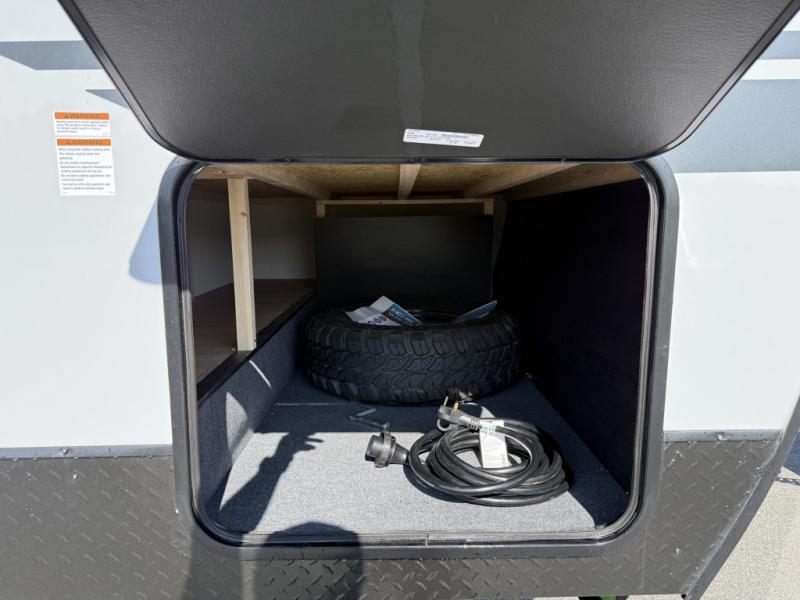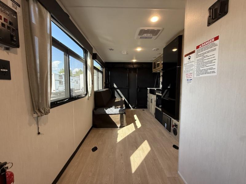 You will undoubtedly love this Cherokee Grey Wolf Black Label toy hauler! Because of its ability to have up to 15' 2" of cargo space, you can easily load up the ramp door and head out to your outdoor toy land, and you can bring much more than just your toys since this trailer also comes with exterior storage, a bedside wardrobe, overhead cabinets, an 10-cubic foot refrigerator, and a kitchen pantry. The full bathroom is another feature that is going to allow you to experience a true getaway since you won't need to find public facilities to use while you're gone, and the USB charging stations will allow you to charge your phone inside while you're outside playing.
