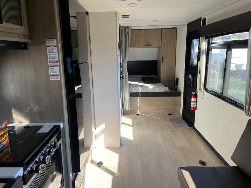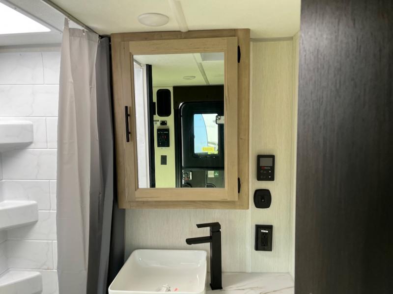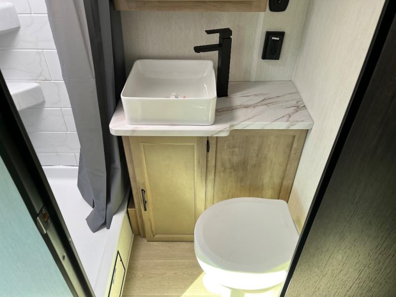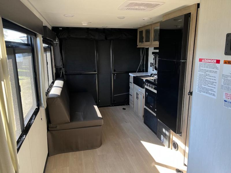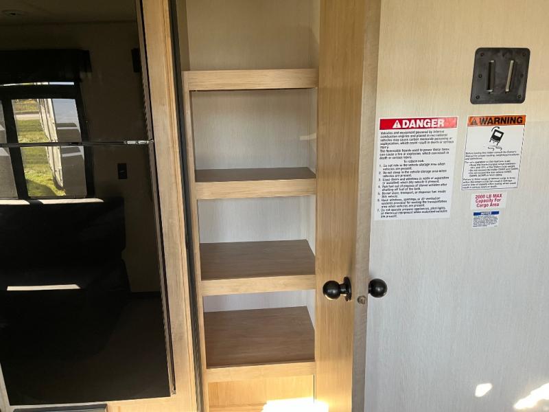 You will undoubtedly love this Cherokee Grey Wolf Black Label toy hauler! Because of its ability to have up to 15' 2" of cargo space, you can easily load up the ramp door and head out to your outdoor toy land, and you can bring much more than just your toys since this trailer also comes with exterior storage, a bedside wardrobe, overhead cabinets, a refrigerator, and a kitchen pantry. The full bathroom is another feature that is going to allow you to experience a true getaway since you won't need to find public facilities to use while you're gone, and the USB charging stations will allow you to charge your phone inside while you're outside playing.