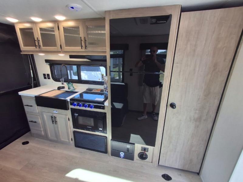You will undoubtedly love this Cherokee Grey Wolf Black Label toy hauler! Because of its ability to have up to 15' 2" of cargo space, you can easily load up the ramp door and head out to your outdoor toy land, and you can bring much more than just your toys since this trailer also comes with exterior storage, a bedside wardrobe, overhead cabinets, a refrigerator, and a kitchen pantry. The full bathroom is another feature that is going to allow you to experience a true getaway since you won't need to find public facilities to use while you're gone, and the USB charging stations will allow you to charge your phone inside while you're outside playing.