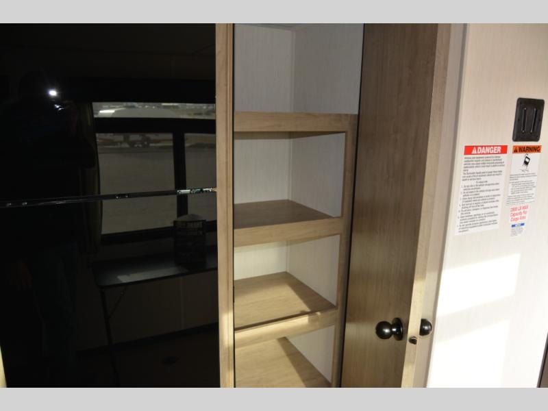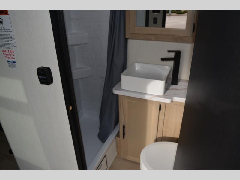 You will undoubtedly love this Cherokee Grey Wolf Black Label toy hauler! Because of its ability to have up to 15' 2" of cargo space, you can easily load up the ramp door and head out to your outdoor toy land, and you can bring much more than just your toys since this trailer also comes with exterior storage, a bedside wardrobe, overhead cabinets, a refrigerator, and a kitchen pantry. The full bathroom is another feature that is going to allow you to experience a true getaway since you won't need to find public facilities to use while you're gone, and the USB charging stations will allow you to charge your phone inside while you're outside playing.