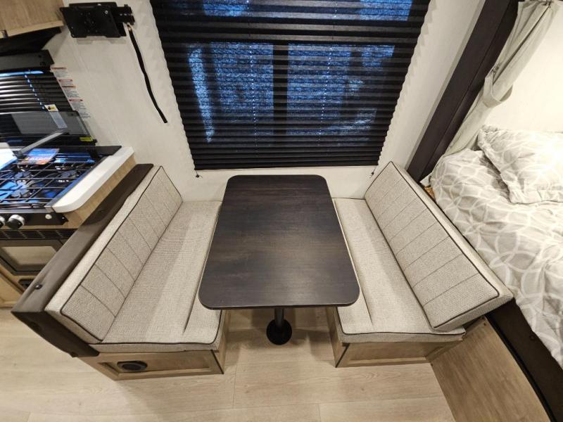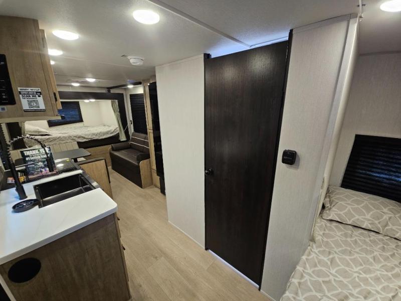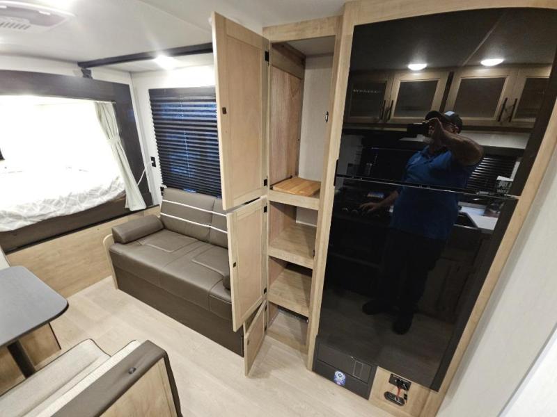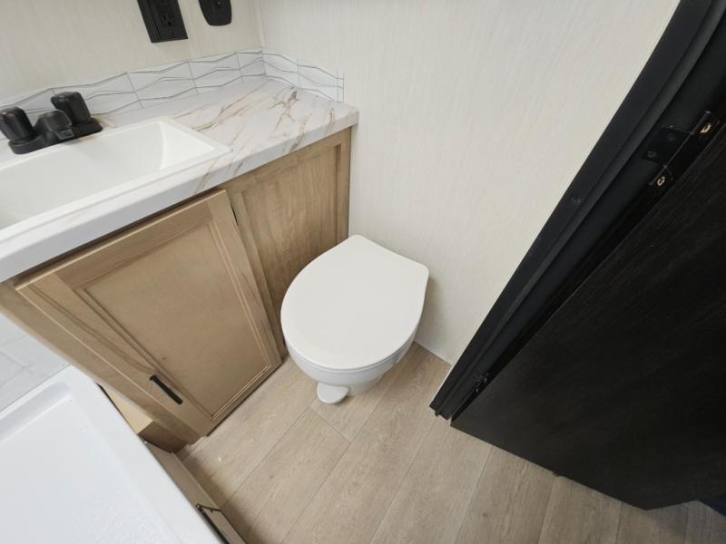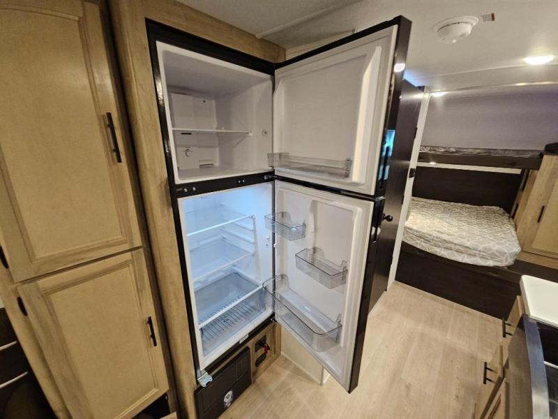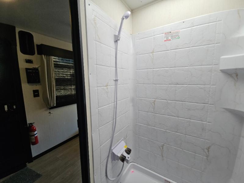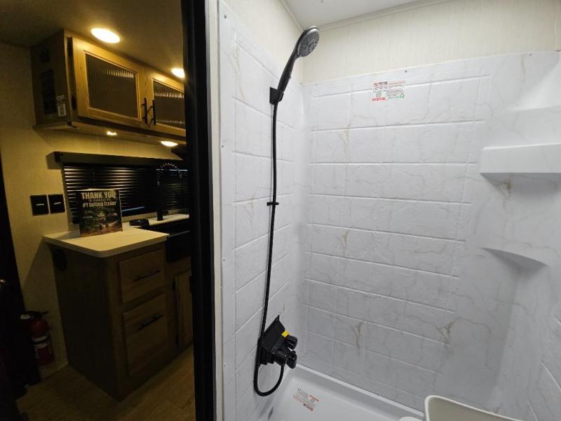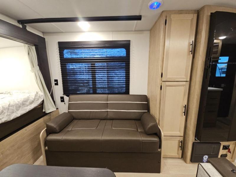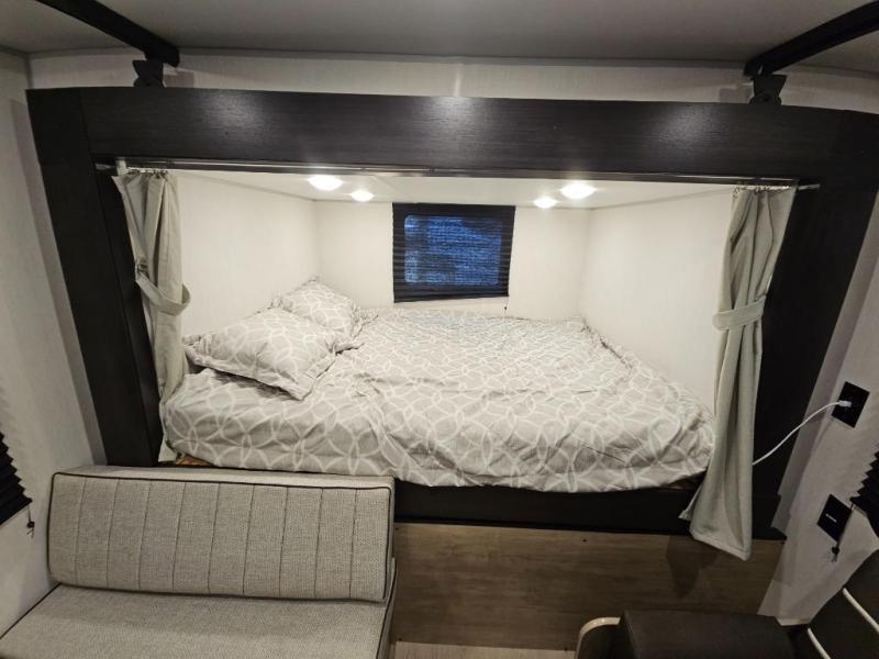 A family of seven or eight can enjoy many outdoor adventures in this Cherokee Grey Wolf Black Label travel trailer which features two queen beds and a bunk above the front bed. With the rear queen bed slide, you gain sleeping space without having additional tow length added. You will find large overhead cabinets inside, a pantry to bring along your favorite snacks, and a wardrobe for keeping your clothes wrinkle free. There is a booth dinette for you to enjoy your meals at or play some card games, and there is also a sofa for those who just want to sit back and watch. A conveniently located bathroom that sits directly across from the main entry makes it easy to access from outside. There is also a nice 15' power awning for creating additional living space so that you can enjoy the outdoors whether rain or shine!