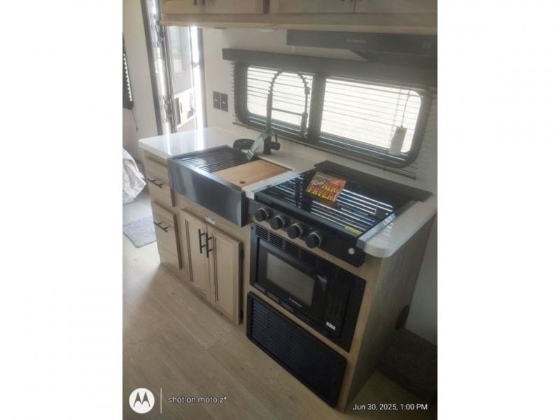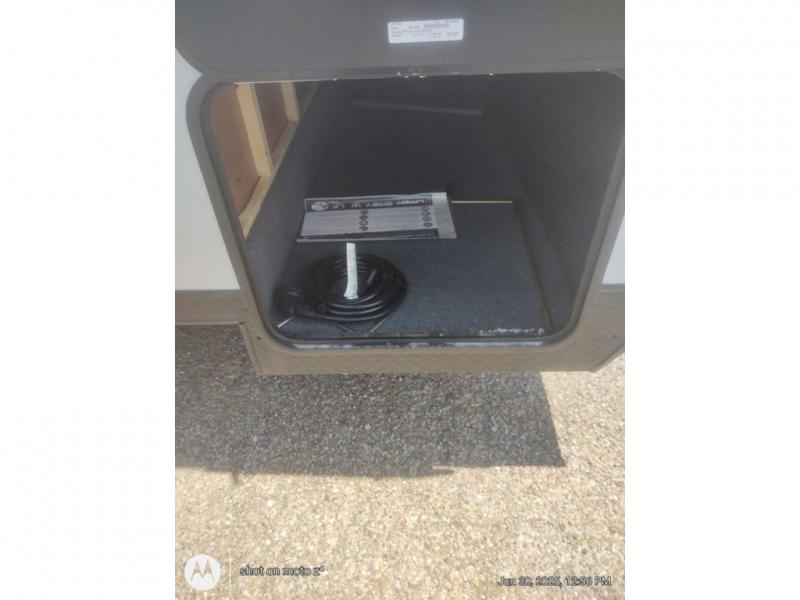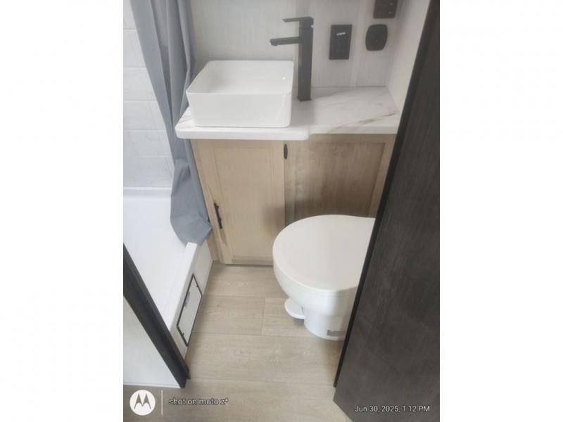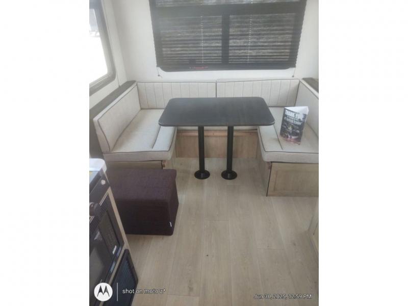 Time spent at the campground in this well designed travel trailer will be time well spent! The front bedroom includes a walk-around RV king bed, a bedroom wardrobe plus USB ports to charge your phone or laptop. You can whip up breakfast in the modern kitchen that includes an air fryer, then dine around the U-shaped dinette with a panoramic window. This area can also double as sleeping space for one to two guests as well! A pantry will let you stock up on snacks and the TV mount means you can bring along a television if you want to enjoy movie nights. There is also a full bath with a tub/shower where you can freshen up each day!