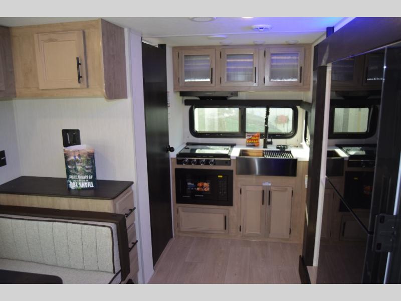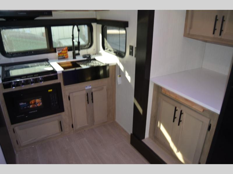 You will love traveling with this Cherokee Grey Wolf Black Label in tow. This is a great unit for a couple or family as the booth dinette and sofa can both be used for added sleeping for children or quests if needed. There is a comfortable RV king bed up front that you will love for a great night's rest with storage space for your clothing. An air fryer is available for cooking inside, and the rear corner bath includes a tub/shower, toilet and sink. A nice 15' awning creates more outdoor living space to enjoy protected from the elements. You can also add a TV on the exterior as it has an outside TV mount.