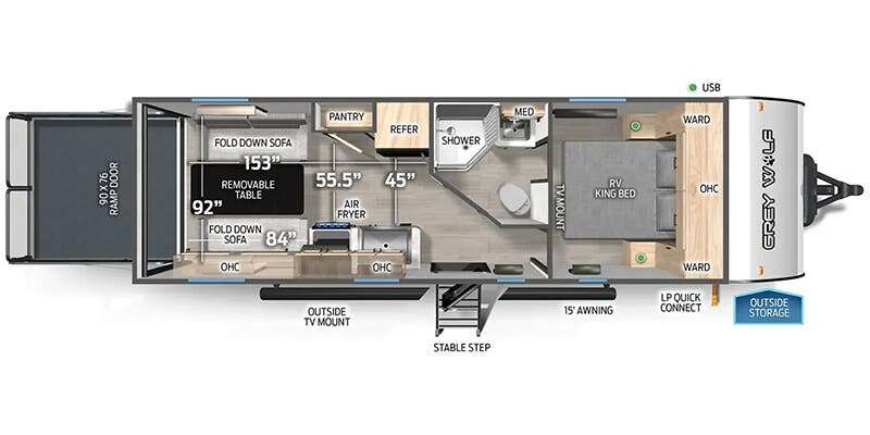 Forest River Cherokee Grey Wolf Black Label toy hauler 22RRBL highlights: