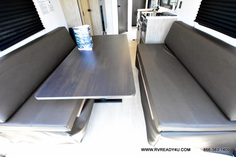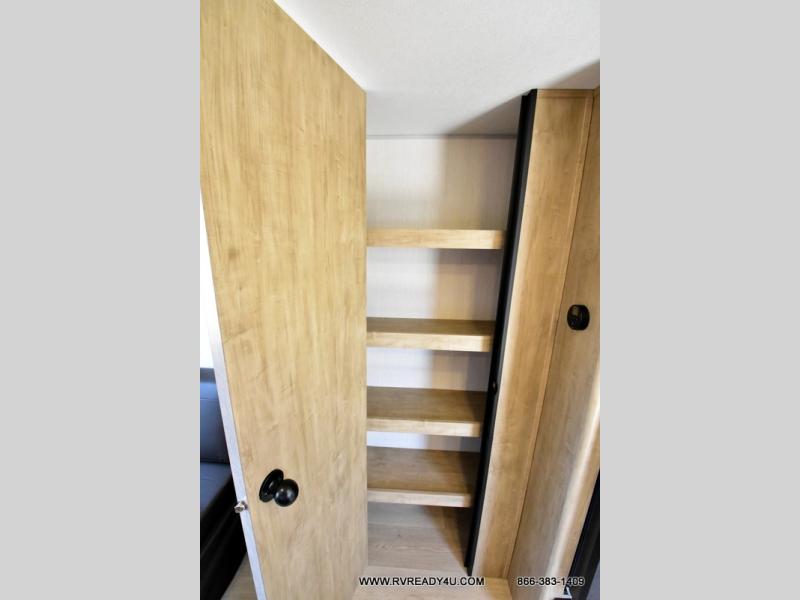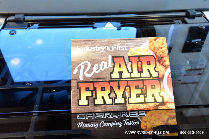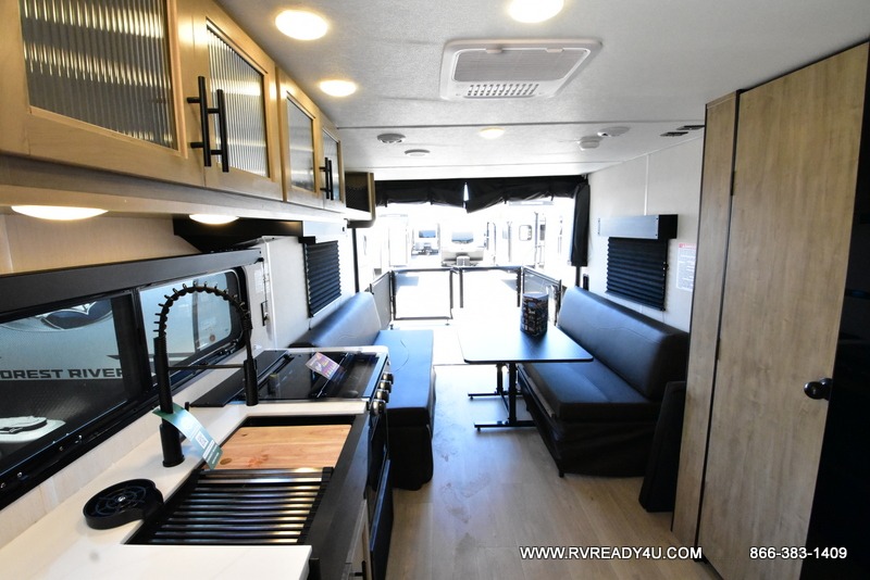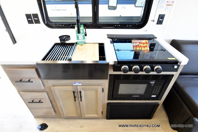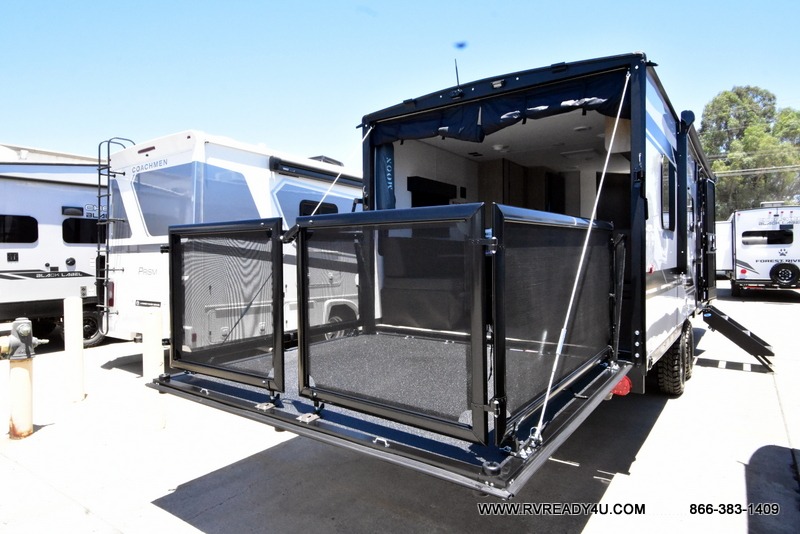 You will love this Cherokee Grey Wolf Black Label toy hauler with a rear ramp door for loading and unloading your toys and gear. If you position the fold-down sofas up against the wall, you will have even more room for extra gear when you are moving down the road. Set up camp and easily create a great dining area with the table between each fold-down sofa. You can also create your best meals in a breeze with the air fryer, and a large pantry allows you to pack all of the snacks and canned goods you need for your adventure. You will appreciate the master suite up front for a great night's rest on the RV king bed along with easy access into the dual-entry bath.
