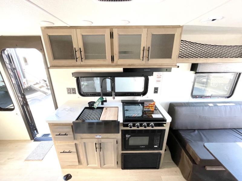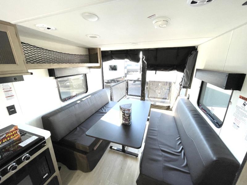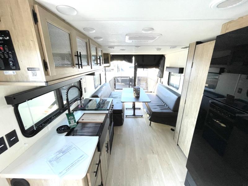 You will love this Cherokee Grey Wolf Black Label toy hauler with a rear ramp door for loading and unloading your toys and gear. If you position the fold-down sofas up against the wall, you will have even more room for extra gear when you are moving down the road. Set up camp and easily create a great dining area with the table between each fold-down sofa. You can also create your best meals in a breeze with the air fryer, and a large pantry allows you to pack all of the snacks and canned goods you need for your adventure. You will appreciate the master suite up front for a great night's rest on the RV king bed along with easy access into the dual-entry bath.