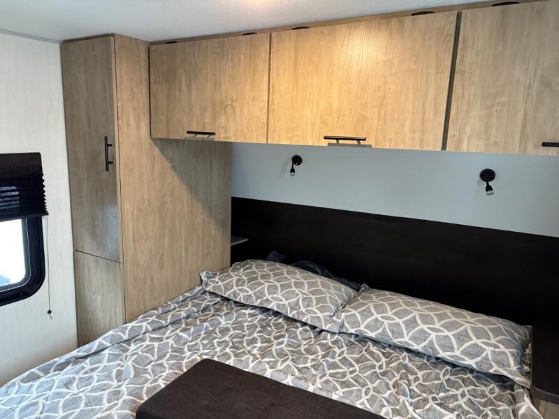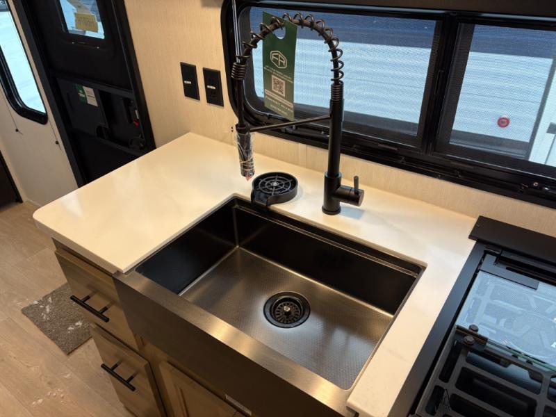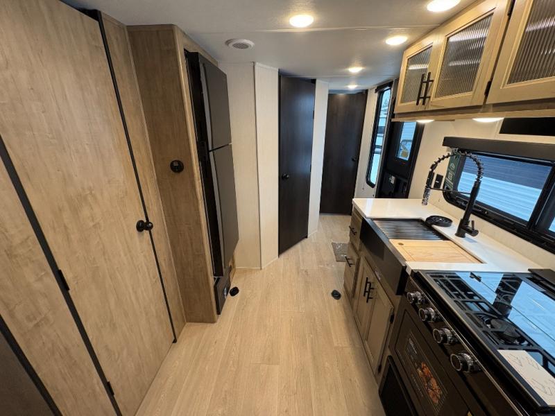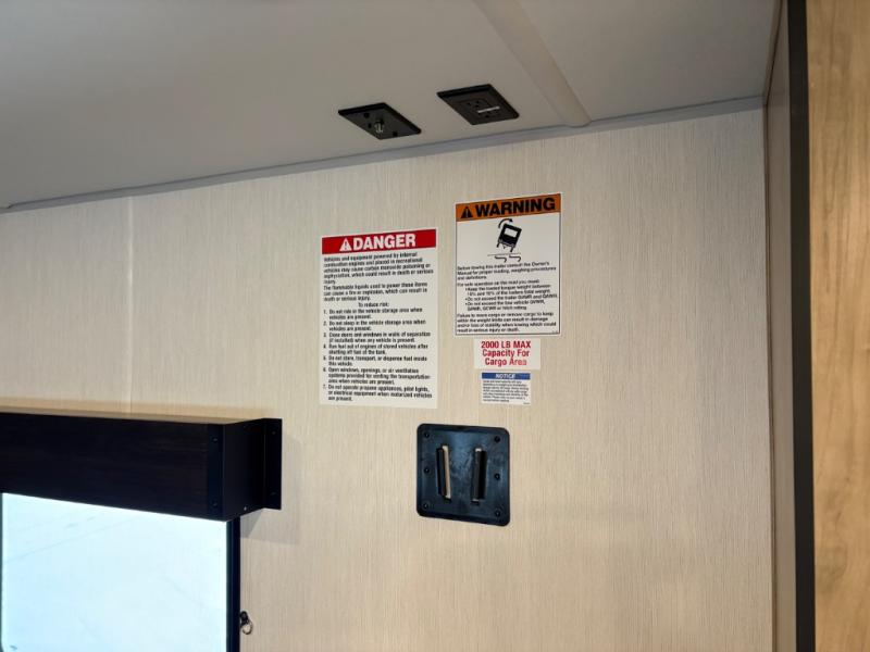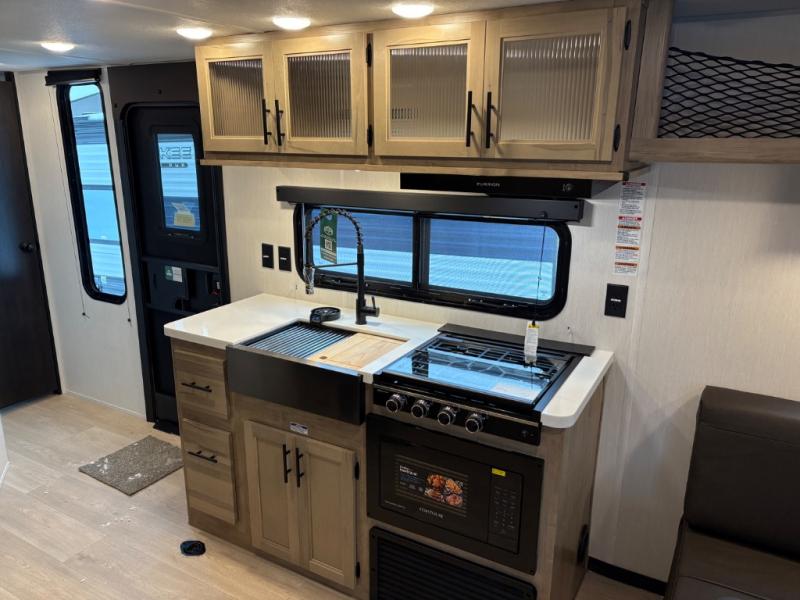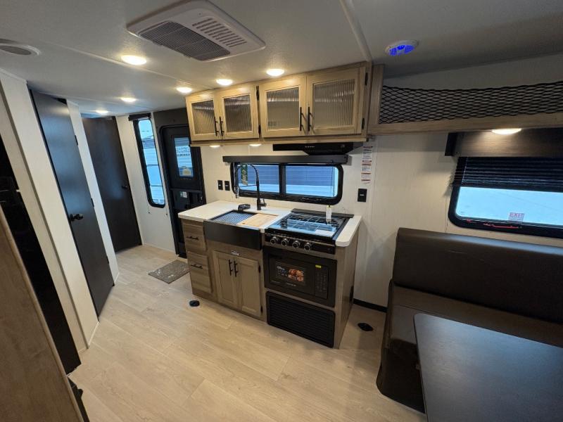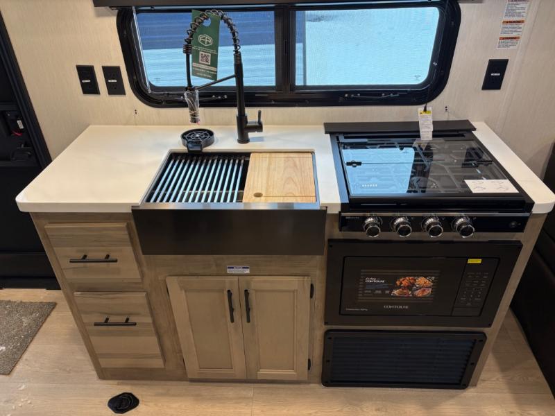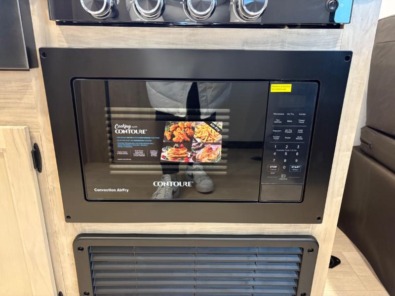 You will love this Cherokee Grey Wolf Black Label toy hauler with a rear ramp door for loading and unloading your toys and gear. If you position the fold-down sofas up against the wall, you will have even more room for extra gear when you are moving down the road. Set up camp and easily create a great dining area with the table between each fold-down sofa. You can also create your best meals in a breeze with the air fryer, and a large pantry allows you to pack all of the snacks and canned goods you need for your adventure. You will appreciate the master suite up front for a great night's rest on the RV king bed along with easy access into the dual-entry bath.