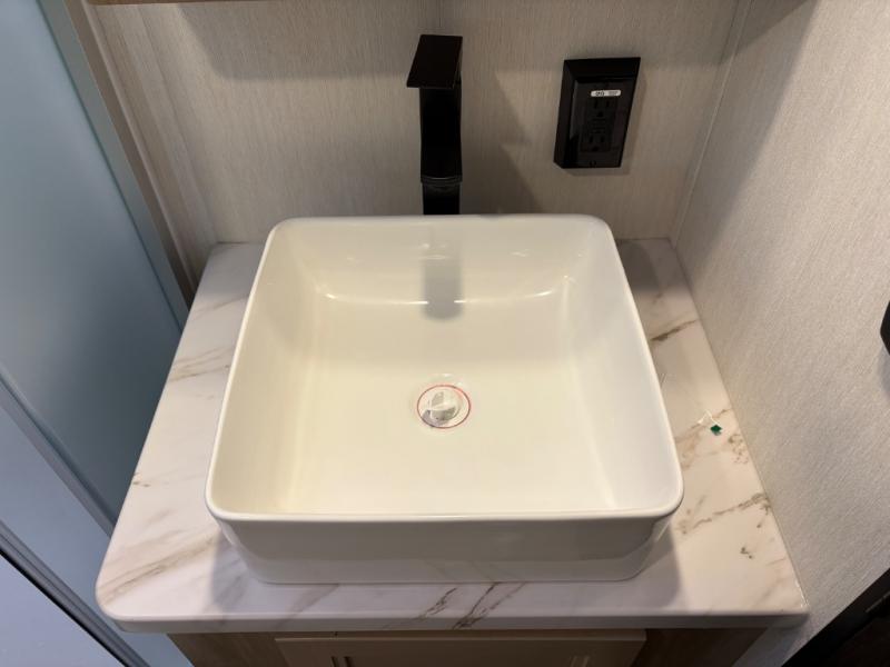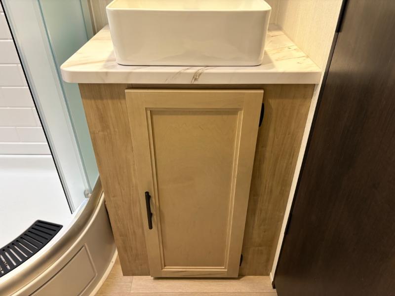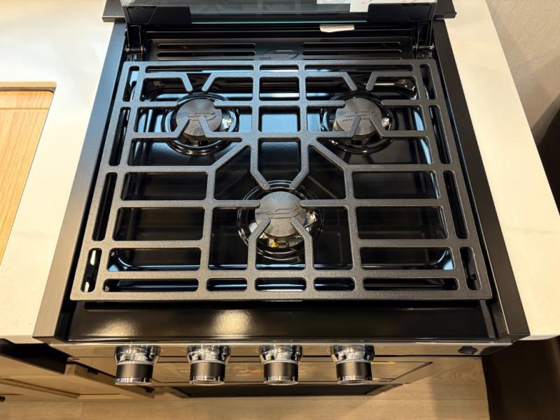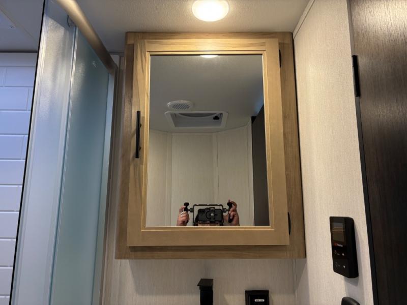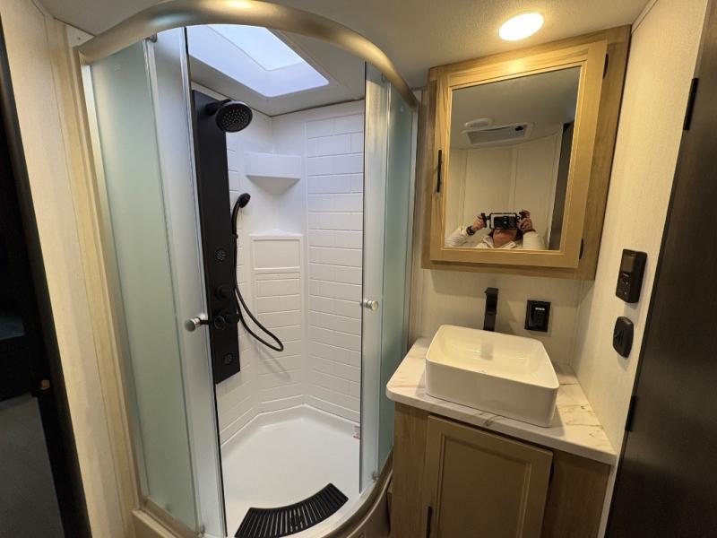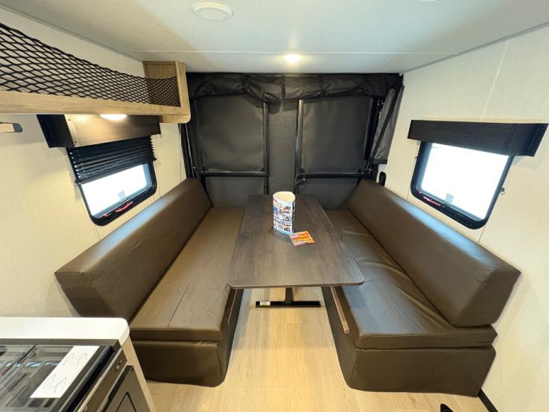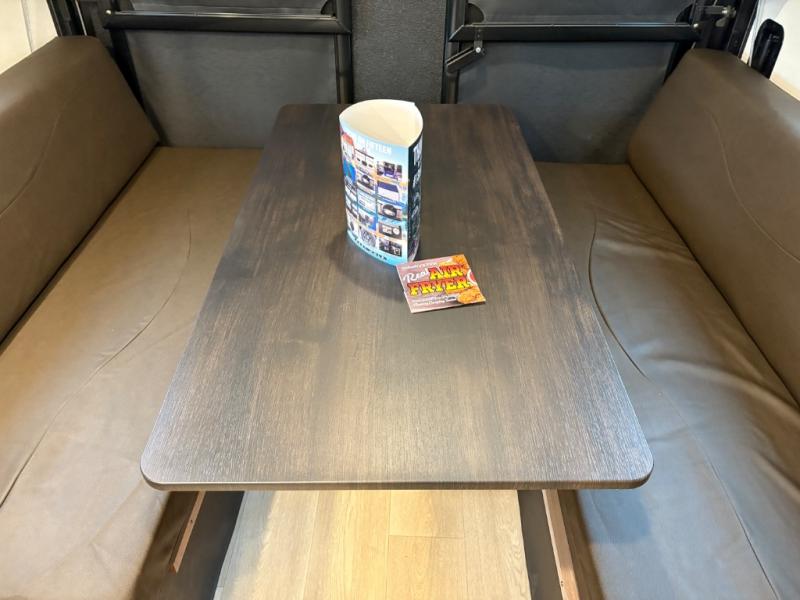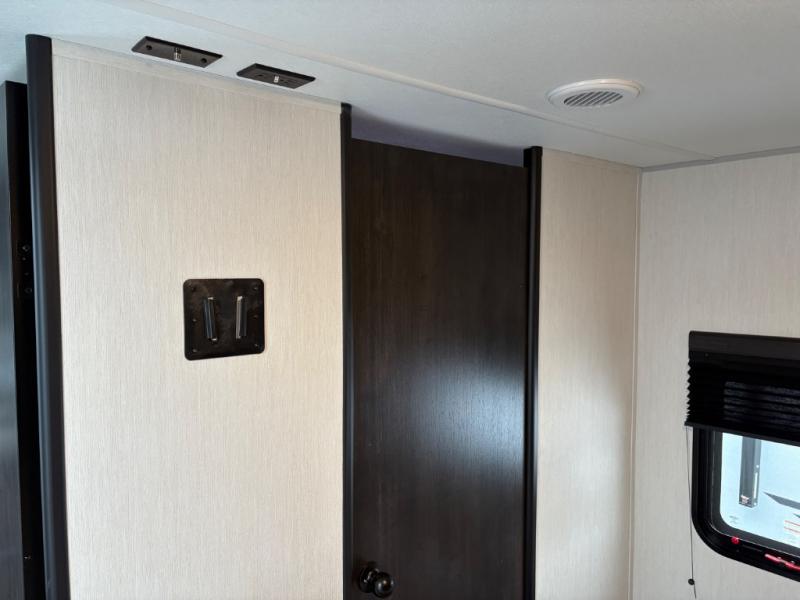 You will love this Cherokee Grey Wolf Black Label toy hauler with a rear ramp door for loading and unloading your toys and gear. If you position the fold-down sofas up against the wall, you will have even more room for extra gear when you are moving down the road. Set up camp and easily create a great dining area with the table between each fold-down sofa. You can also create your best meals in a breeze with the air fryer, and a large pantry allows you to pack all of the snacks and canned goods you need for your adventure. You will appreciate the master suite up front for a great night's rest on the RV king bed along with easy access into the dual-entry bath.