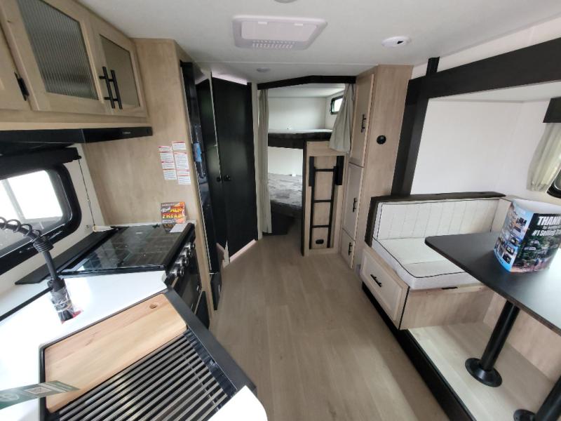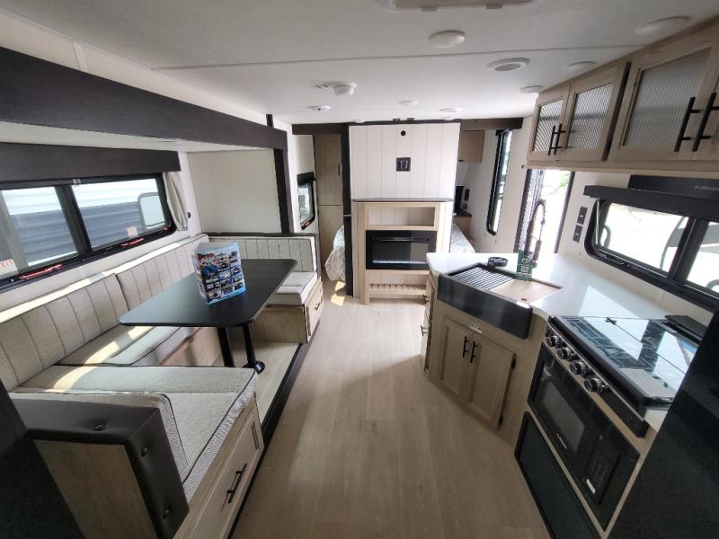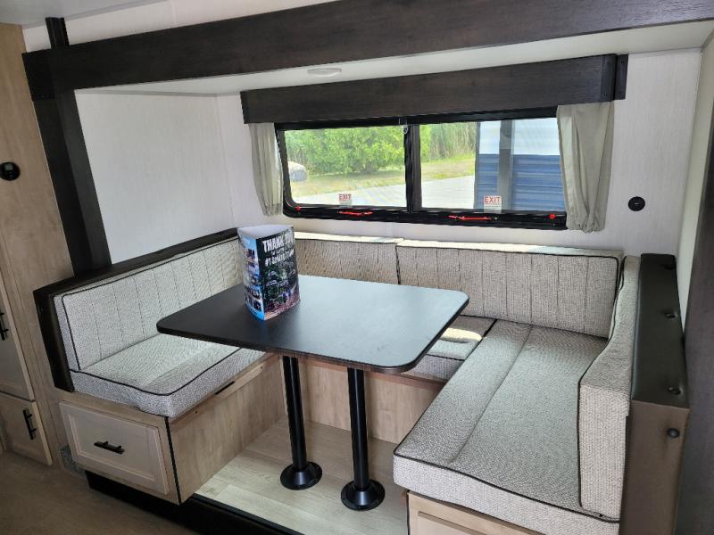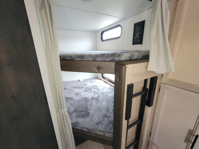 You will love the space provided in this dual entry Cherokee Grey Wolf Black Label travel trailer that has double-size bunks! The rear entry door leads right into the full bath allowing easy access from outside when you need to use the bathroom while you're enjoying the great outdoors. The large U-shaped dinette slide will not only seat everyone comfortably for a meal or a game, but since it also slides out, it opens up the interior even more to give you plenty of space for foot traffic. For all of your outdoor gear, you will find the outside storage compartments handy for stowing away your things when not in use. While the kids enjoy their bunk beds, you will enjoy a good night's rest on the RV king bed with wardrobes on either side up in the front private bedroom!