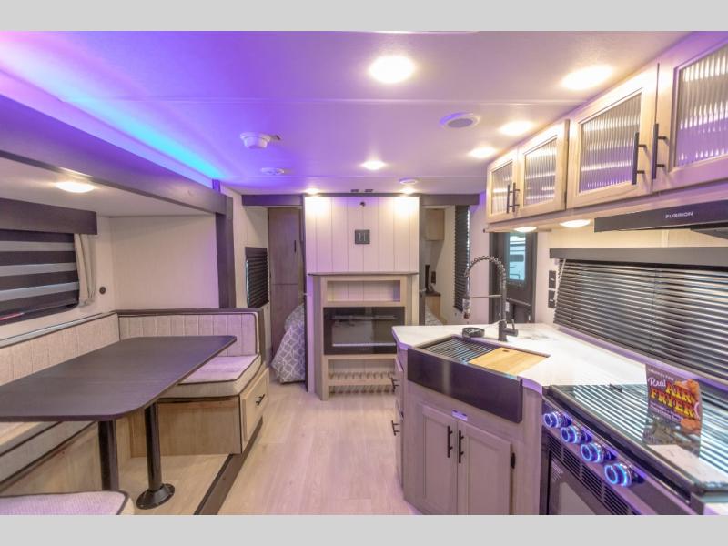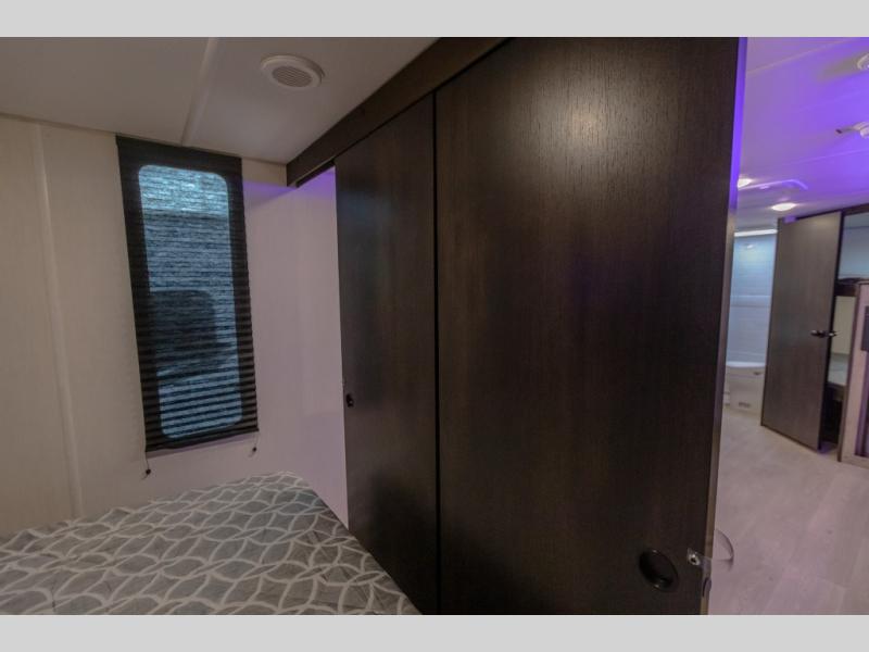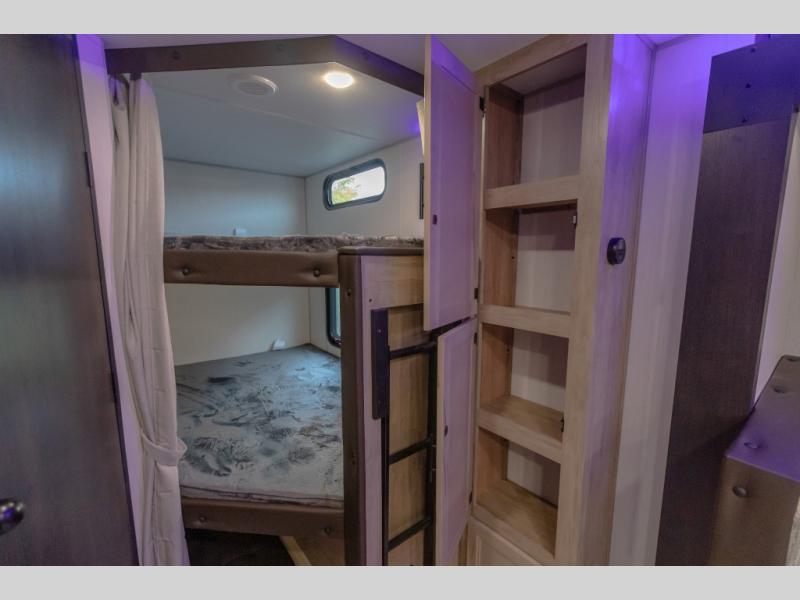 You will love the space provided in this dual entry Cherokee Grey Wolf Black Label travel trailer that has double-size bunks! The rear entry door leads right into the full bath allowing easy access from outside when you need to use the bathroom while you're enjoying the great outdoors. The large U-shaped dinette slide will not only seat everyone comfortably for a meal or a game, but since it also slides out, it opens up the interior even more to give you plenty of space for foot traffic. For all of your outdoor gear, you will find the outside storage compartments handy for stowing away your things when not in use. While the kids enjoy their bunk beds, you will enjoy a good night's rest on the RV king bed with a wardrobe in the front private bedroom!
