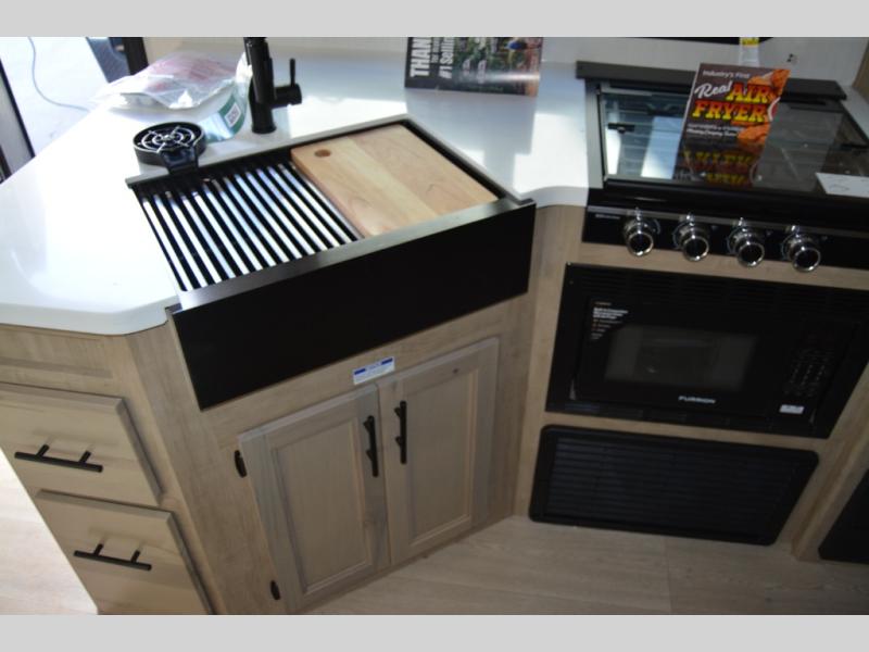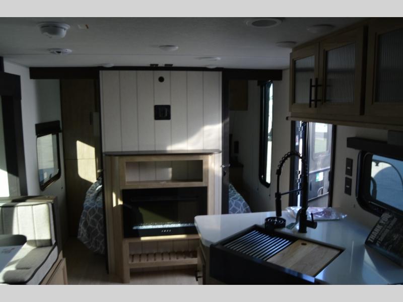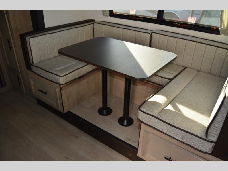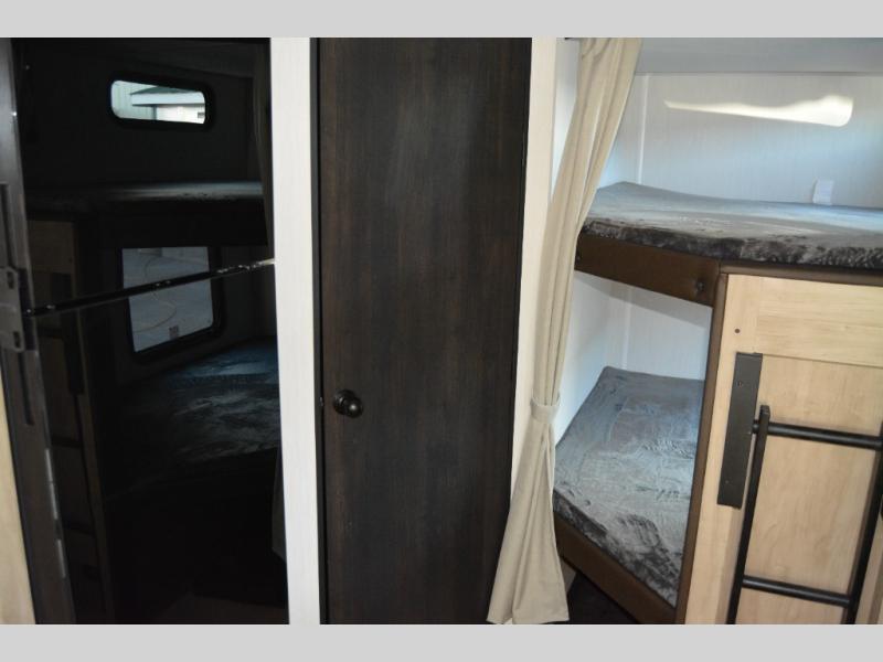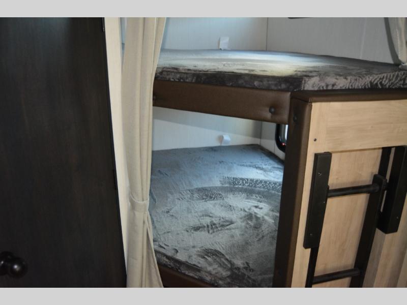 You will love the space provided in this dual entry Cherokee Grey Wolf Black Label travel trailer that has double-size bunks! The rear entry door leads right into the full bath allowing easy access from outside when you need to use the bathroom while you're enjoying the great outdoors. The large U-shaped dinette slide will not only seat everyone comfortably for a meal or a game, but since it also slides out, it opens up the interior even more to give you plenty of space for foot traffic. For all of your outdoor gear, you will find the outside storage compartments handy for stowing away your things when not in use. While the kids enjoy their bunk beds, you will enjoy a good night's rest on the RV king bed with a wardrobe in the front private bedroom!