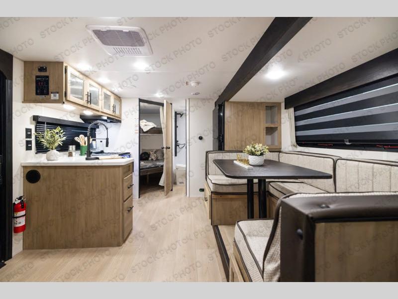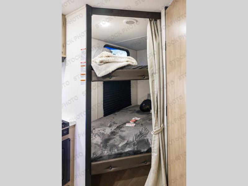 Enjoy time at the campground in this spacious travel trailer with a front private bedroom and double-size bunks for guests! The full interior kitchen and outside kitchen will let you make meals each day, and everyone can dine around the U-shaped dinette or under the 15' awning outside! This unit also includes ample storage space, including hidden shelves behind the fireplace and outside storage!