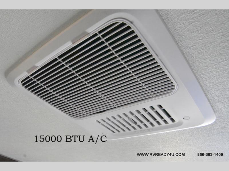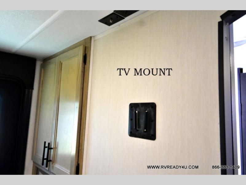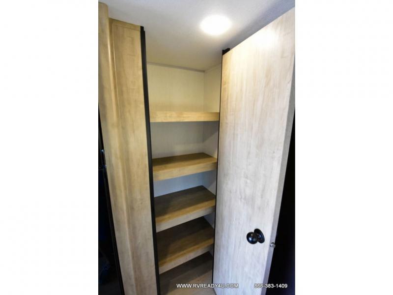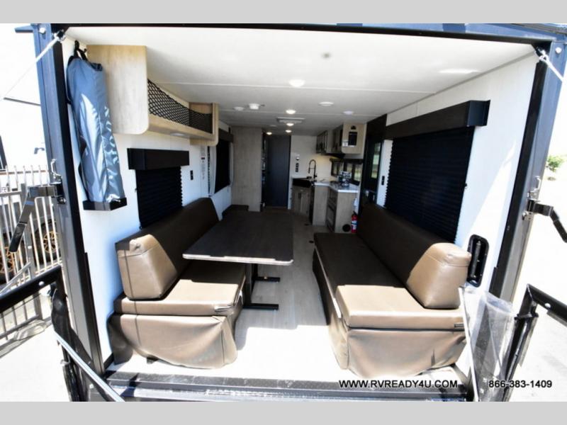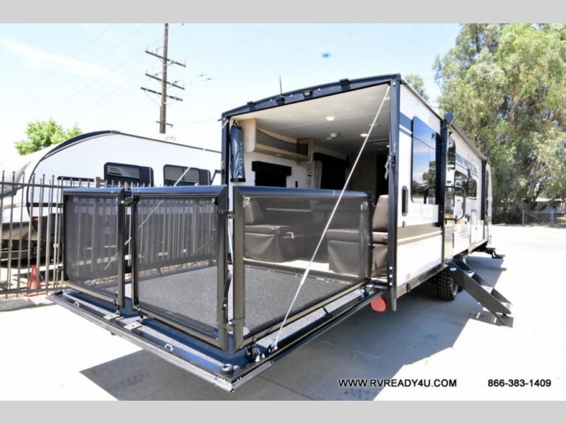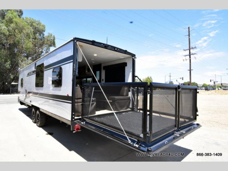 This dual entry toy hauler will allow you to enter in through the main living area or the front master bedroom for convenience! There is a walk-through bath that will be easily accessible for everyone, and there is plenty of storage space for personal belongings. Head to the full kitchen to prepare a home cooked meal, or head outdoors to enjoy the mini kitchen. There is also an outside TV mount if you brought a TV along, and a 15' power awning to provide shade. You can easily unload your toys using the ramp door, then relax on the fold-down sofas with a removable tale.