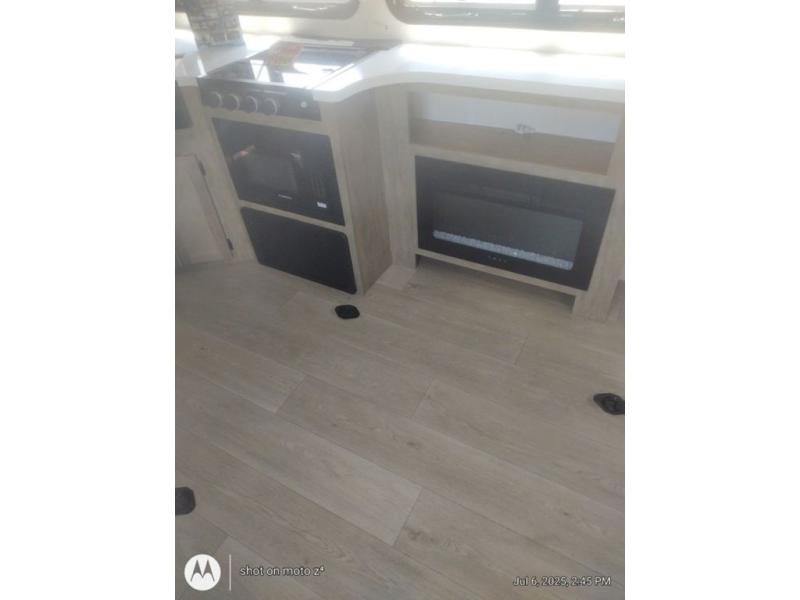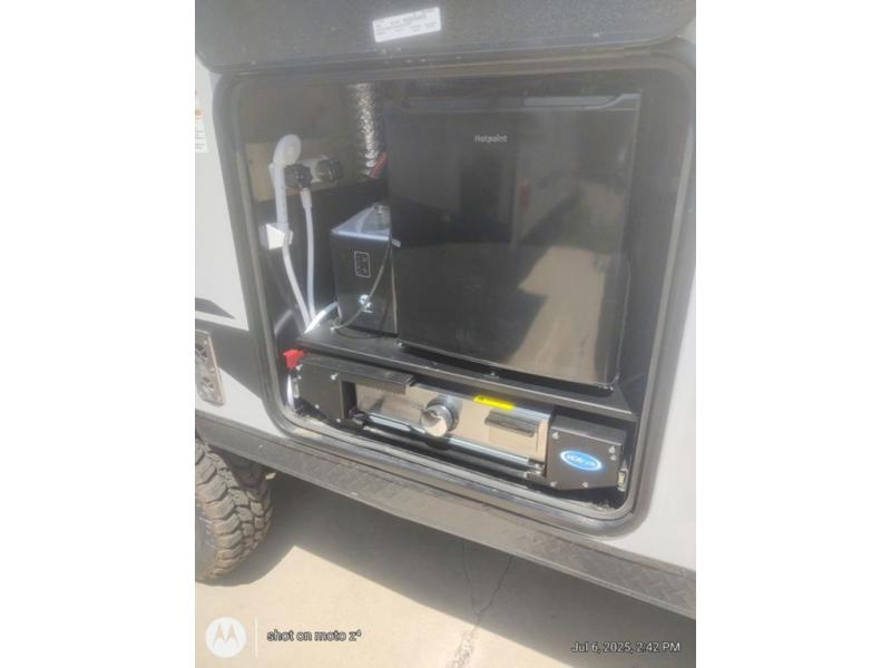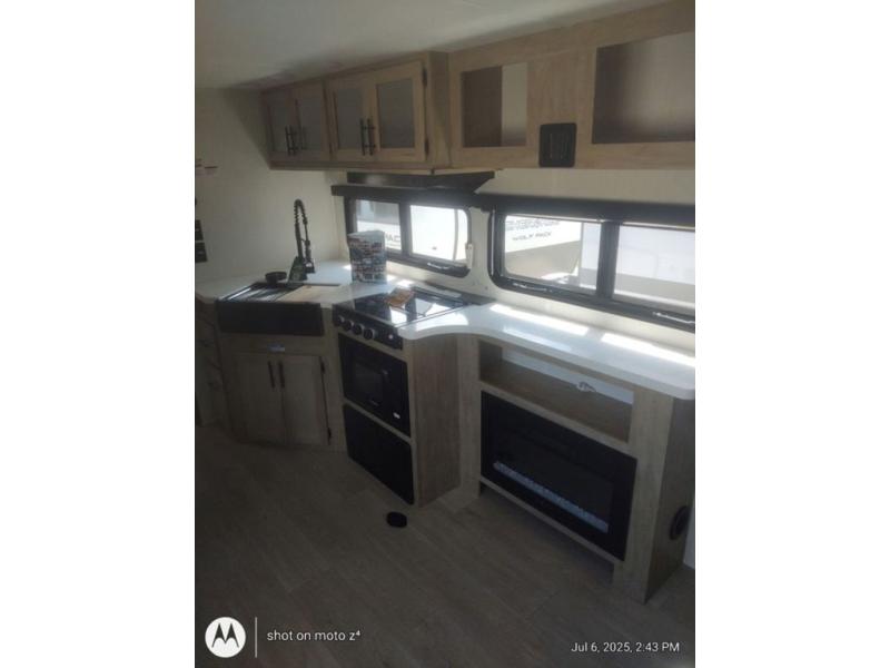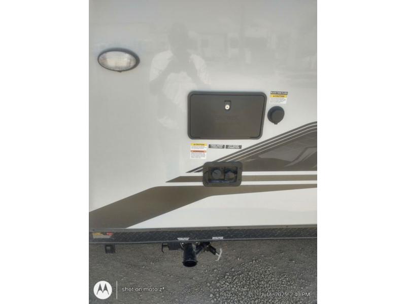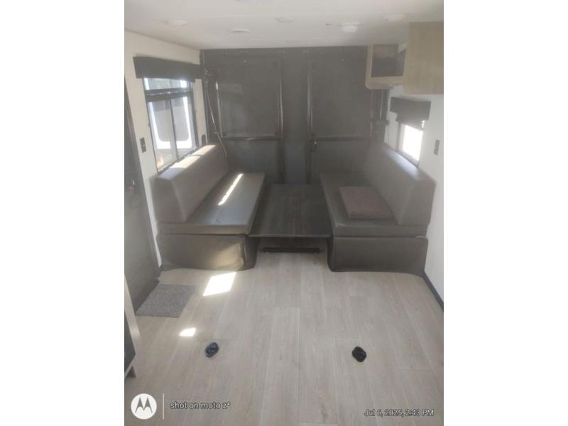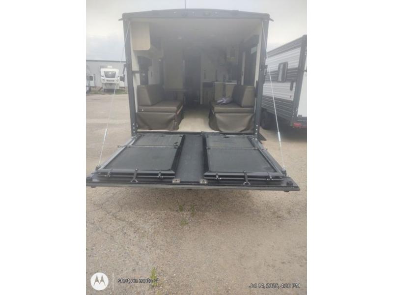 This dual entry toy hauler will allow you to enter in through the main living area or the front master bedroom for convenience! There is a walk-through bath that will be easily accessible for everyone, and there is plenty of storage space for personal belongings. Head to the full kitchen to prepare a home cooked meal, or head outdoors to enjoy the outside kitchen. There is also an outside TV mount if you brought a TV along, and a 15' power awning to provide shade. You can easily unload your toys using the ramp door, then relax on the fold-down sofas with a removable tale.