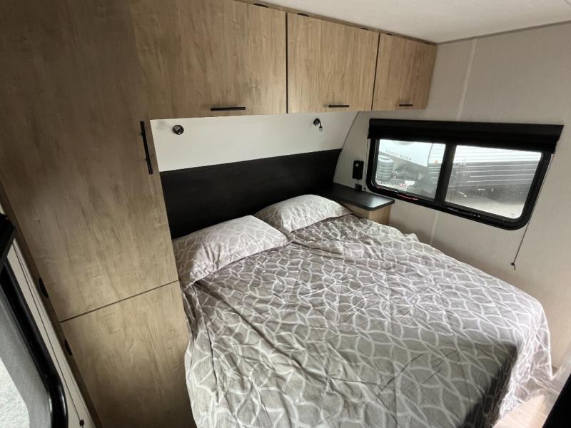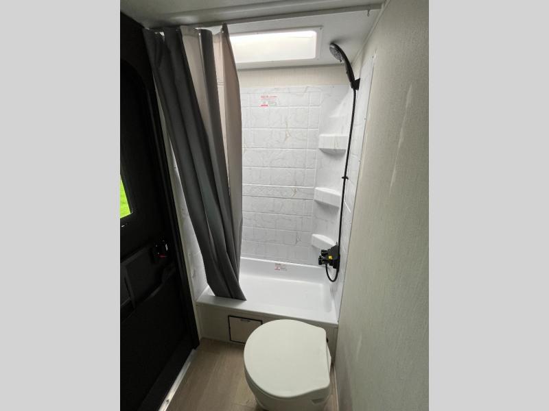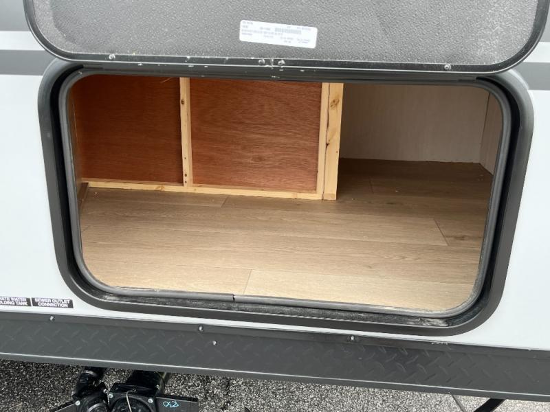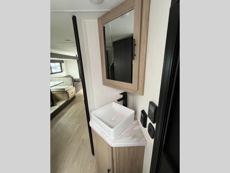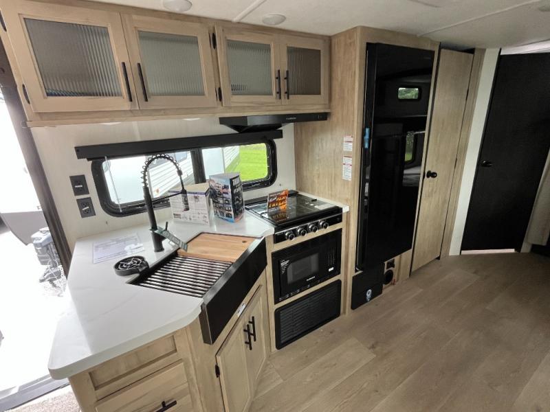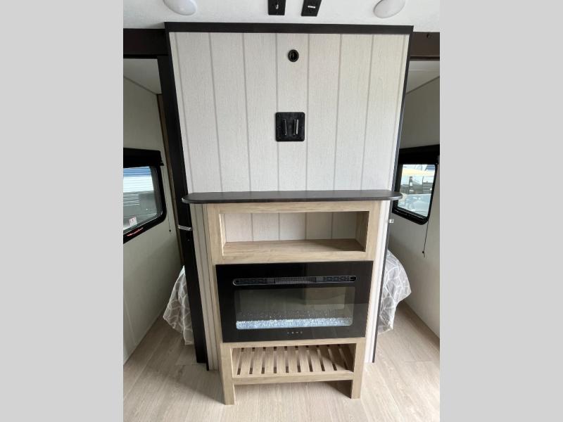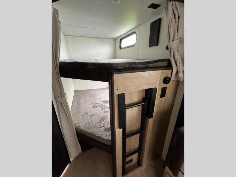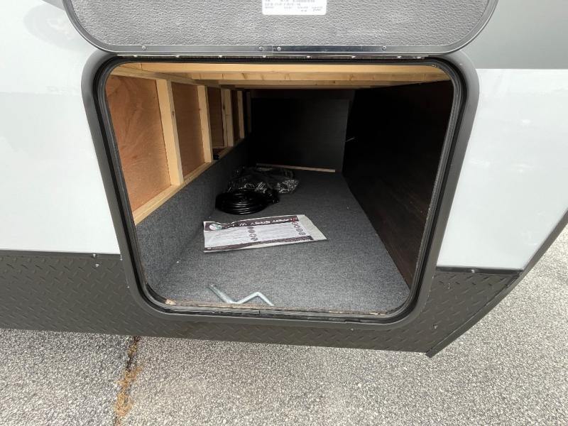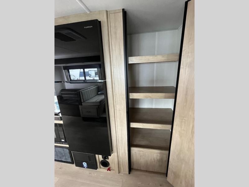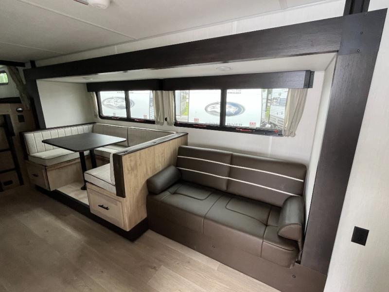 Come on inside this Cherokee Grey Wolf Black Label travel trailer and experience the convenience of a smooth flow of traffic in and out with two entry doors. The rear door leads into a full bath which is great for accessibility when outside and when you need to use the bathroom. Once inside, you will notice the large U-shaped dinette and the sofa which sit on the slide and create a spacious footprint for moving about, as well as great places to play games and socialize with your friends and family. A large pantry provides plenty of storage allowing you to stock up on your favorite snacks and dry goods for your family adventure. At night, there is sleeping space for everyone between the double-size bunks and the RV king bed, plus the furniture.