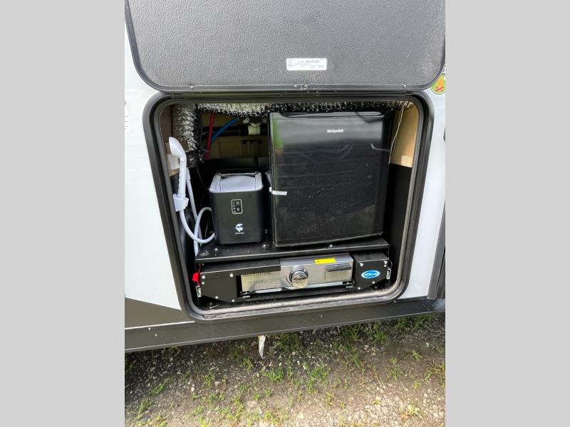 Come on inside this Cherokee Grey Wolf Black Label travel trailer and experience the convenience of a smooth flow of traffic in and out with two entry doors. The rear door leads into a full bath which is great for accessibility when outside and when you need to use the bathroom. Once inside, you will notice the large U-shaped dinette and the sofa which sit on the slide and create a spacious footprint for moving about, as well as great places to play games and socialize with your friends and family. A large pantry provides plenty of storage allowing you to stock up on your favorite snacks and dry goods for your family adventure. At night, there is sleeping space for everyone between the double-size bunks and the RV king bed, plus the furniture.