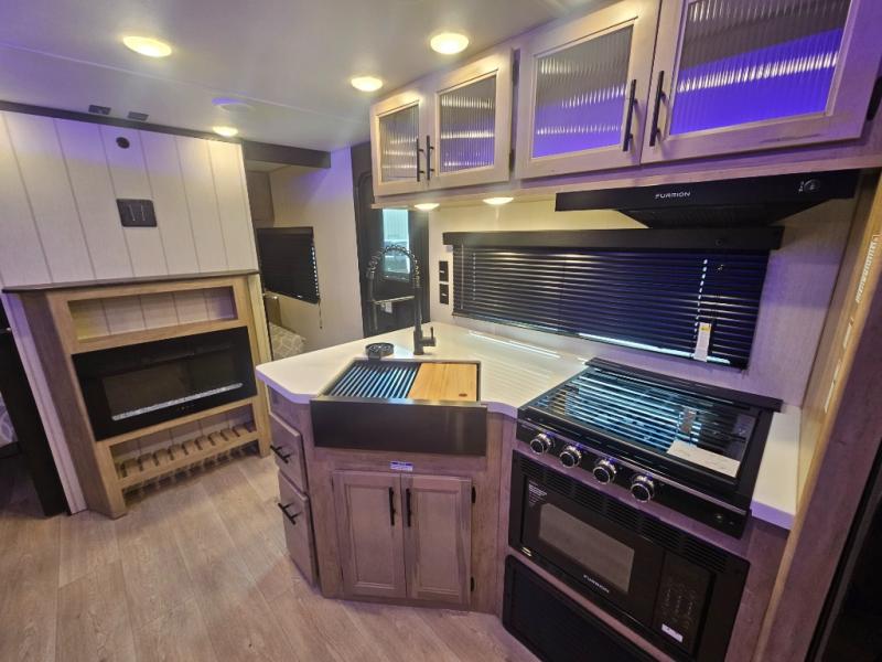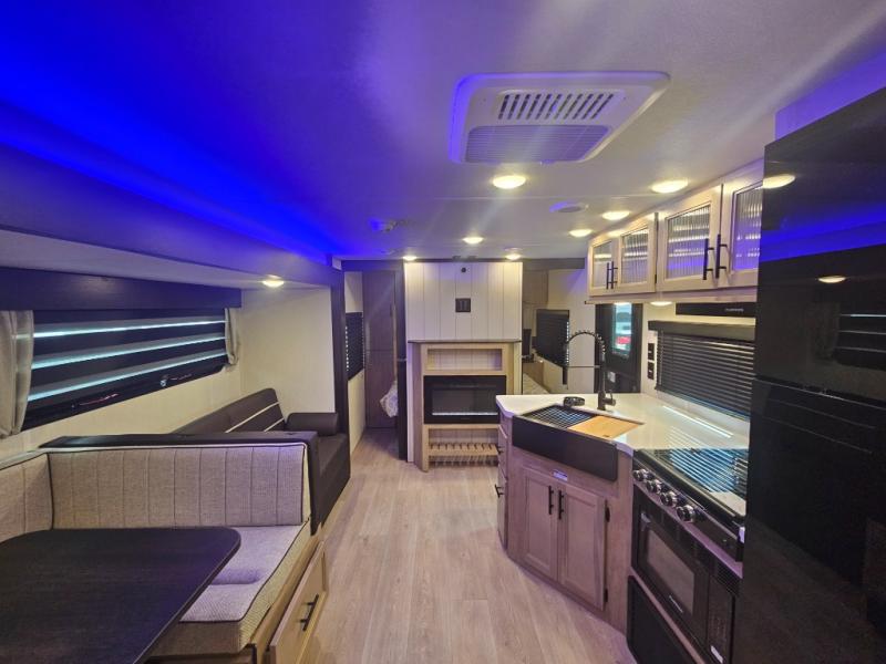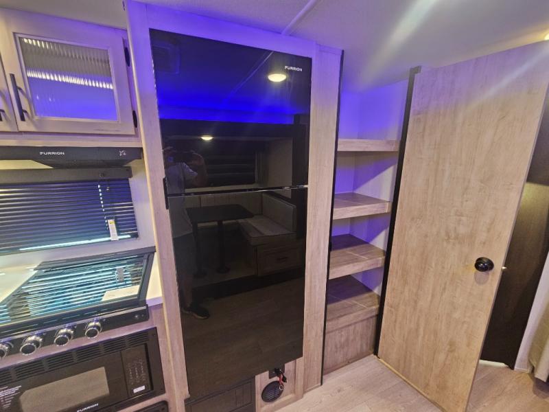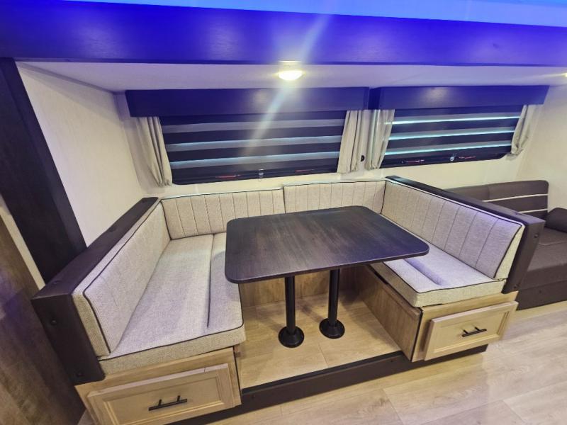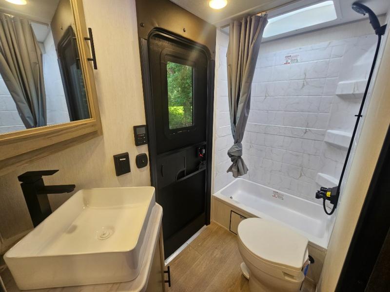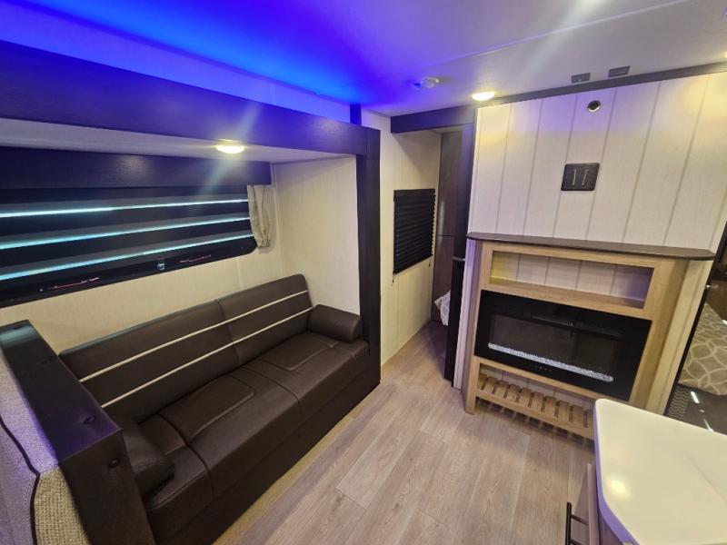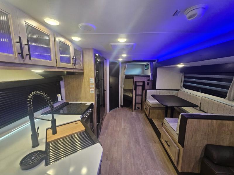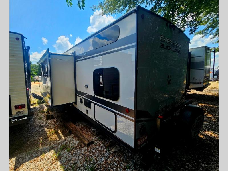 Come on inside this Cherokee Grey Wolf Black Label travel trailer and experience the convenience of a smooth flow of traffic in and out with two entry doors. The rear door leads into a full bath which is great for accessibility when outside and when you need to use the bathroom. Once inside, you will notice the large U-shaped dinette and the sofa which sit on the slide and create a spacious footprint for moving about, as well as great places to play games and socialize with your friends and family. A large pantry provides plenty of storage allowing you to stock up on your favorite snacks and dry goods for your family adventure. At night, there is sleeping space for everyone between the double-size bunks and the RV king bed, plus the furniture.