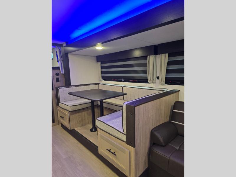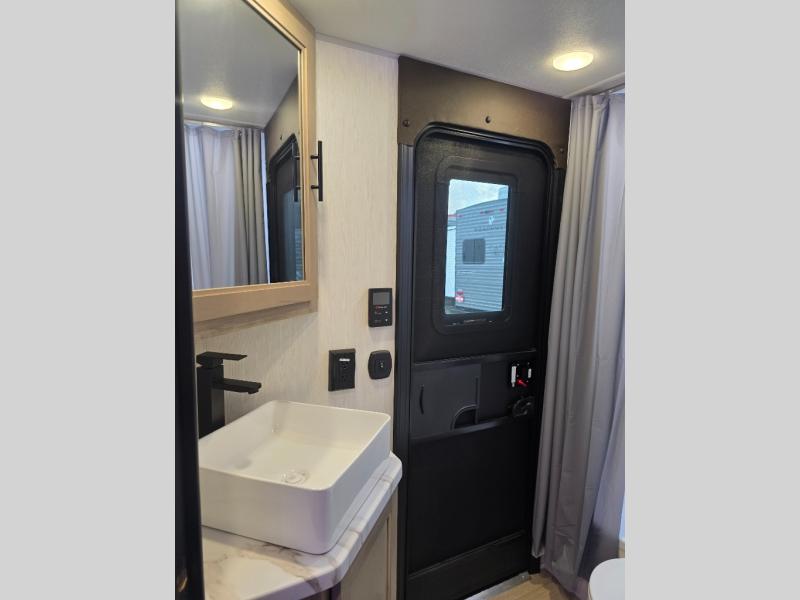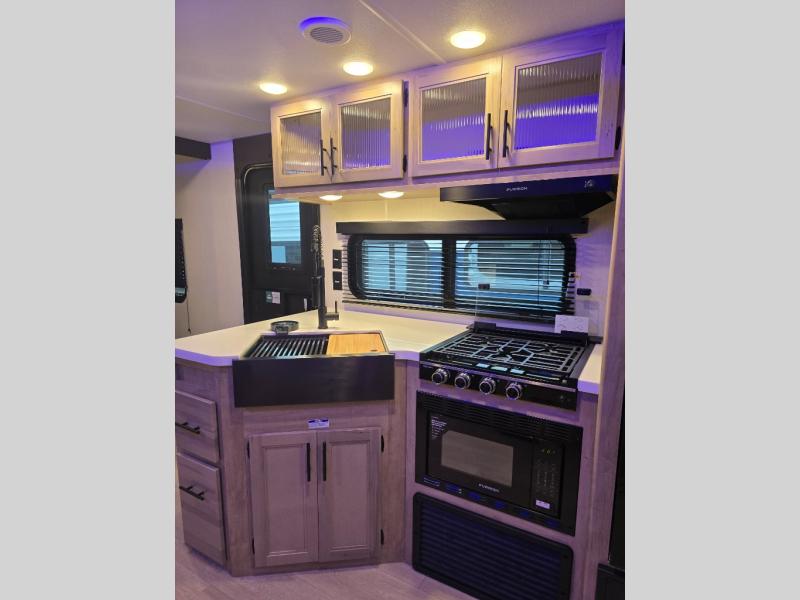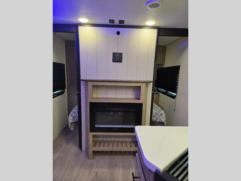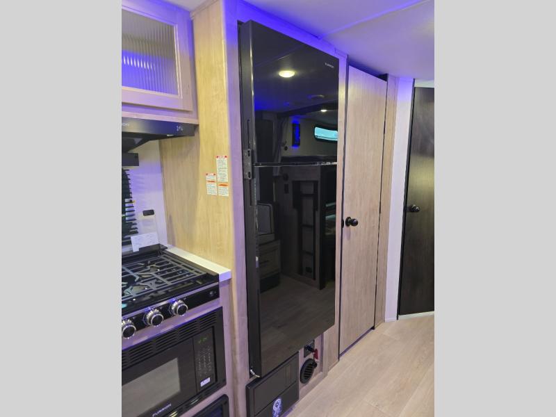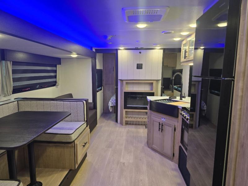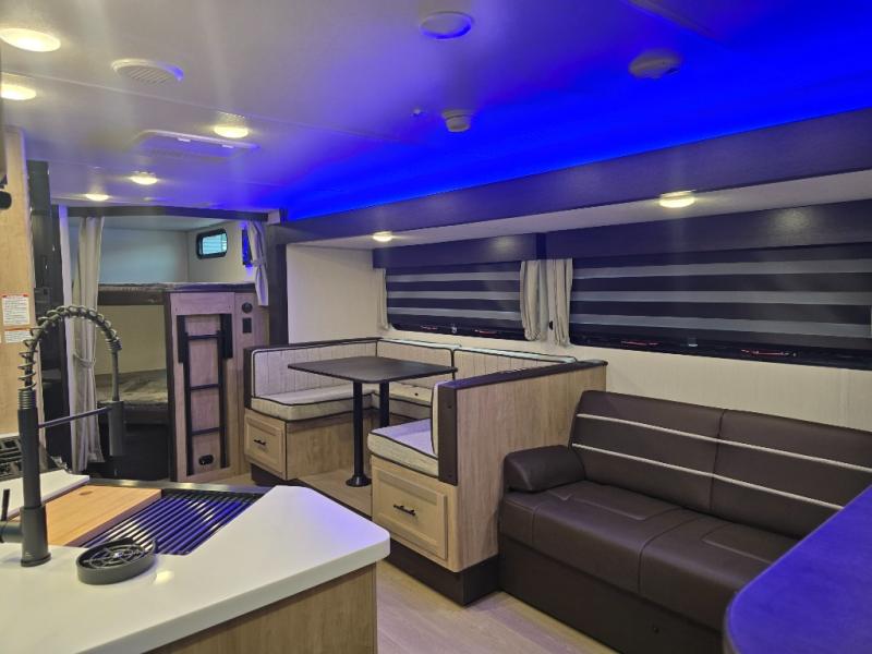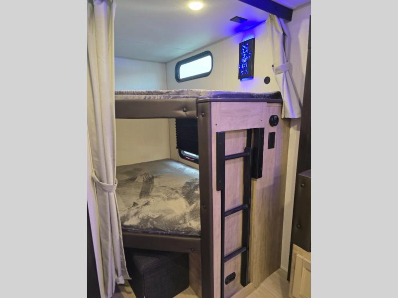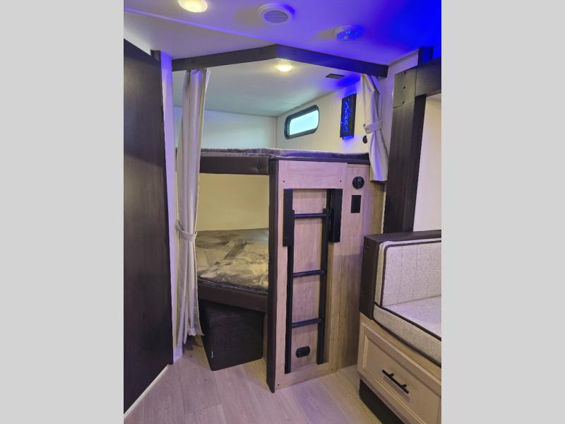 Come on inside this Cherokee Grey Wolf Black Label travel trailer and experience the convenience of a smooth flow of traffic in and out with two entry doors. The rear door leads into a full bath which is great for accessibility when outside and when you need to use the bathroom. Once inside, you will notice the large U-shaped dinette and the sofa which sit on the slide and create a spacious footprint for moving about, as well as great places to play games and socialize with your friends and family. A large pantry provides plenty of storage allowing you to stock up on your favorite snacks and dry goods for your family adventure. At night, there is sleeping space for everyone between the double-size bunks and the RV king bed, plus the furniture.