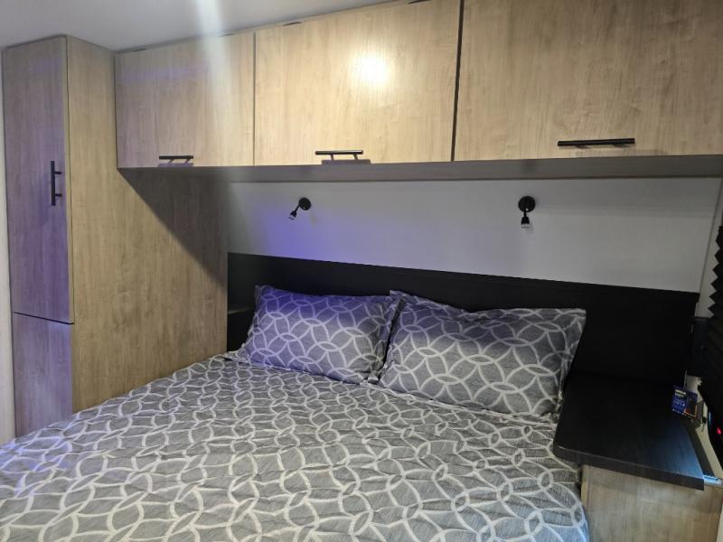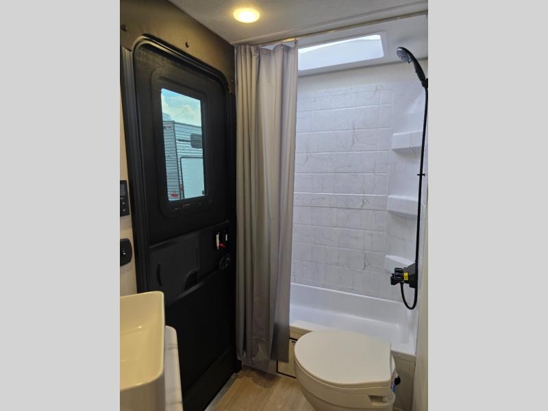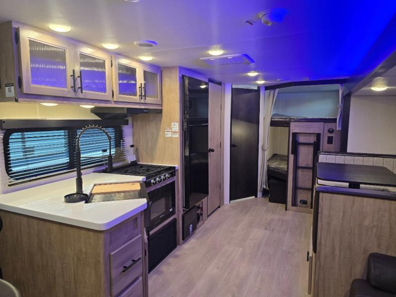 Come on inside this Cherokee Grey Wolf Black Label travel trailer and experience the convenience of a smooth flow of traffic in and out with two entry doors. The rear door leads into a full bath which is great for accessibility when outside and when you need to use the bathroom. Once inside, you will notice the large U-shaped dinette and the sofa which sit on the slide and create a spacious footprint for moving about, as well as great places to play games and socialize with your friends and family. A large pantry provides plenty of storage allowing you to stock up on your favorite snacks and dry goods for your family adventure. At night, there is sleeping space for everyone between the double-size bunks and the RV king bed, plus the furniture.