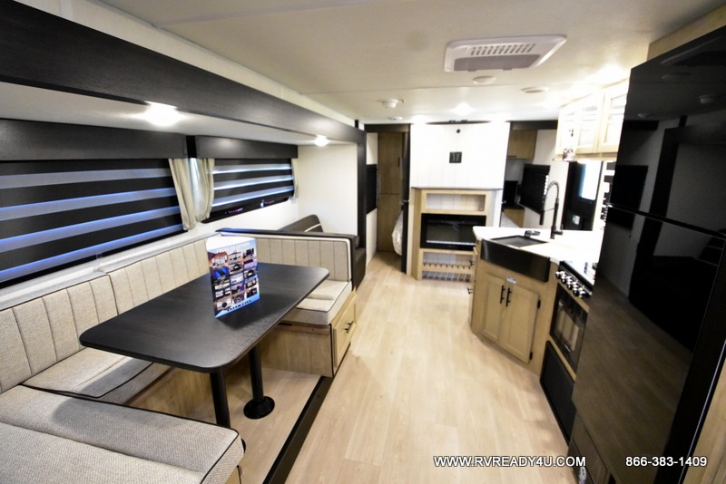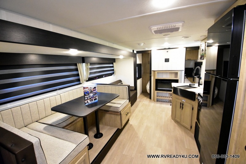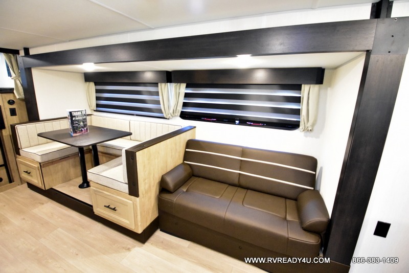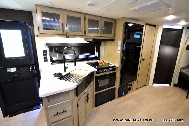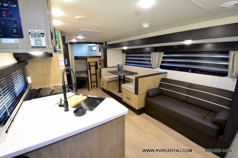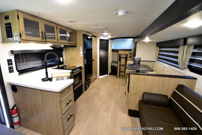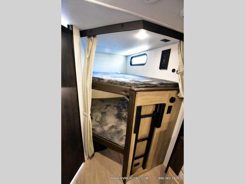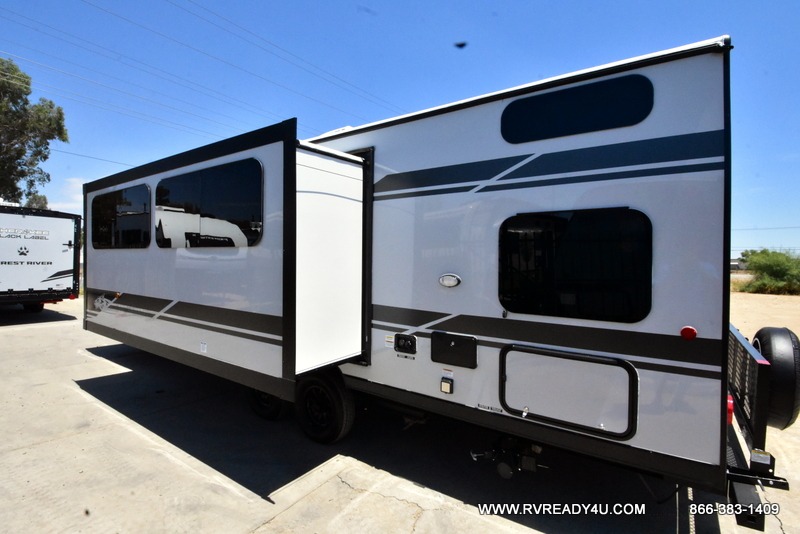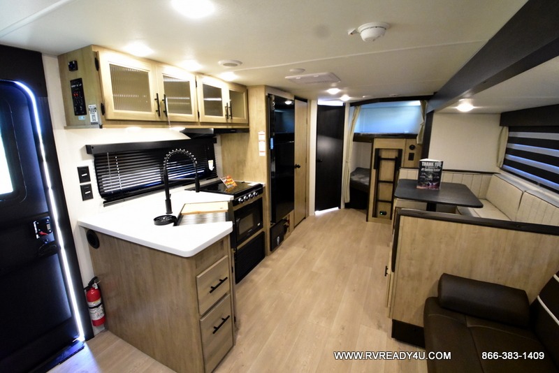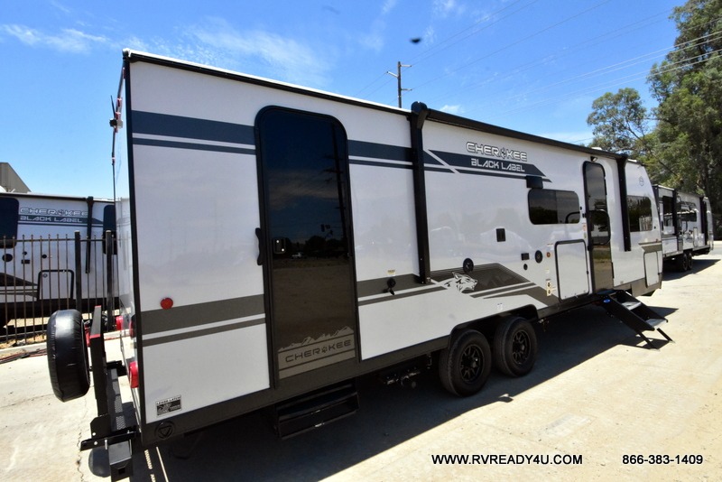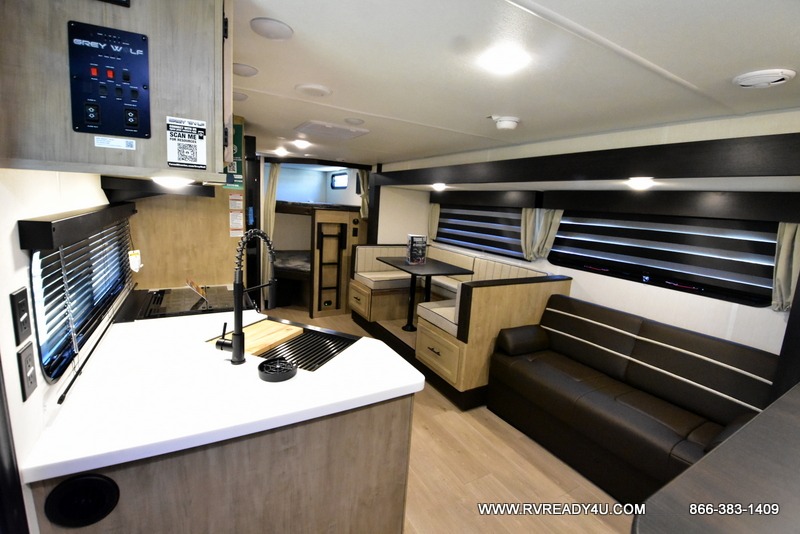 Come on inside this Cherokee Grey Wolf Black Label travel trailer and experience the convenience of a smooth flow of traffic in and out with two entry doors. The rear door leads into a full bath which is great for accessibility when outside and when you need to use the bathroom. Once inside, you will notice the large U-shaped dinette and the sofa which sit on the slide and create a spacious footprint for moving about, as well as great places to play games and socialize with your friends and family. A large pantry provides plenty of storage allowing you to stock up on your favorite snacks and dry goods for your family adventure. At night, there is sleeping space for everyone between the double-size bunks and the RV king bed, plus the furniture.