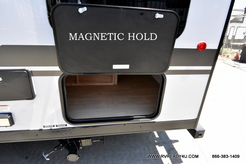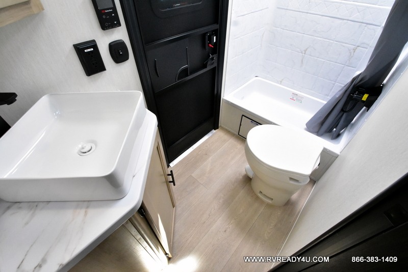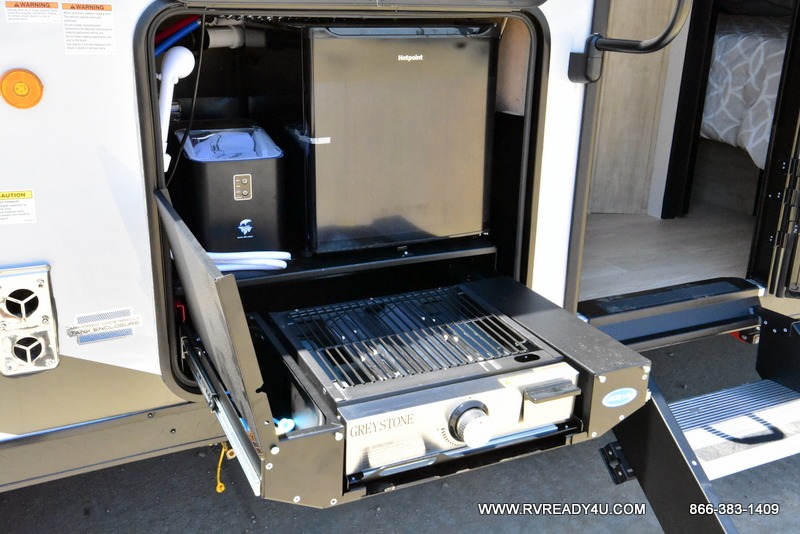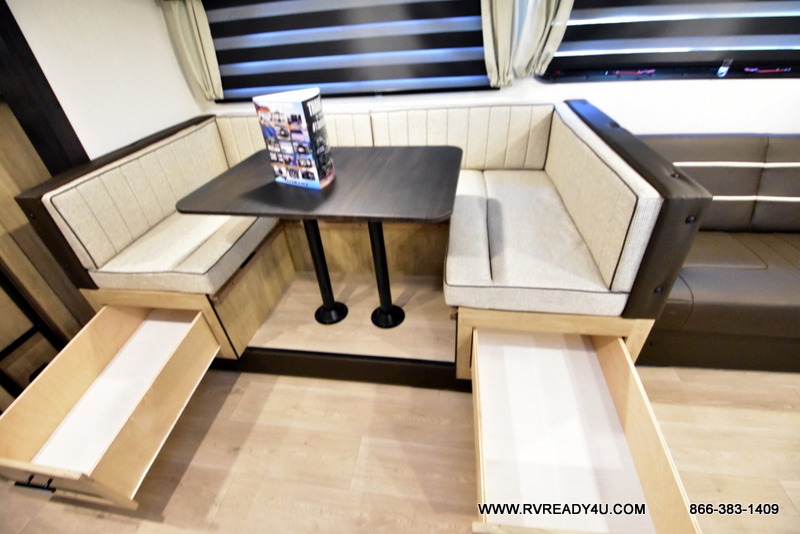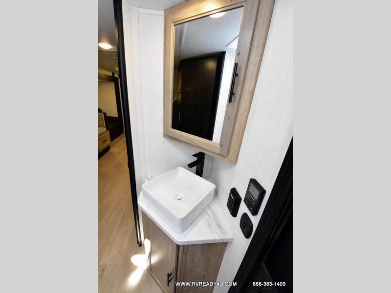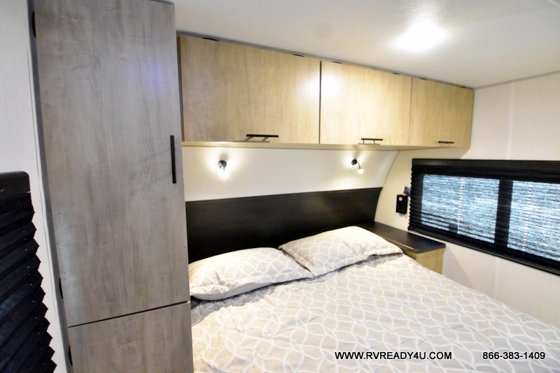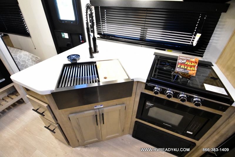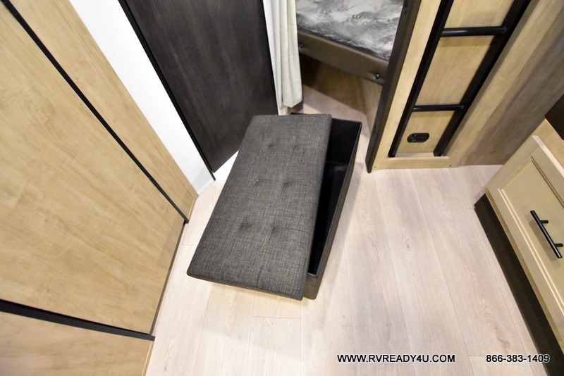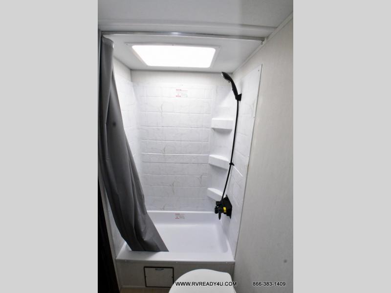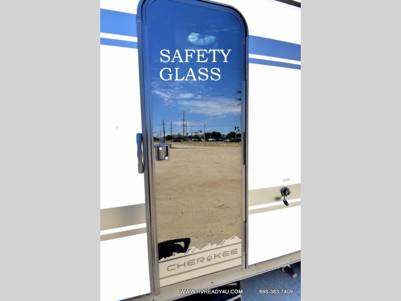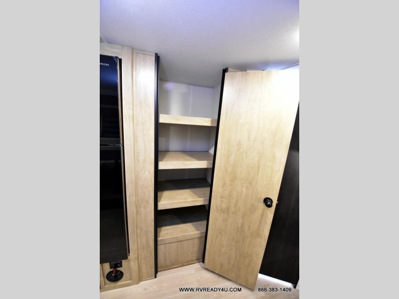Come on inside this Cherokee Grey Wolf Black Label travel trailer and experience the convenience of a smooth flow of traffic in and out with two entry doors. The rear door leads into a full bath which is great for accessibility when outside and when you need to use the bathroom. Once inside, you will notice the large U-shaped dinette and the sofa which sit on the slide and create a spacious footprint for moving about, as well as great places to play games and socialize with your friends and family. A large pantry provides plenty of storage allowing you to stock up on your favorite snacks and dry goods for your family adventure. At night, there is sleeping space for everyone between the double-size bunks and the RV king bed, plus the furniture.