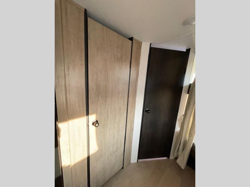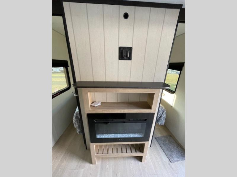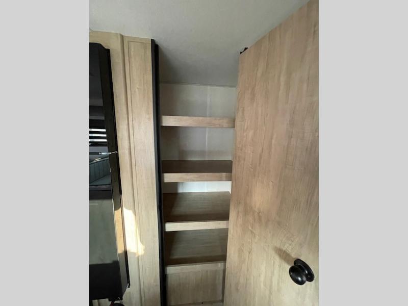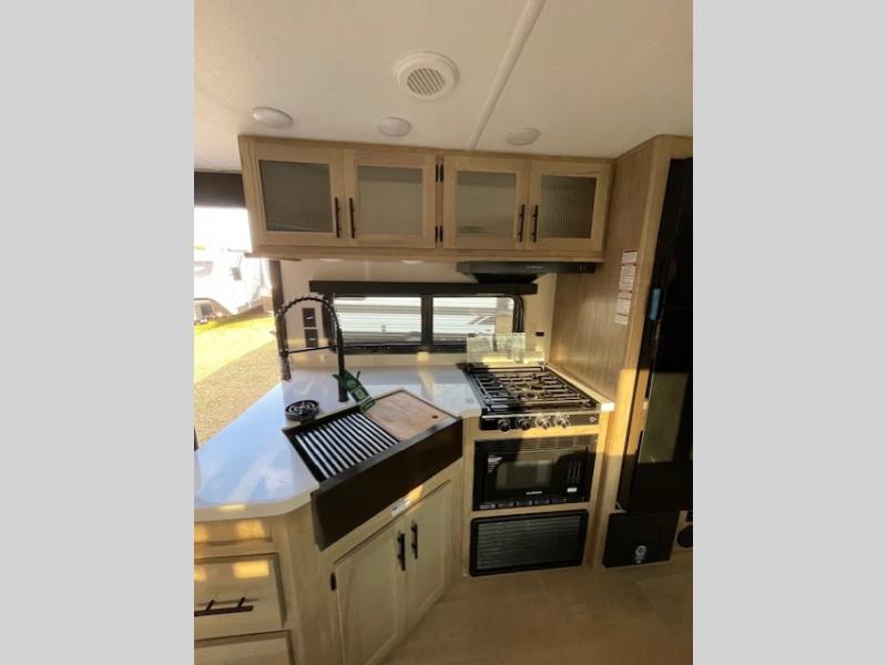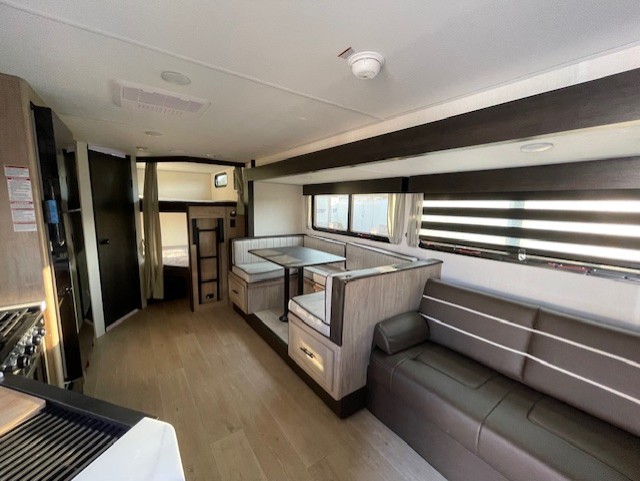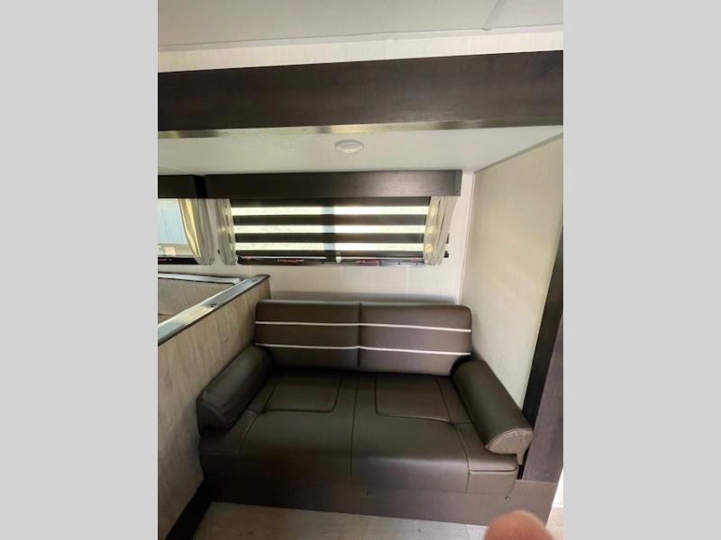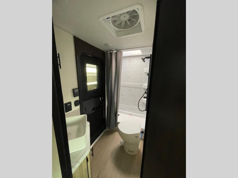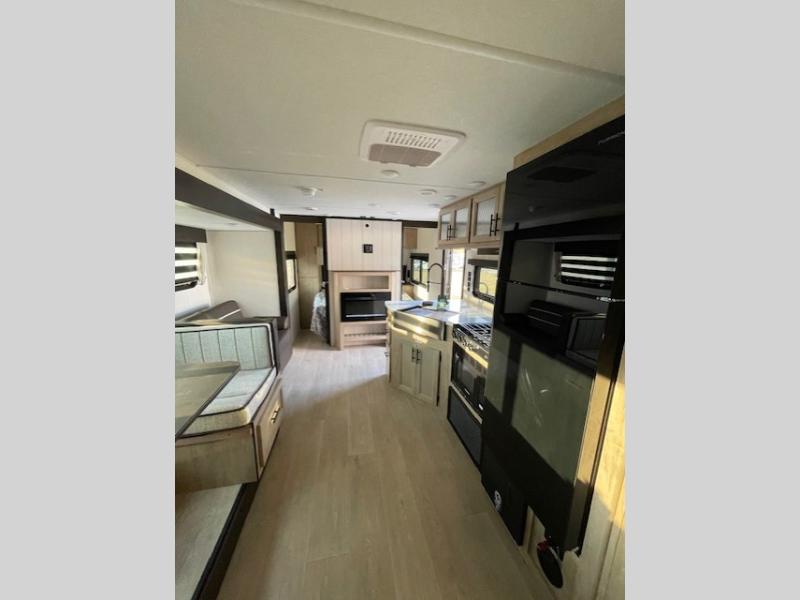 Come on inside this Cherokee Grey Wolf Black Label travel trailer and experience the convenience of a smooth flow of traffic in and out with two entry doors. The rear door leads into a full bath which is great for accessibility when outside and when you need to use the bathroom. Once inside, you will notice the large U-shaped dinette and the sofa which sit on the slide and create a spacious footprint for moving about, as well as great places to play games and socialize with your friends and family. A large pantry provides plenty of storage allowing you to stock up on your favorite snacks and dry goods for your family adventure. At night, there is sleeping space for everyone between the double-size bunks and the RV king bed, plus the furniture.