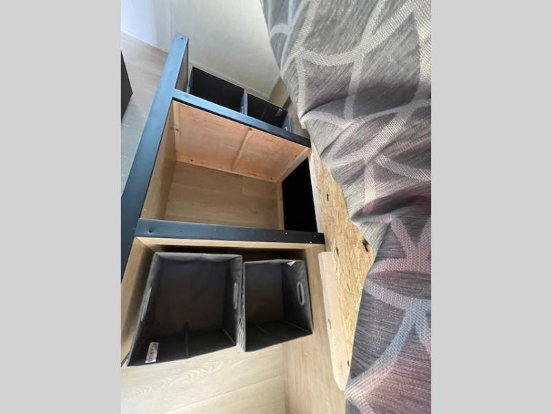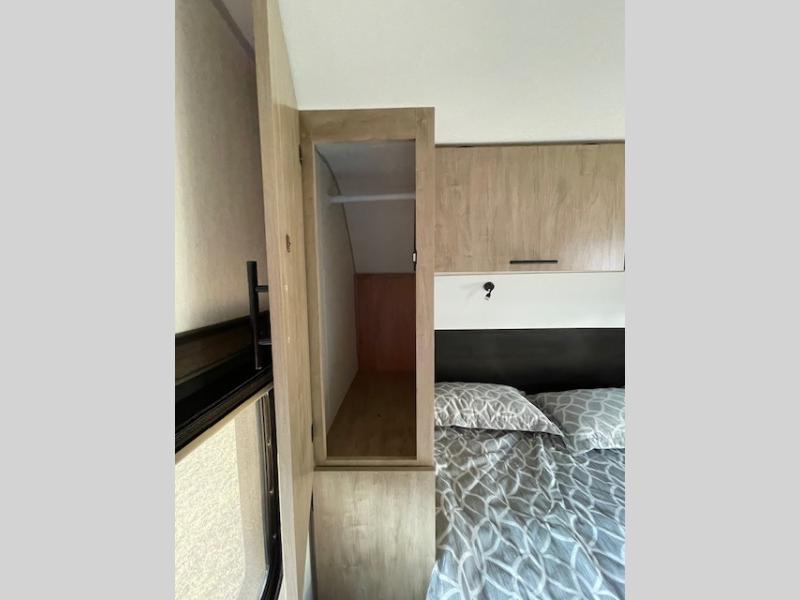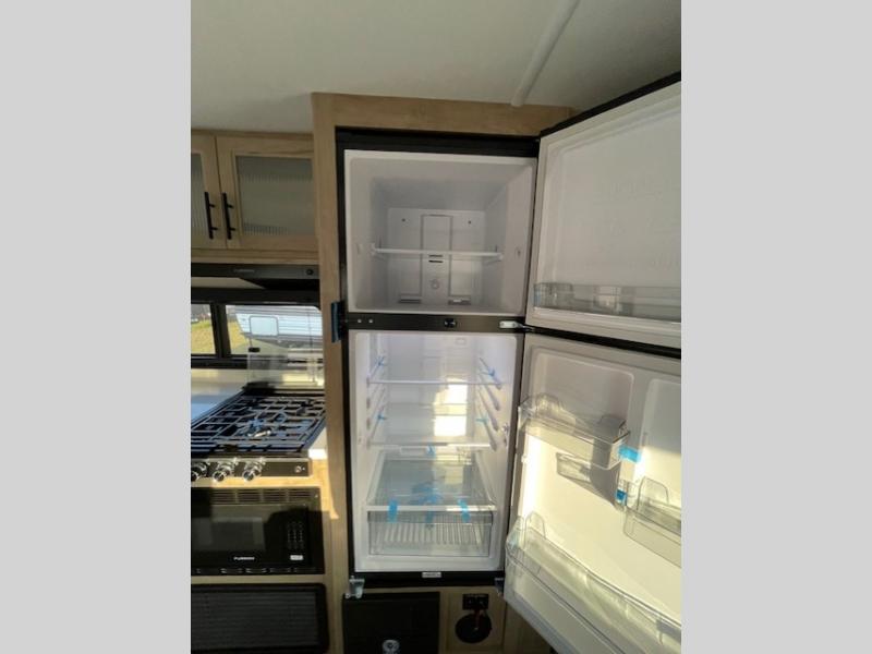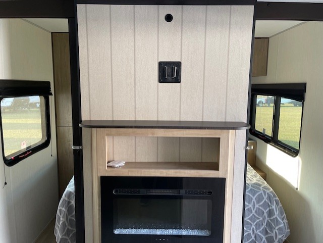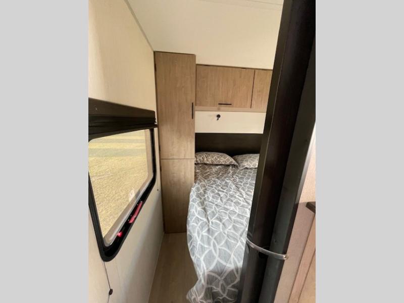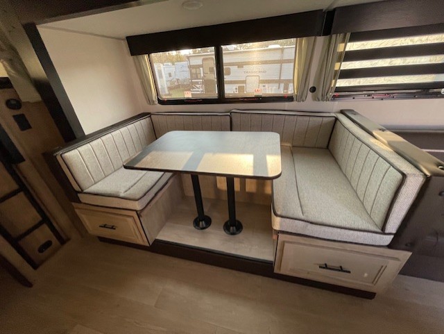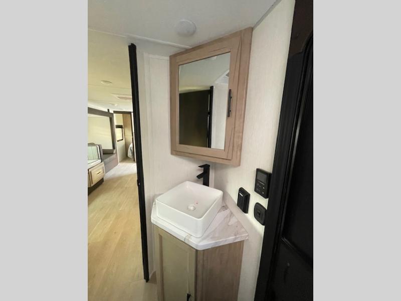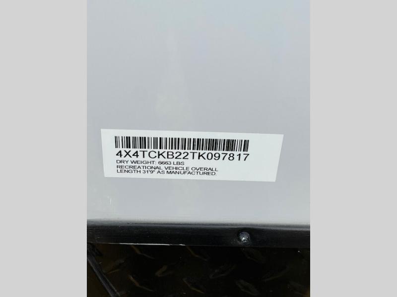 Come on inside this Cherokee Grey Wolf Black Label travel trailer and experience the convenience of a smooth flow of traffic in and out with two entry doors. The rear door leads into a full bath which is great for accessibility when outside and when you need to use the bathroom. Once inside, you will notice the large U-shaped dinette and the sofa which sit on the slide and create a spacious footprint for moving about, as well as great places to play games and socialize with your friends and family. A large pantry provides plenty of storage allowing you to stock up on your favorite snacks and dry goods for your family adventure. At night, there is sleeping space for everyone between the double-size bunks and the RV king bed, plus the furniture.