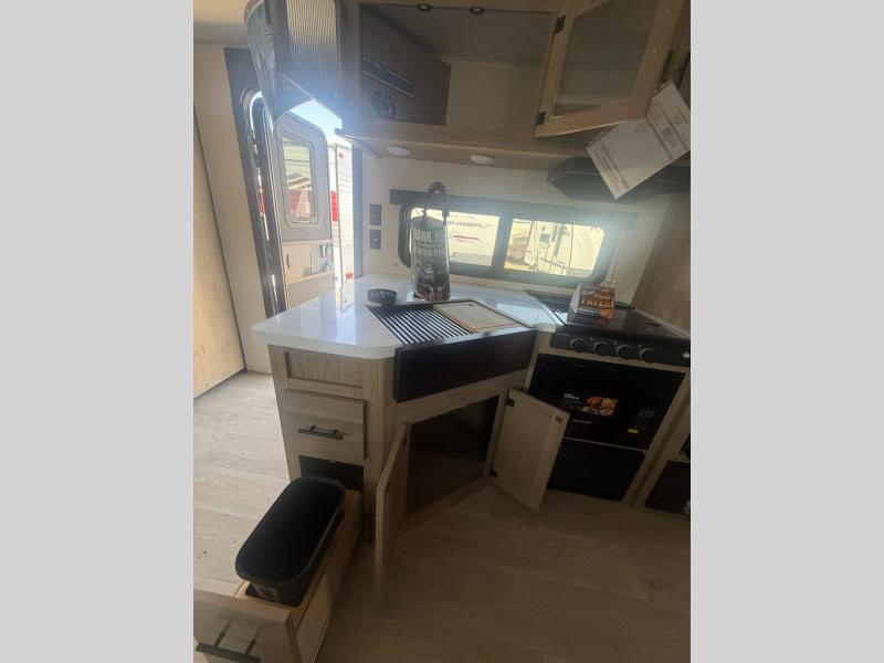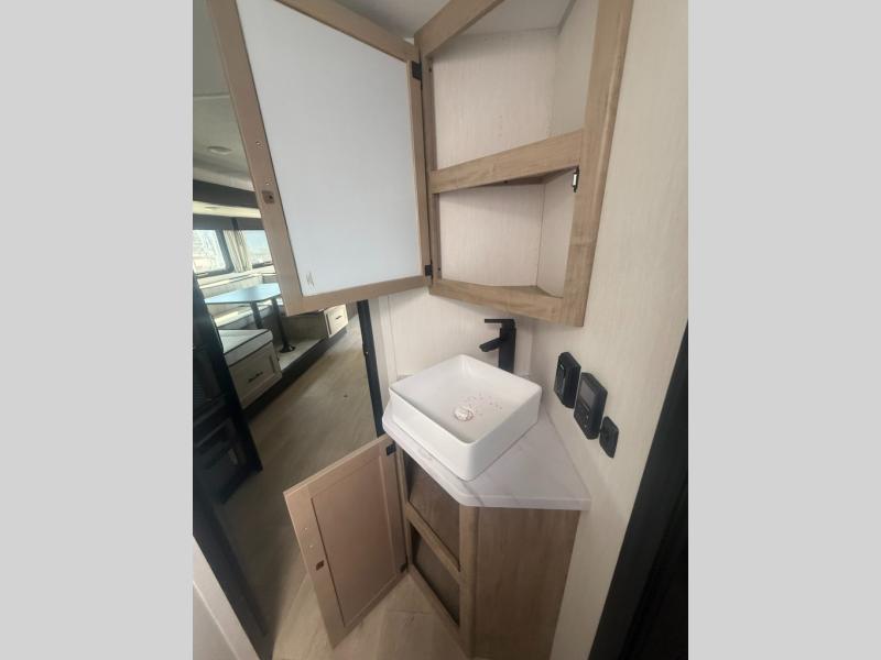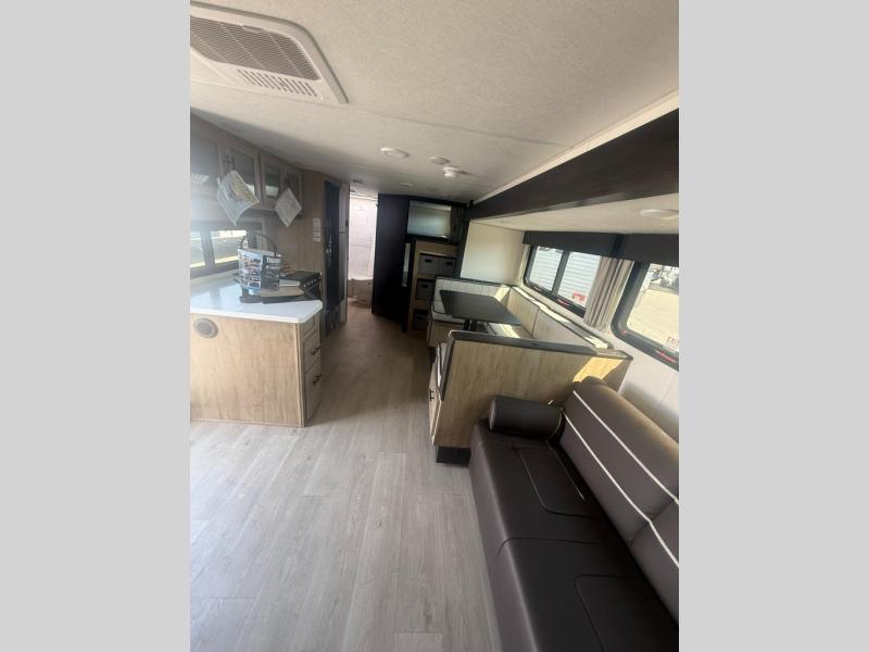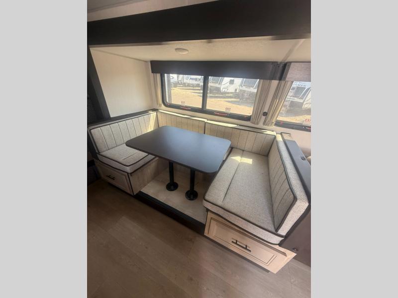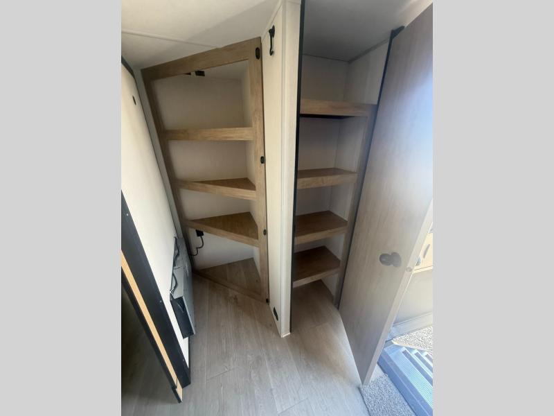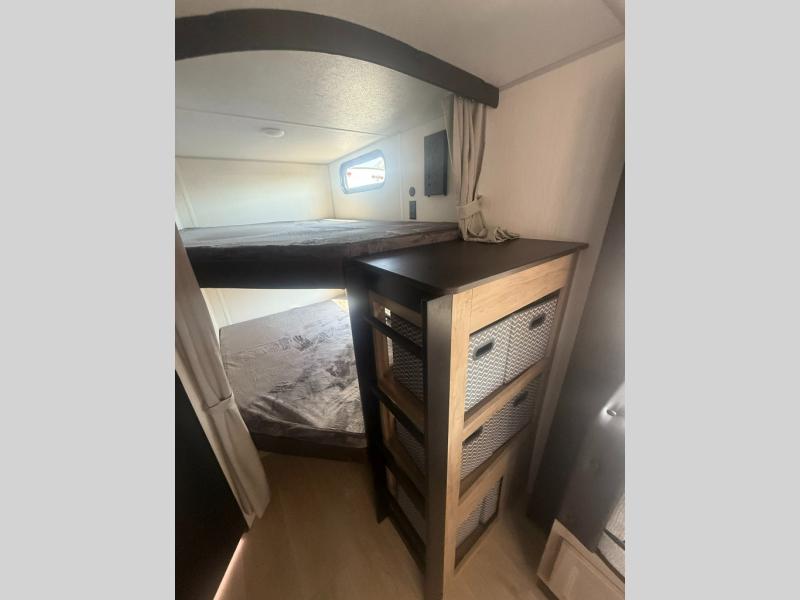 If you've been searching for a travel trailer with a larger sleeping capacity to camp with friends, this is the one! There are double-size bunks in the rear corner, and the full bath with its own exterior entry door is in the other rear corner for easy nighttime use. Up front, an RV king bed in the private bedroom is sure to bring a great night's rest, and you'll find a bedside wardrobe to keep your clothes picked up off of the floor. In the morning, everyone can meet in the main living room that includes a large slide out, U-shaped dinette, sofa, and a fireplace with a hidden pantry behind it for smart storage solutions. An outside kitchen will allow you to get some fresh air as you make dinner, but there's also a full interior kitchen if the weather isn't cooperating. Additional outdoor features include a rear storage rack, an outside TV mount, and a 15' awning for some shade!
