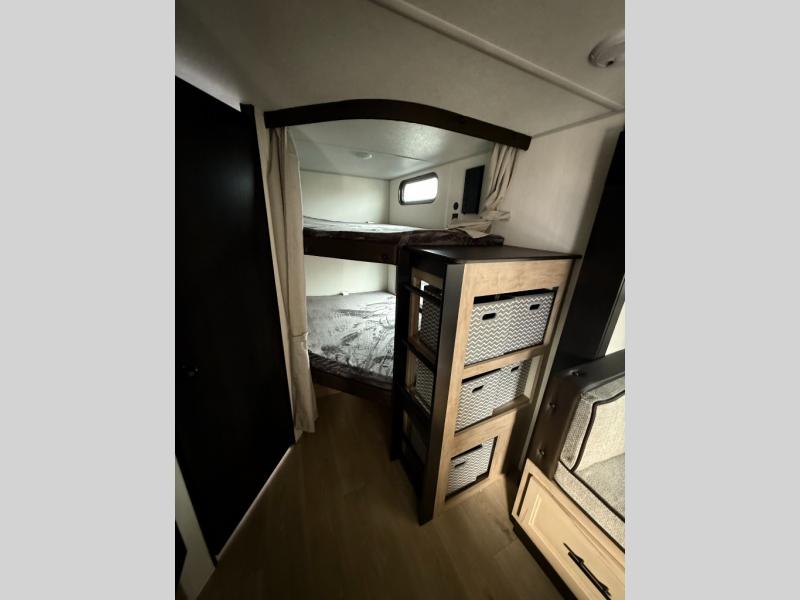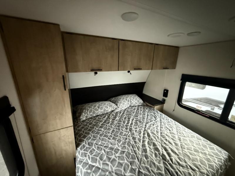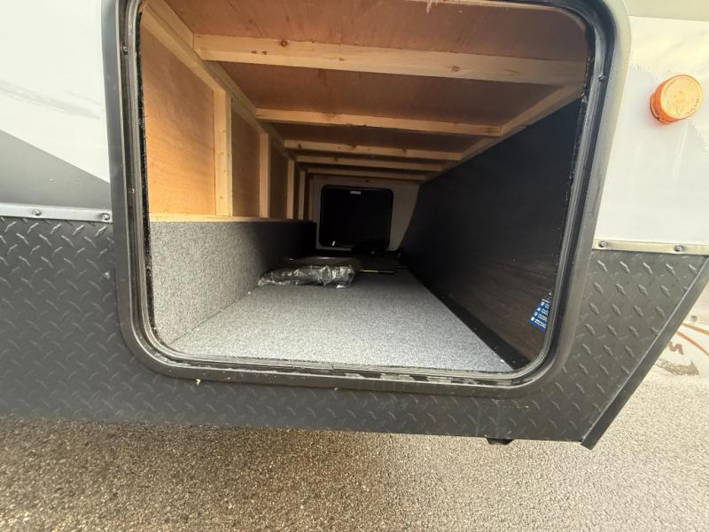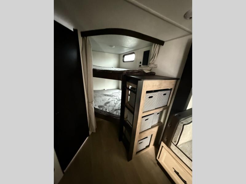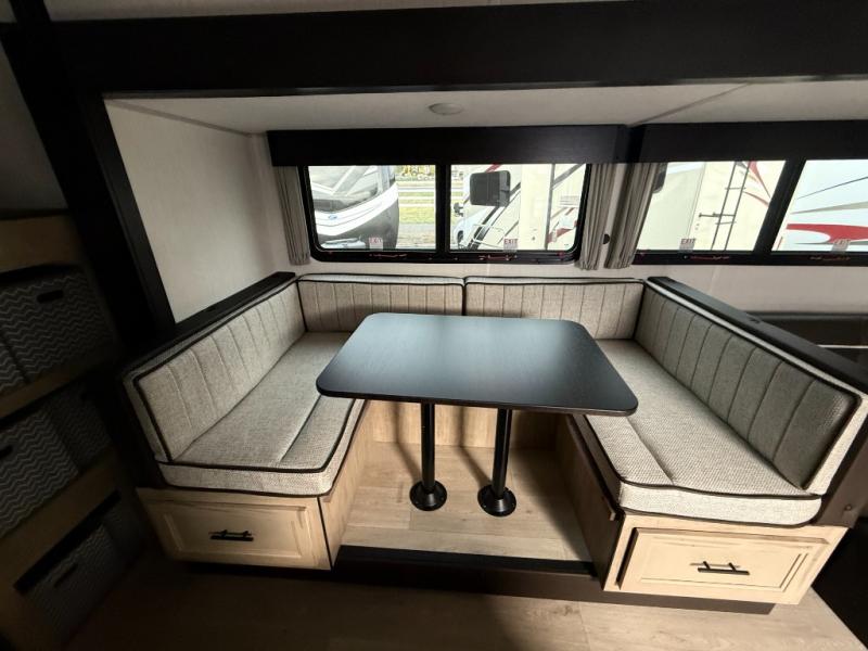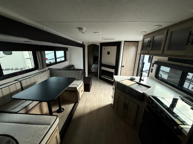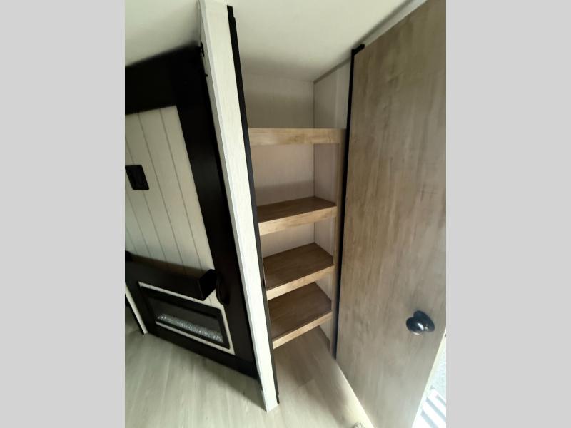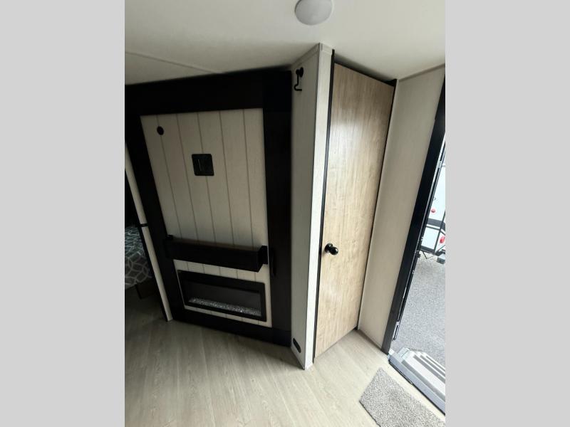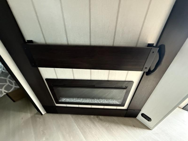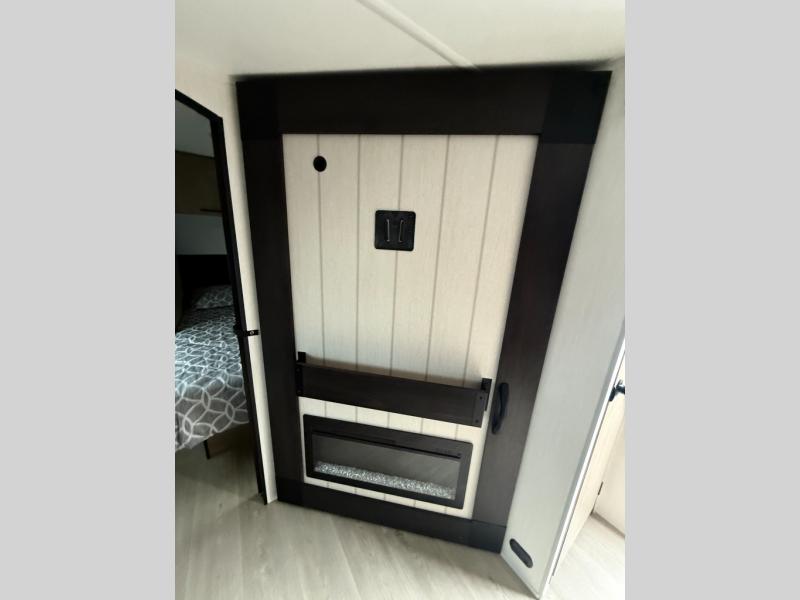 If you've been searching for a travel trailer with a larger sleeping capacity to camp with friends, this is the one! There are double-size bunks in the rear corner, and the full bath with its own exterior entry door is in the other rear corner for easy nighttime use. Up front, an RV king bed in the private bedroom is sure to bring a great night's rest, and you'll find a bedside wardrobe to keep your clothes picked up off of the floor. In the morning, everyone can meet in the main living room that includes a large slide out, U-shaped dinette, sofa, and a fireplace with a hidden pantry behind it for smart storage solutions. An outside kitchen will allow you to get some fresh air as you make dinner, but there's also a full interior kitchen if the weather isn't cooperating. Additional outdoor features include a rear storage rack, an outside TV mount, and a 15' awning for some shade!