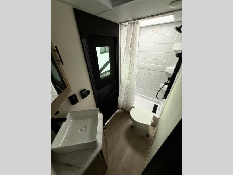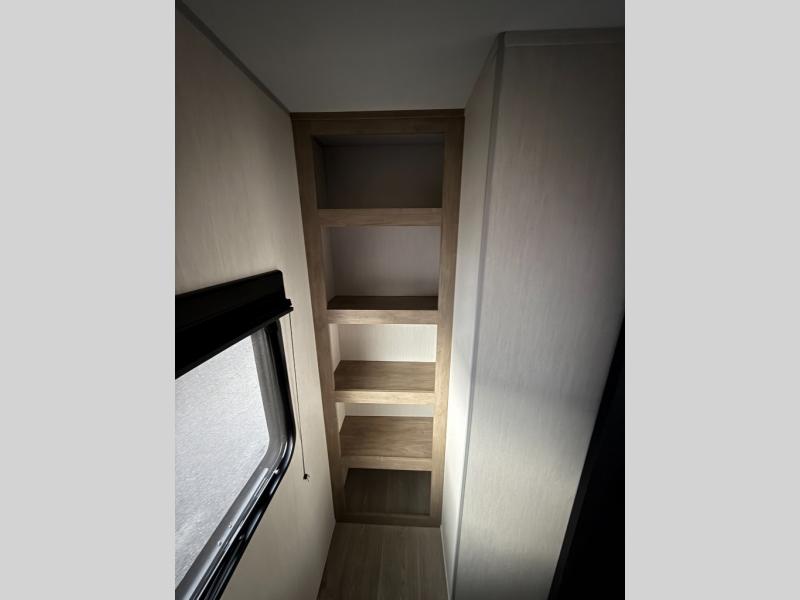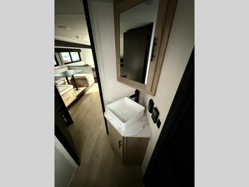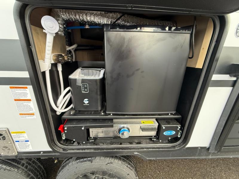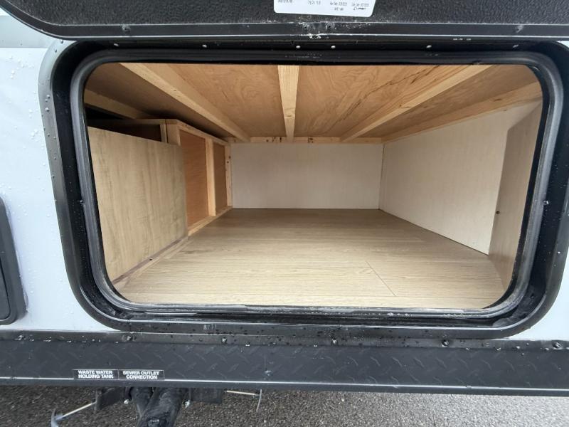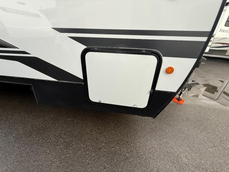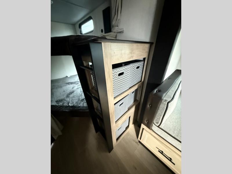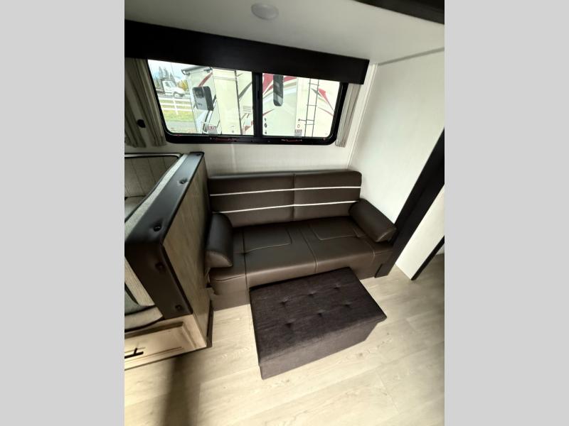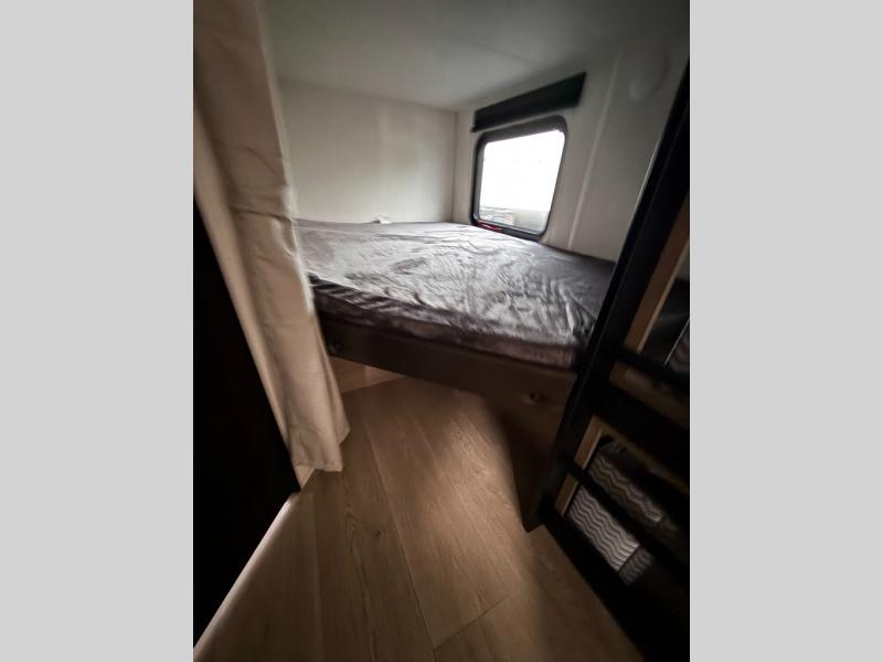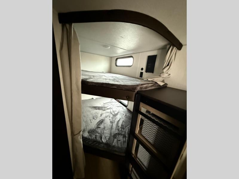 If you've been searching for a travel trailer with a larger sleeping capacity to camp with friends, this is the one! There are double-size bunks in the rear corner, and the full bath with its own exterior entry door is in the other rear corner for easy nighttime use. Up front, an RV king bed in the private bedroom is sure to bring a great night's rest, and you'll find a bedside wardrobe to keep your clothes picked up off of the floor. In the morning, everyone can meet in the main living room that includes a large slide out, U-shaped dinette, sofa, and a fireplace with a hidden pantry behind it for smart storage solutions. An outside kitchen will allow you to get some fresh air as you make dinner, but there's also a full interior kitchen if the weather isn't cooperating. Additional outdoor features include a rear storage rack, an outside TV mount, and a 15' awning for some shade!