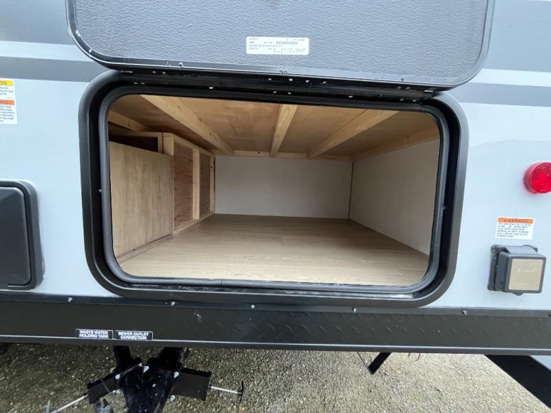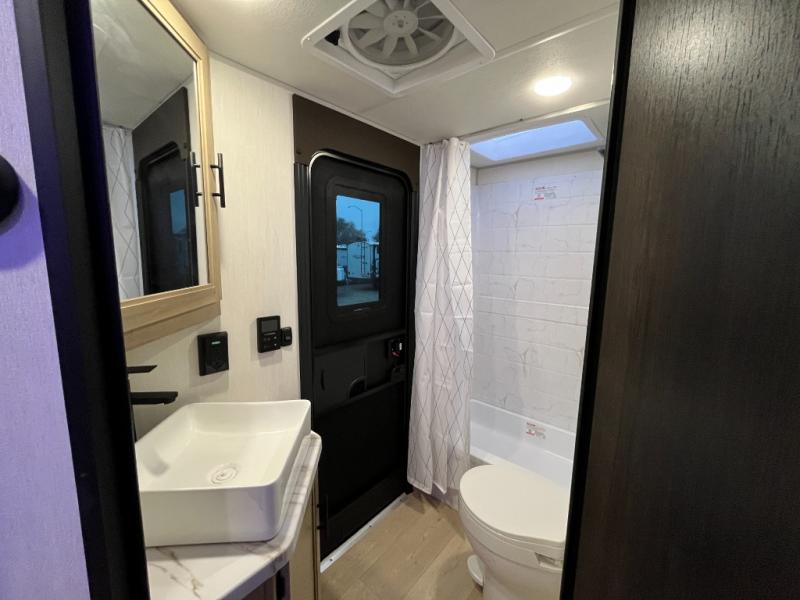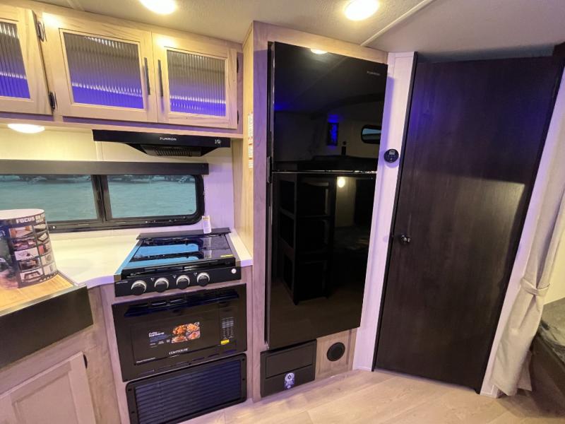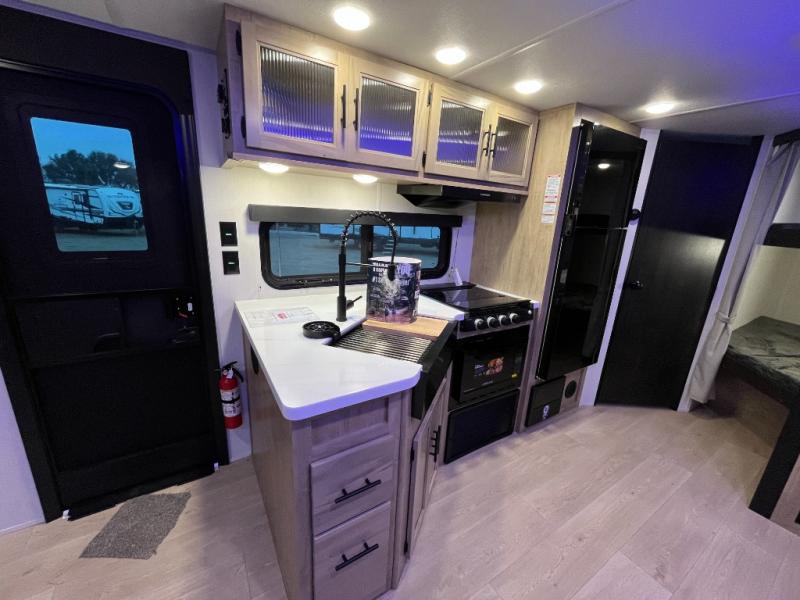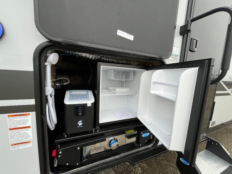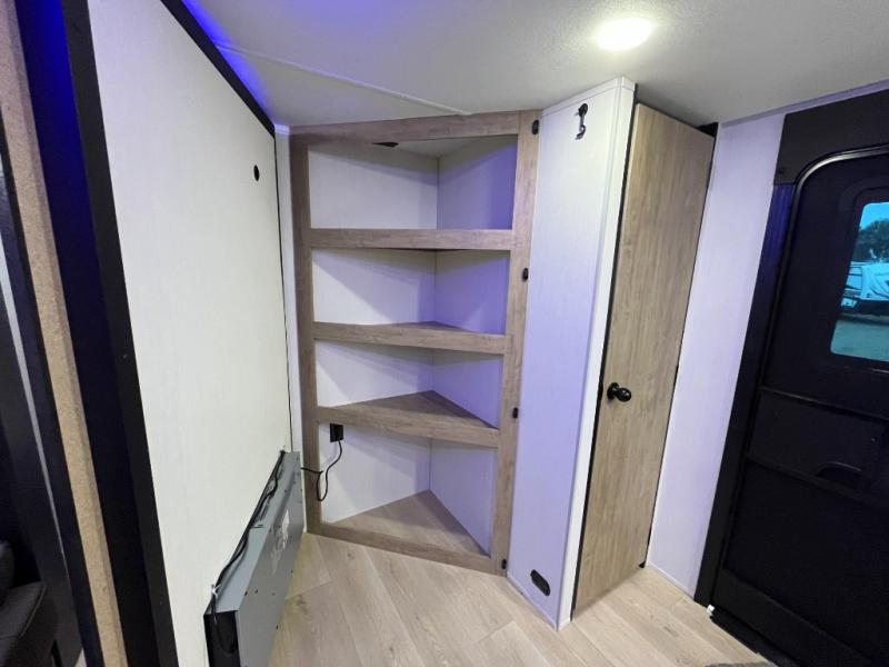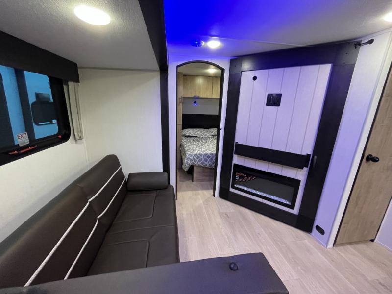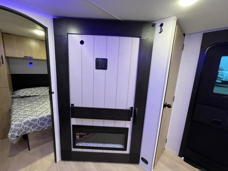 If you've been searching for a travel trailer with a larger sleeping capacity to camp with friends, this is the one! There are double-size bunks in the rear corner, and the full bath with its own exterior entry door is in the other rear corner for easy nighttime use. Up front, an RV king bed in the private bedroom is sure to bring a great night's rest, and you'll find a bedside wardrobe to keep your clothes picked up off of the floor. In the morning, everyone can meet in the main living room that includes a large slide out, U-shaped dinette, sofa, and a fireplace with a hidden pantry behind it for smart storage solutions. An outside kitchen will allow you to get some fresh air as you make dinner, but there's also a full interior kitchen if the weather isn't cooperating. Additional outdoor features include a rear storage rack, an outside TV mount, and a 15' awning for some shade!