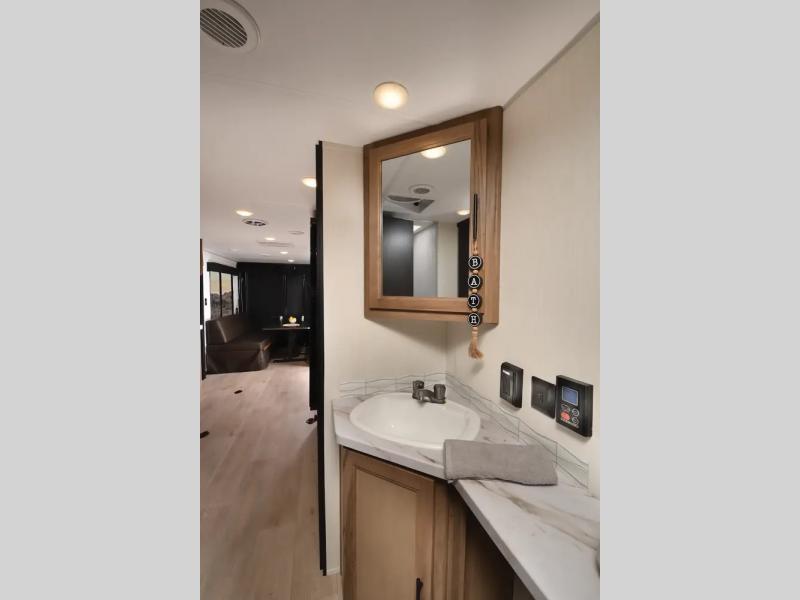 You and your crew will have a fun time camping in this travel trailer! You will find all of the comforts you need with plenty of livable space including a U-shaped dinette slide. There is also a sofa for more seating when company arrives. The spacious full rear bathroom has a shower with a skylight for more head room and natural lighting. You will find ample storage for clothing in the wardrobes that are above handy nightstands for your personal things on either side of the RV king bed in the front private bedroom. There is even an outside kitchen and outside TV mount all protected by the 15' awning!