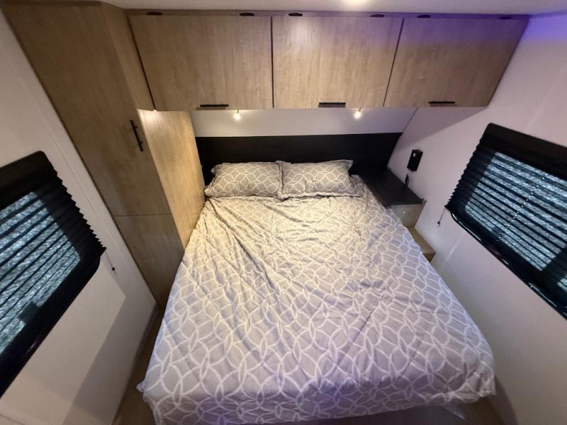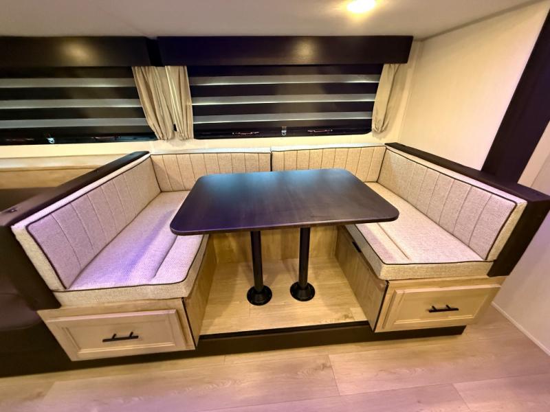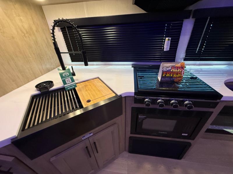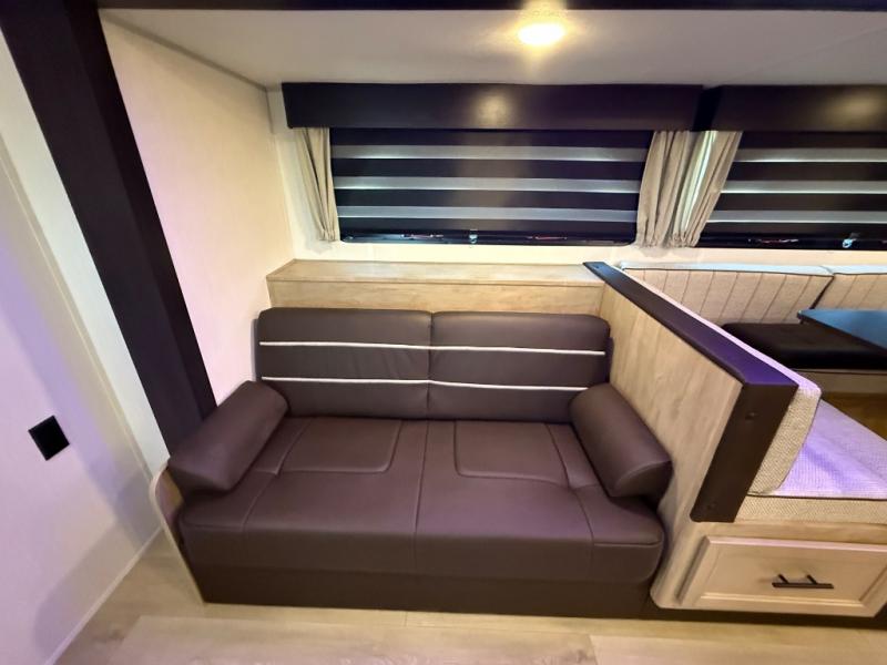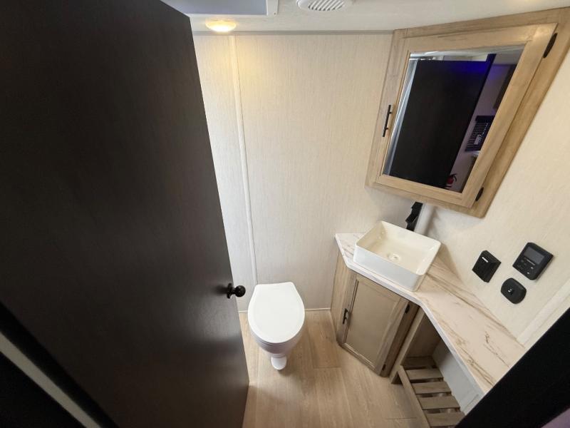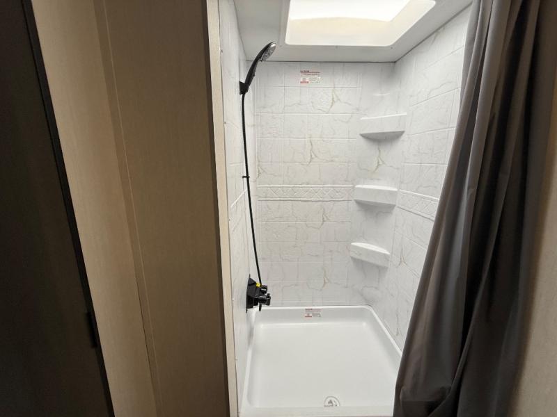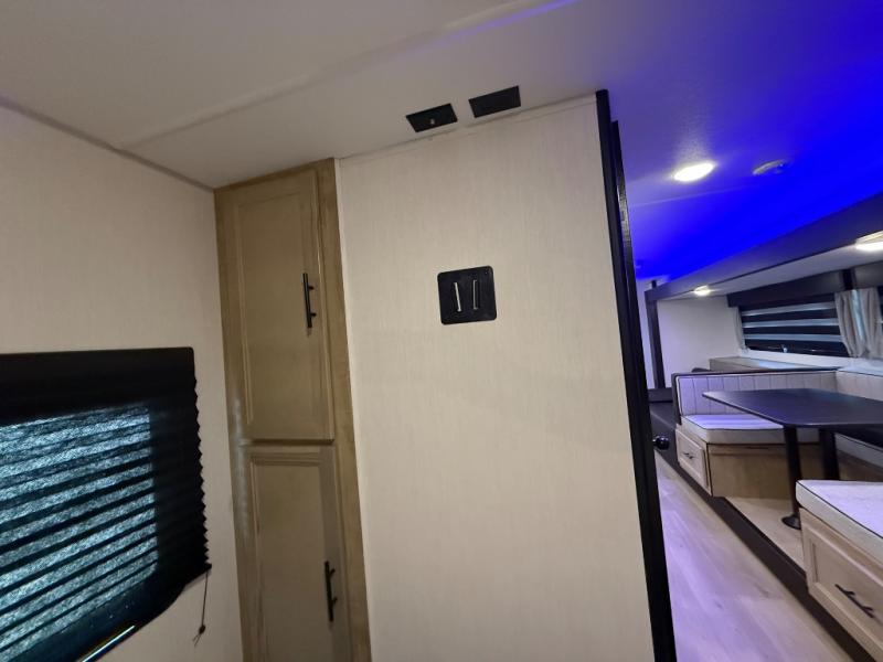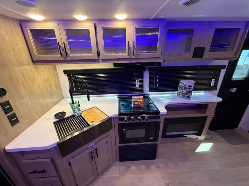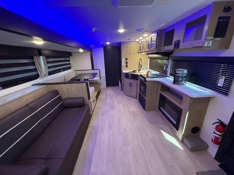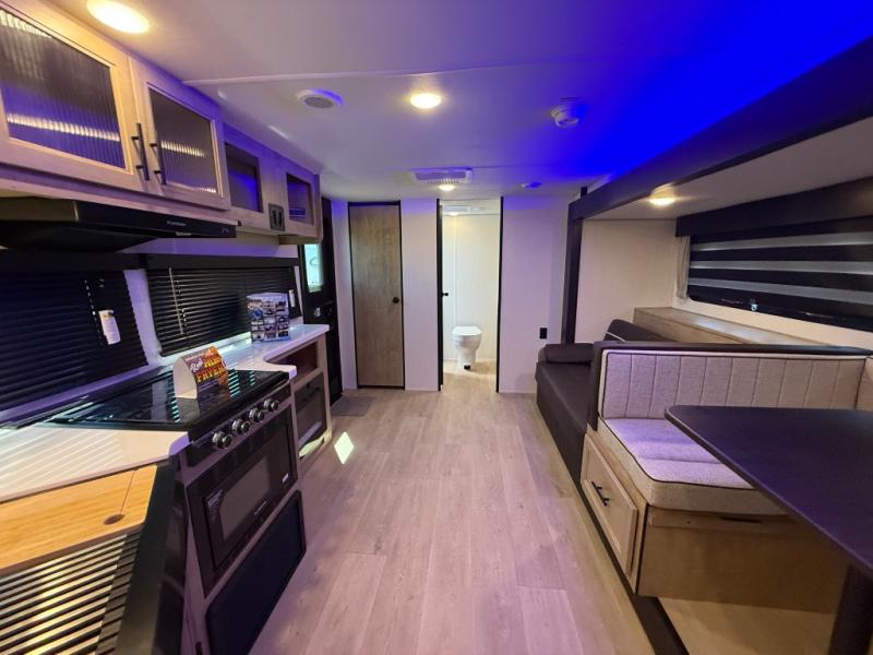 You and your crew will have a fun time camping in this travel trailer! You will find all of the comforts you need with plenty of livable space including a U-shaped dinette slide. There is also a sofa for more seating when company arrives. The spacious full rear bathroom has a shower with a skylight for more head room and natural lighting. You will find ample storage for clothing in the wardrobes that are above handy nightstands for your personal things on either side of the RV king bed in the front private bedroom. There is even an outside kitchen and outside TV mount all protected by the 15' awning!