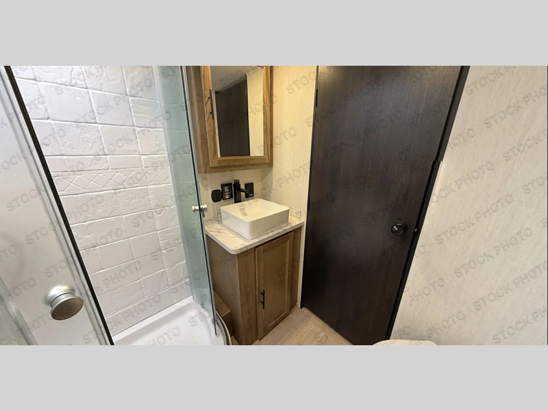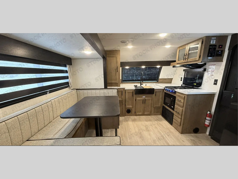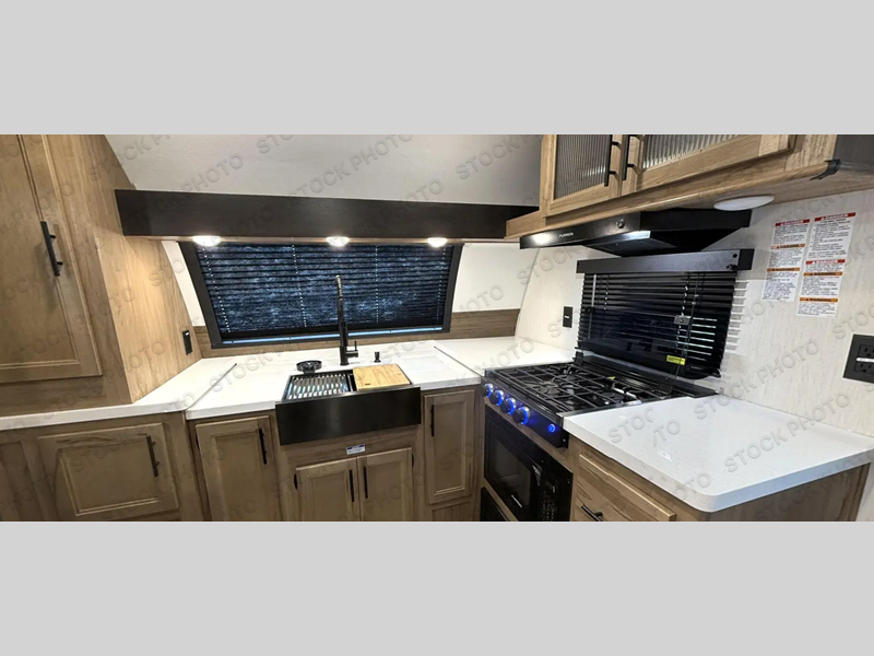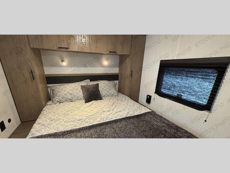 Since this travel trailer features dual entry doors, you can enter in through the rear master bedroom or the front kitchen; how convenient! The kitchen includes ample counter space and all the appliances to prep meals, along with a pantry up front and a hidden pantry behind the fireplace. Your crew can get comfortable on the sofa or play a game around the U-shaped dinette, although you may just find yourselves outdoors since there is an outside kitchen and a power awning with LED lights. The dual entry bath will let you enter in through the main living area, plus it has a private entrance into the bedroom. Here, you'll find an RV king bed, dual wardrobes for your things, and USB ports to keep your electronics charged!