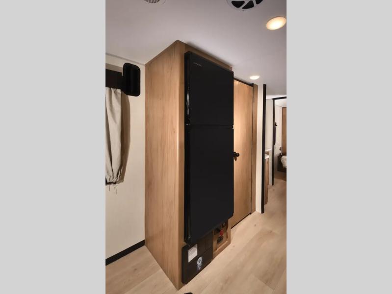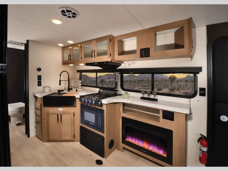This travel trailer will feel just like home with its RV king bed in the front bedroom plus the full bath with a tub/shower, and there is a spacious living area thanks to the large slide out. Here, you'll find the air fryer and counter space, 12V refrigerator, and the fireplace with a hidden pantry behind it. Your crew can relax on the L-shaped sofa, or visit with the chef while they prep meals at the island peninsula. There are even two bar stools here for added convenience. Head outdoors to enjoy the power awning with LED lights in the evening!