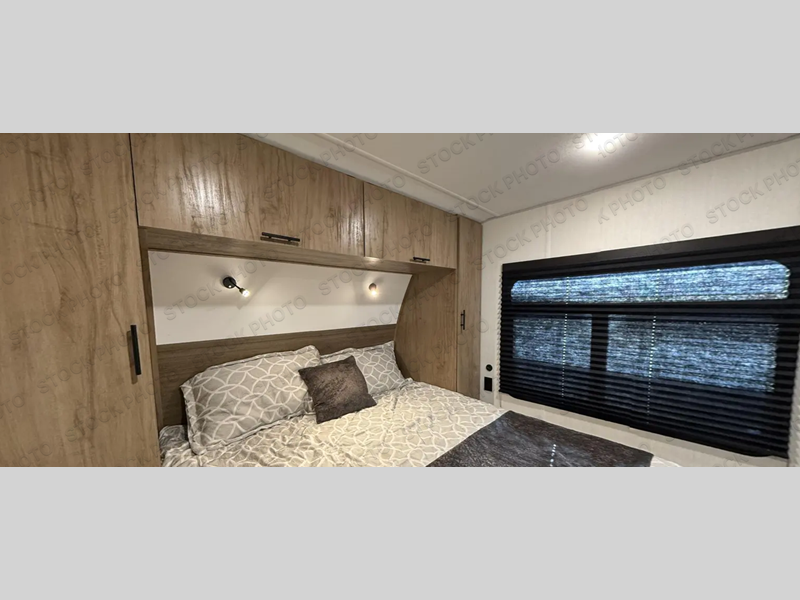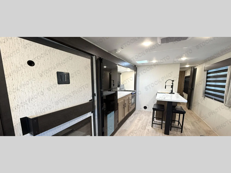 This travel trailer will feel just like home with its RV king bed in the front bedroom plus the full bath with a tub/shower, and there is a spacious living area thanks to the large slide out. Here, you'll find the air fryer and counter space, 12V refrigerator, and the fireplace with a hidden pantry behind it. Your crew can relax on the L-shaped sofa, or visit with the chef while they prep meals at the island peninsula. There are even two bar stools here for added convenience. Head outdoors to enjoy the power awning with LED lights in the evening!