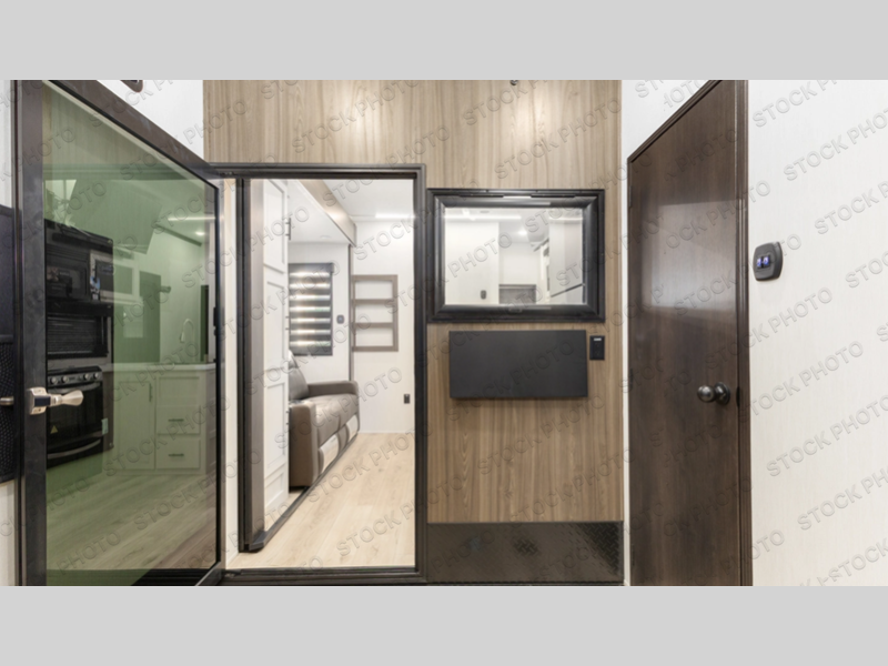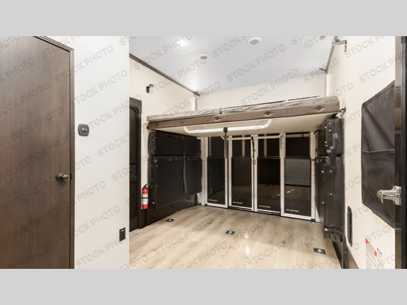 This double slide out toy hauler is ready for adventure when you are! Once your toys are unloaded from the separate garage, you can set up the flip-up sofas or set up the drop-down queen bed for guests to sleep on, and there is even a half bath here for added convenience. You'll enjoy the front private bedroom all to yourselves that includes a king bed slide and a large dresser to keep your things organized. The combined kitchen and living area includes a three-burner range and 30" microwave to make meals, a sofa with recliners to relax on, plus a 12V refrigerator and pantry for food storage.
