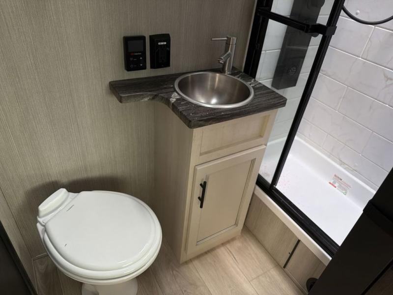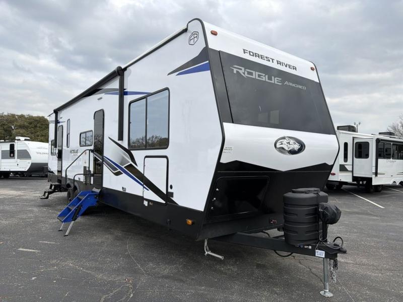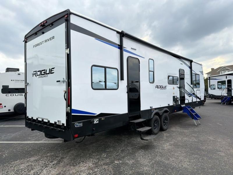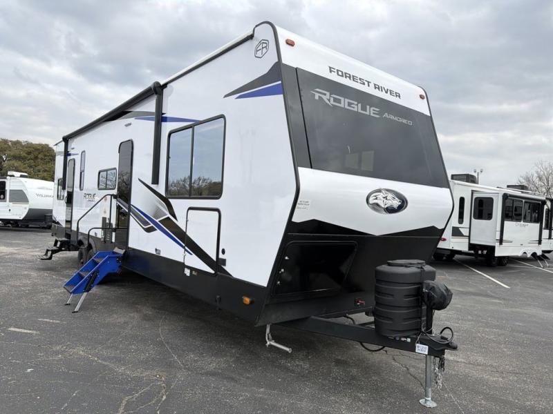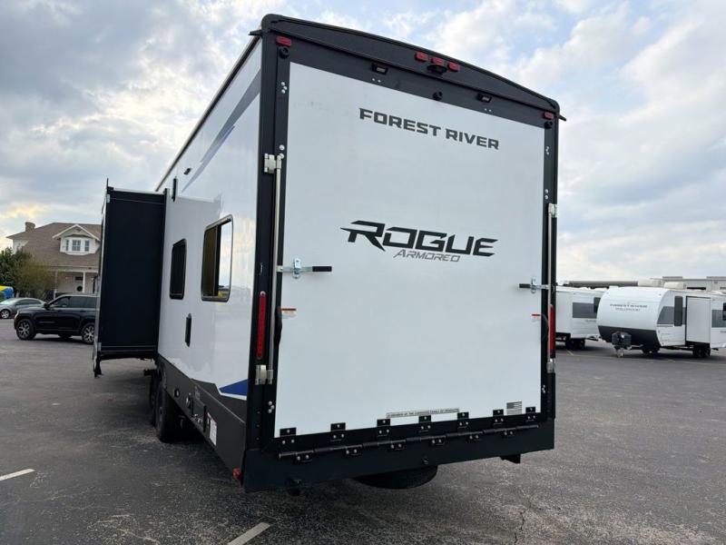 Every one of these Forest River Cherokee Rogue Armored travel trailer toy haulers come with the features you want most at an affordable price tag! The DuraPoxy gas/oil resistant floor has 5,000 lb. tie downs to ensure your toys will arrive safely without damaging the flooring, plus the 3,000 lb. rated ramp door makes it easy to load them. A 15,000 BTU A/C will keep you cool even on the hottest summer days, and there are heated enclosed holding tanks with 12V heat pads on every tank for added protection. Each model includes a fuel station with a digital readout, a ramp door patio system, a tire pressure monitoring system, and many more stand-out features. Inside, you'll find zebra shades in the living room, multiple USB charging stations, a multi-functional kitchen sink, glass shower doors, and many more comforts!
