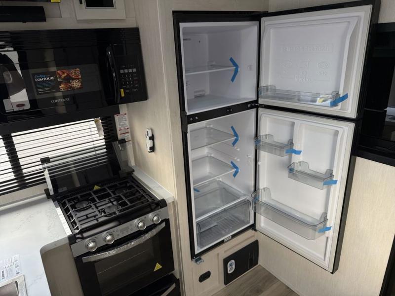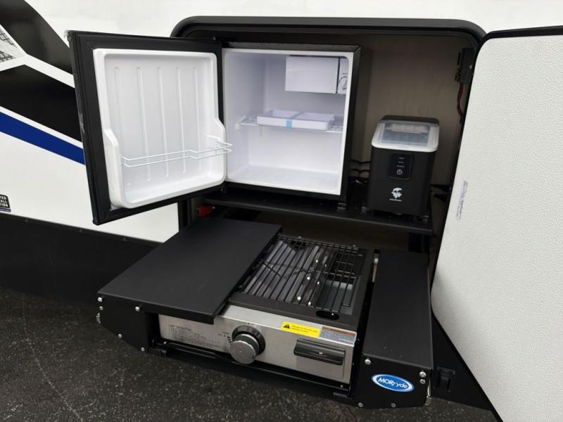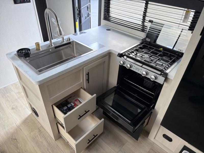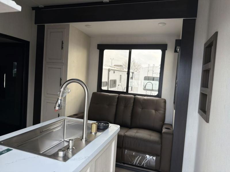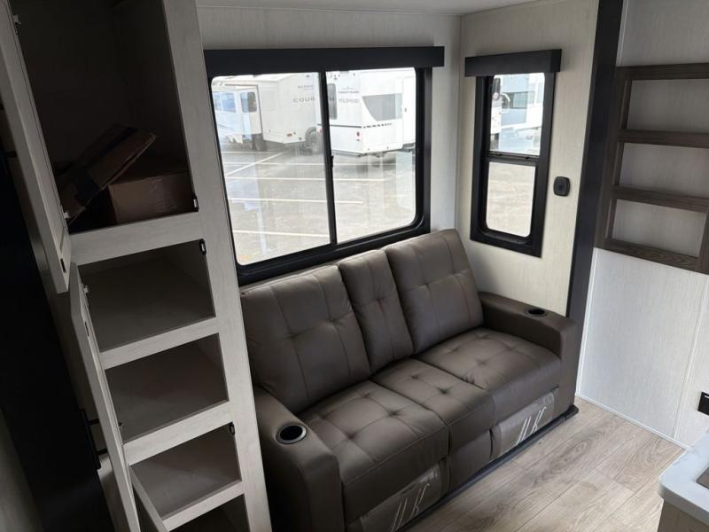 This double slide out toy hauler is ready for adventure when you are! Once your toys are unloaded from the separate garage, you can set up the flip-up sofas or set up the drop-down queen bed for guests to sleep on, and there is even a half bath here for added convenience. You'll enjoy the front private bedroom all to yourselves that includes a king bed slide and a large dresser to keep your things organized. The combined kitchen and living area includes a three-burner range and 30" microwave to make meals, a sofa with recliners to relax on, plus a 12V refrigerator and pantry for food storage.