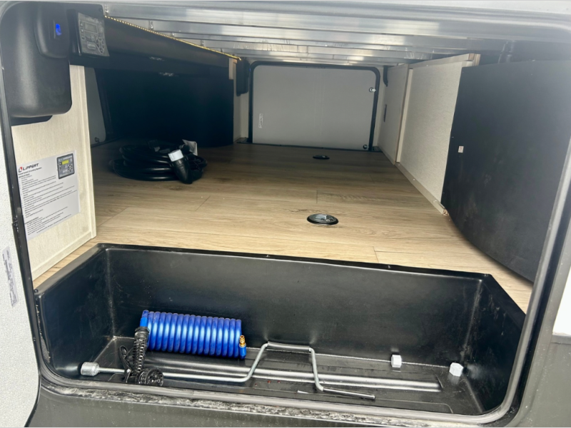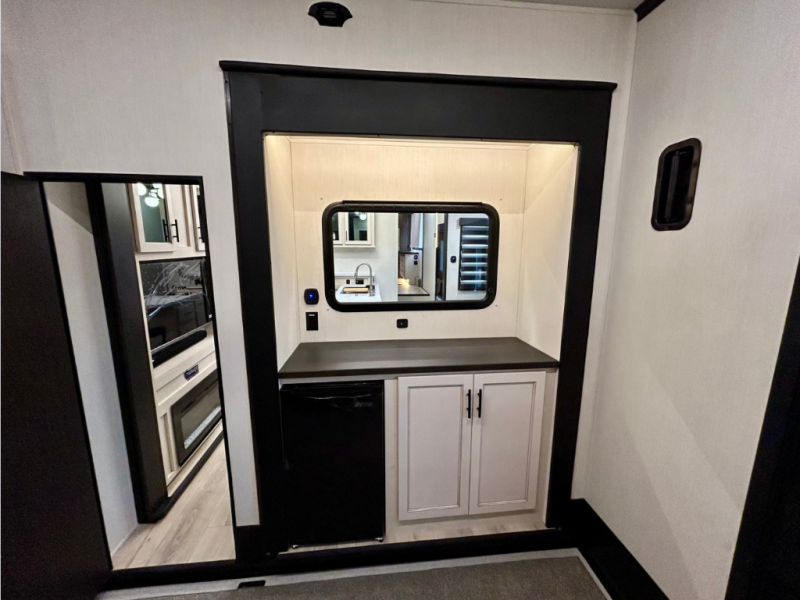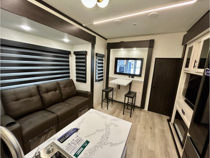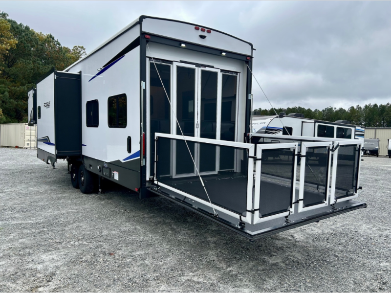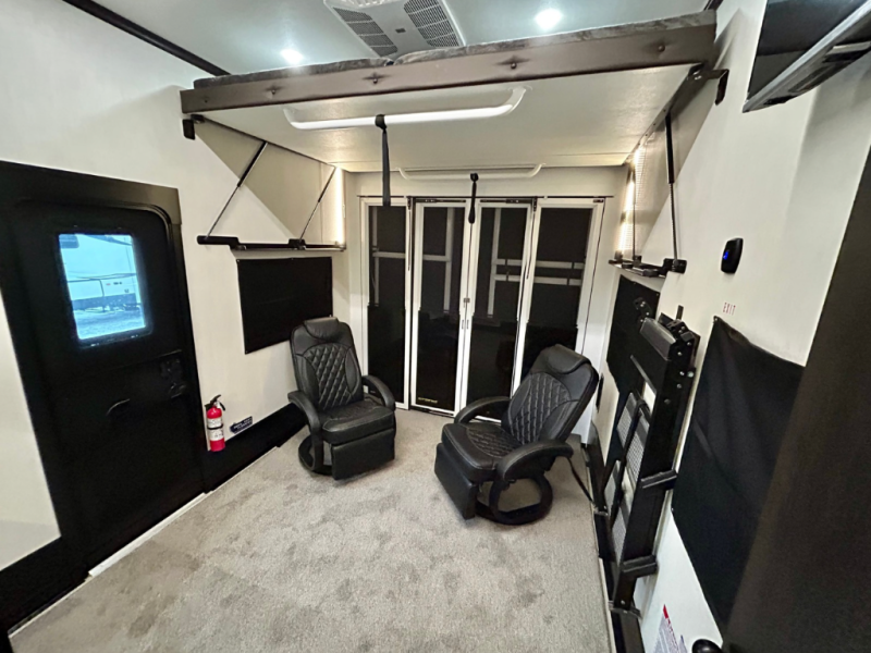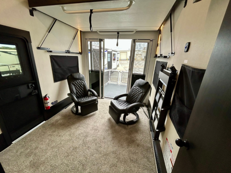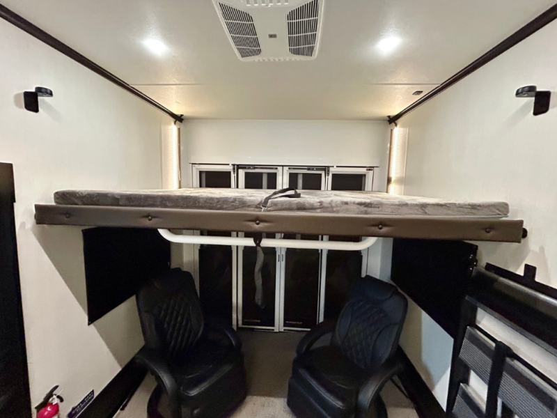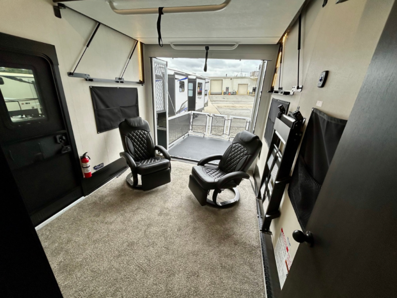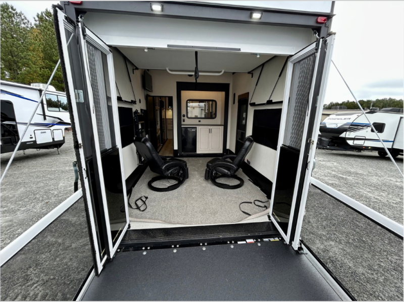This toy hauler with an 11' separate garage is sure to meet your needs! After you've unloaded your toys, you can relax on the Euro recliners or set up the drop-down queen bed for guests if it's getting late. There is also a window in the garage that opens to the main living area to keep everyone connected, and the flip-up table on the other side of the window provides a place to dine at. A counter peninsula will give the chef of your group more space to prep meals, and the dual opposing slides in this space make it more open. You'll also enjoy the sofa with recliners across from the entertainment center with a fireplace. A full bath with a spacious shower is perfect for cleaning up after a day of trail riding, and the front private bedroom with a queen bed slide is sure to have you feeling right at home!