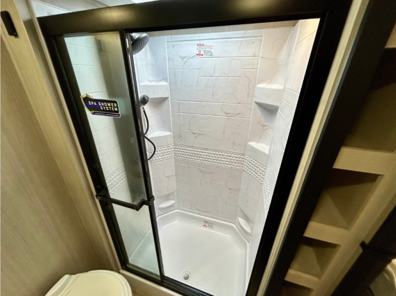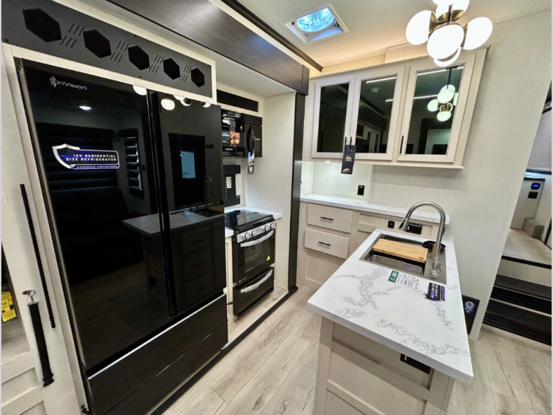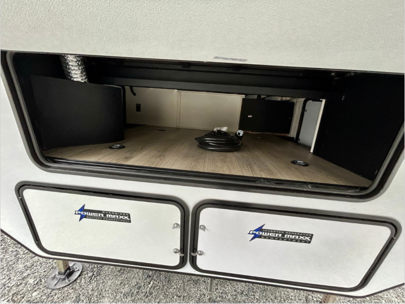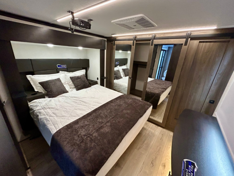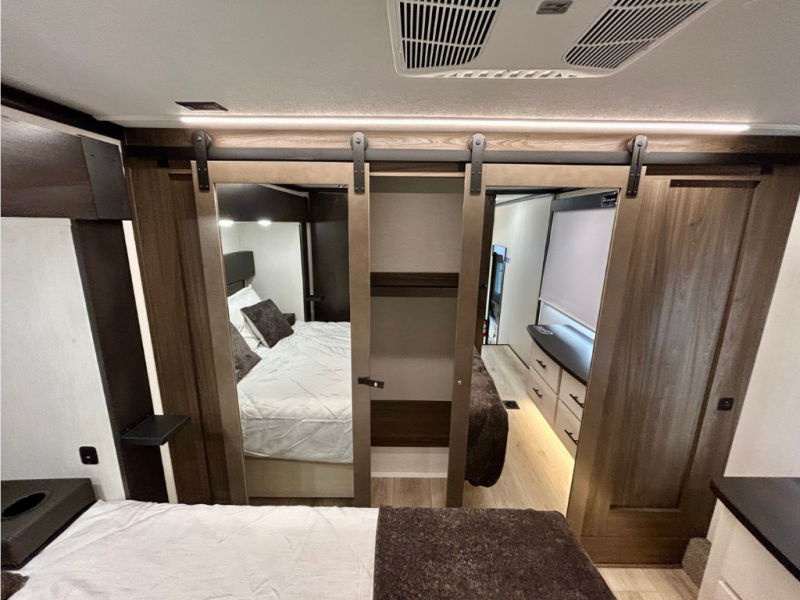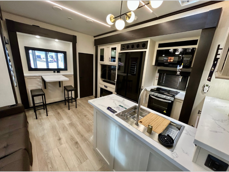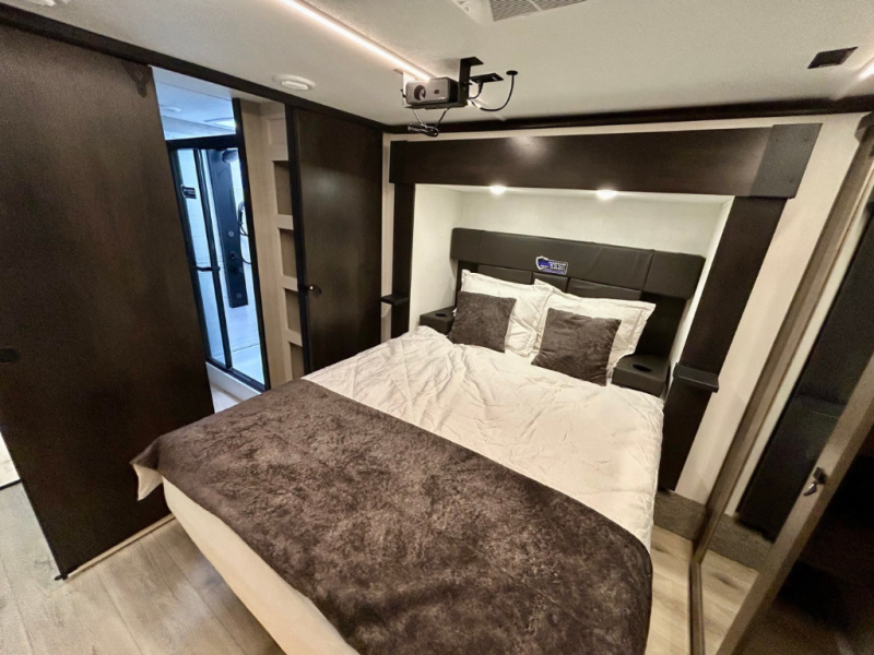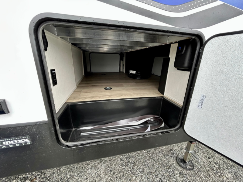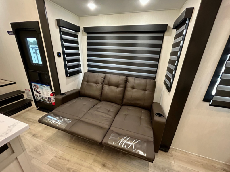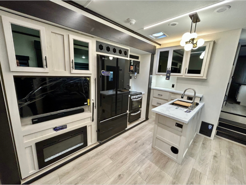 This toy hauler with an 11' separate garage is sure to meet your needs! After you've unloaded your toys, you can relax on the Euro recliners or set up the drop-down queen bed for guests if it's getting late. There is also a window in the garage that opens to the main living area to keep everyone connected, and the flip-up table on the other side of the window provides a place to dine at. A counter peninsula will give the chef of your group more space to prep meals, and the dual opposing slides in this space make it more open. You'll also enjoy the sofa with recliners across from the entertainment center with a fireplace. A full bath with a spacious shower is perfect for cleaning up after a day of trail riding, and the front private bedroom with a queen bed slide is sure to have you feeling right at home!