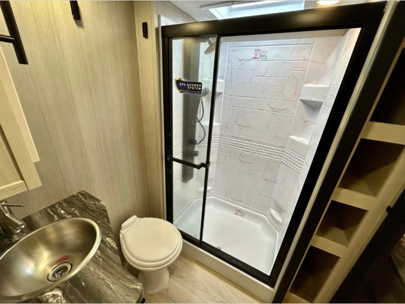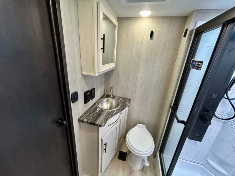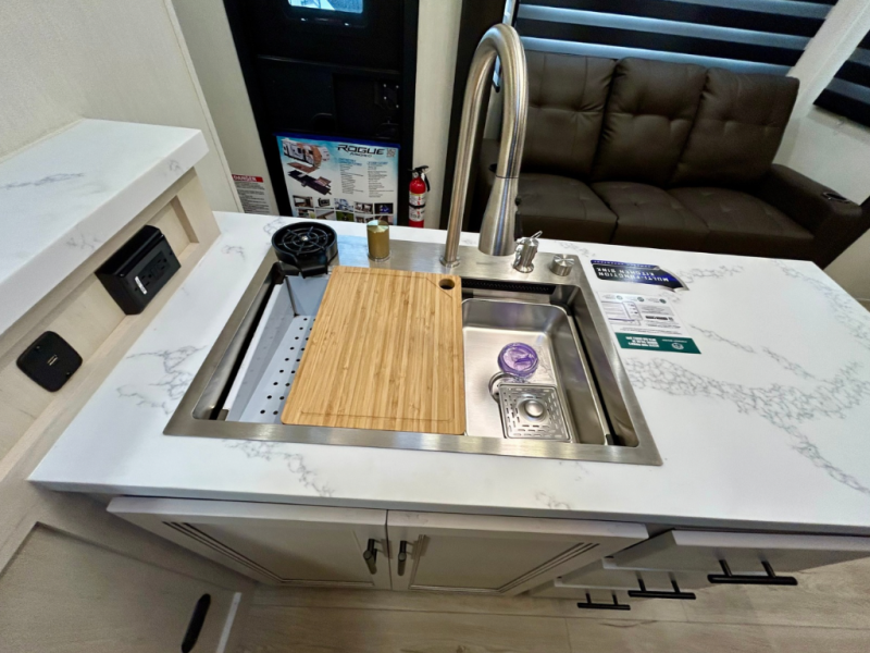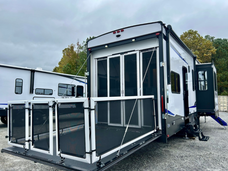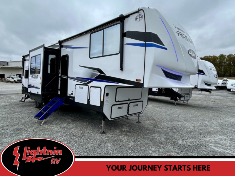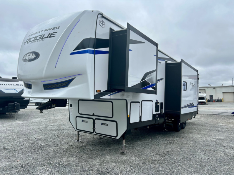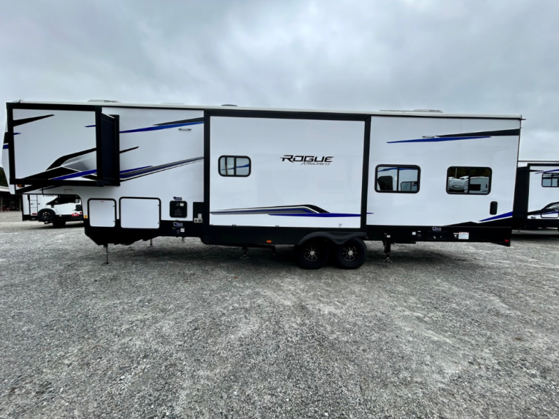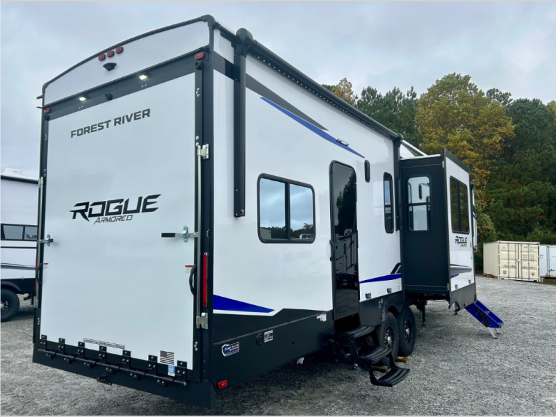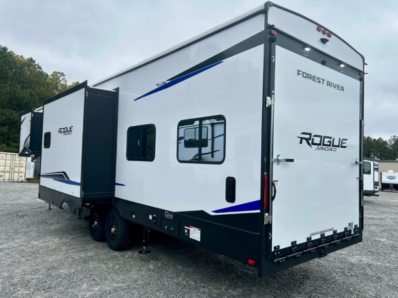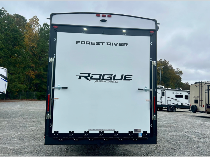 Every one of these Forest River Cherokee Rogue Armored fifth wheel toy haulers come with the features you want most at an affordable price tag! The DuraPoxy gas/oil resistant floor has 5,000 lb. tie downs to ensure your toys will arrive safely without damaging the flooring, plus the 3,000 lb. rated ramp door makes it easy to load them. Two 15,000 BTU A/Cs are "Super H Ducted" to keep you cool even on the hottest summer days, and the heated enclosed holding tanks help protect against the elements. Each model also includes a 6-point leveling system, dual LED cargo lights, solar reflective windows, and a tire pressure monitoring system. Inside, you'll enjoy the solid surface countertops, glass shower door, zebra shades in the living room, and stainless-steel multi-purpose sink to name a few comforts!