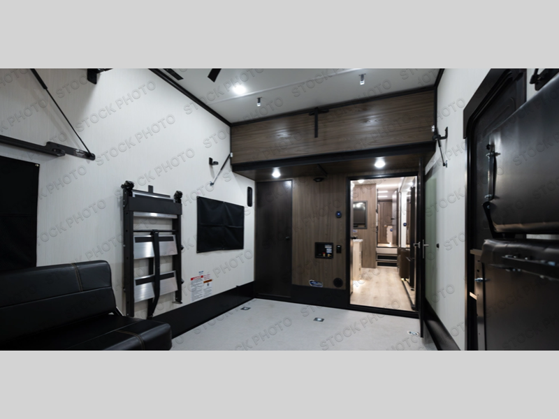 Hit the trails with this triple slide out toy hauler! Once your dirt bikes are unloaded from the 14' 6" garage, you can relax on the dual flip-up sofas with a free-standing table. There is also a raised queen bed above the sofas, a utility bath/shower plus a loft, making this space perfect for guests! The chef of your group will find a counter peninsula to prep meals, a 12V residential style refrigerator, plus a 30" microwave when you need to heat up leftovers. Your crew can get comfortable on the L-shaped sofa or the second sofa, and there is a fireplace to make it cozier! Head up front to the master bedroom that includes a king bed slide out, a large front wardrobe and a dresser, plus your own private full bathroom!
