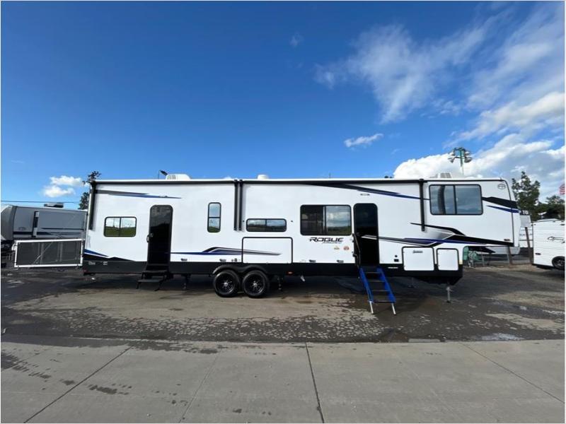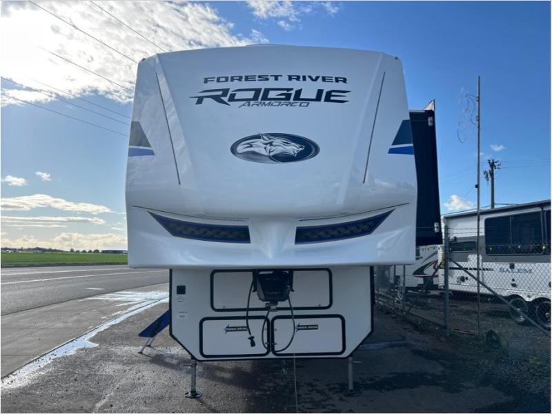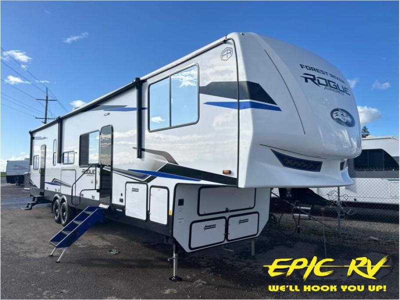 Every one of these Forest River Cherokee Rogue Armored fifth wheel toy haulers come with the features you want most at an affordable price tag! The DuraPoxy gas/oil resistant floor has 5,000 lb. tie downs to ensure your toys will arrive safely without damaging the flooring, plus the 3,000 lb. rated ramp door makes it easy to load them. Two 15,000 BTU A/Cs are "Super H Ducted" to keep you cool even on the hottest summer days, and the heated enclosed holding tanks help protect against the elements. Each model also includes a 6-point leveling system, dual LED cargo lights, solar reflective windows, and a tire pressure monitoring system. Inside, you'll enjoy the solid surface countertops, glass shower door, zebra shades in the living room, and stainless-steel multi-purpose sink to name a few comforts!