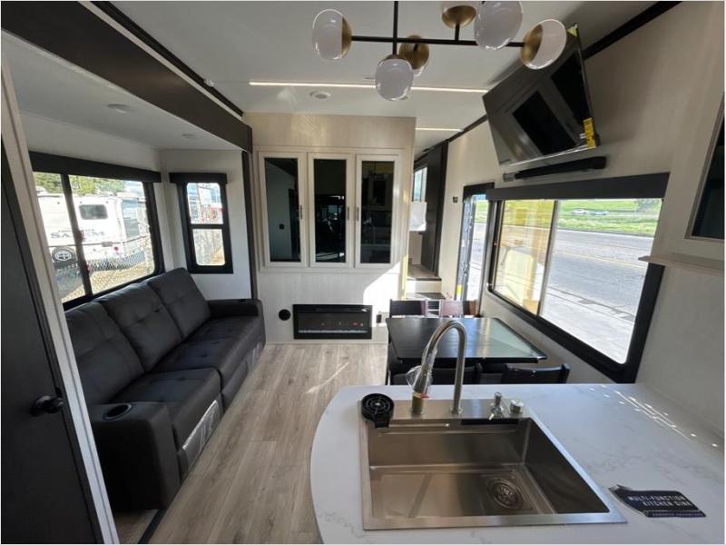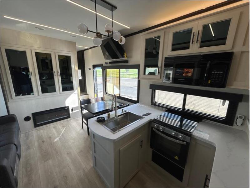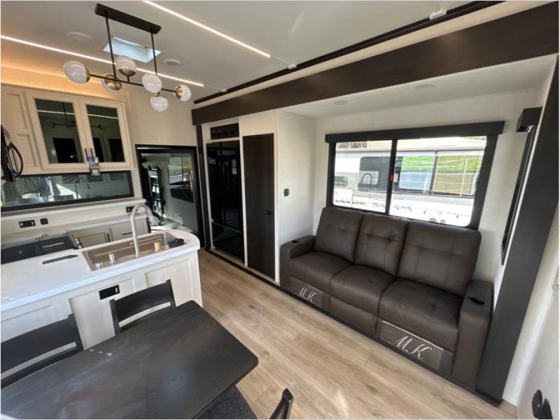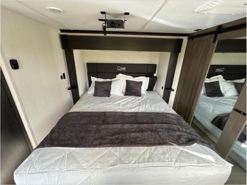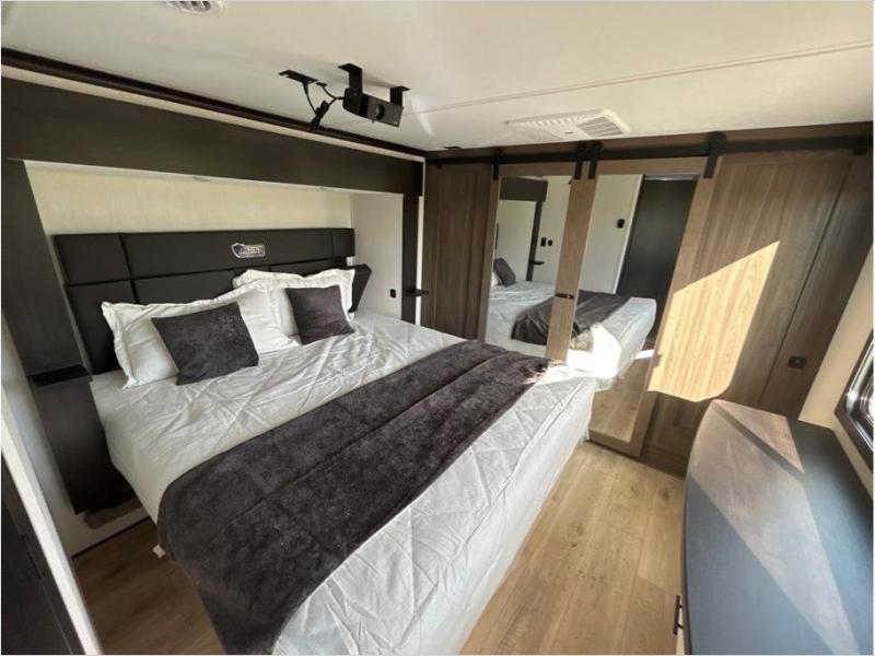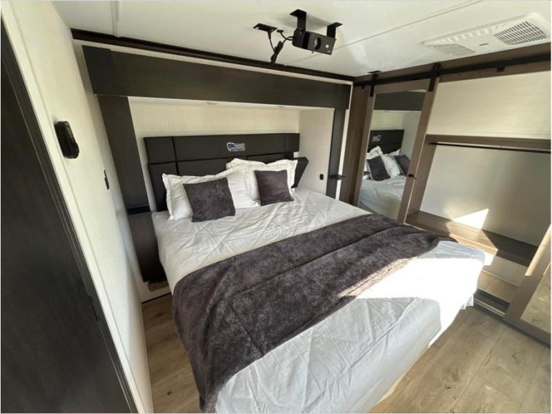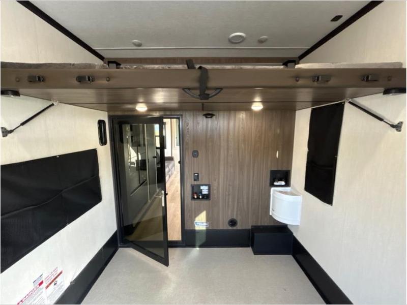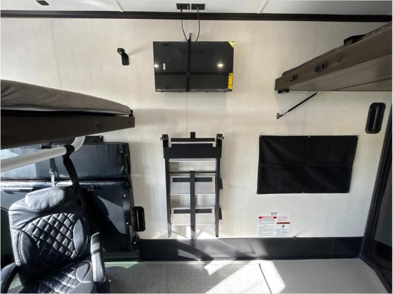 This toy hauler is perfect for a larger group since it can sleep up to eight with the added loft in the garage. There are also dual flip-up sofas here, along with a queen bed above and a half bath for added convenience! The dual entry full bath is up front, creating a master bedroom you are sure to love. There is a king bed slide out, a front wardrobe, and a dresser to keep your things organized. Head to the middle kitchen and living room to relax on the sofa within the large slide out, dine at the table with four chairs, and cook in the full kitchen. This unit also includes a fireplace to make it cozier, a large pantry to keep snacks stocked, and dual power awnings to expand your living space outdoors!