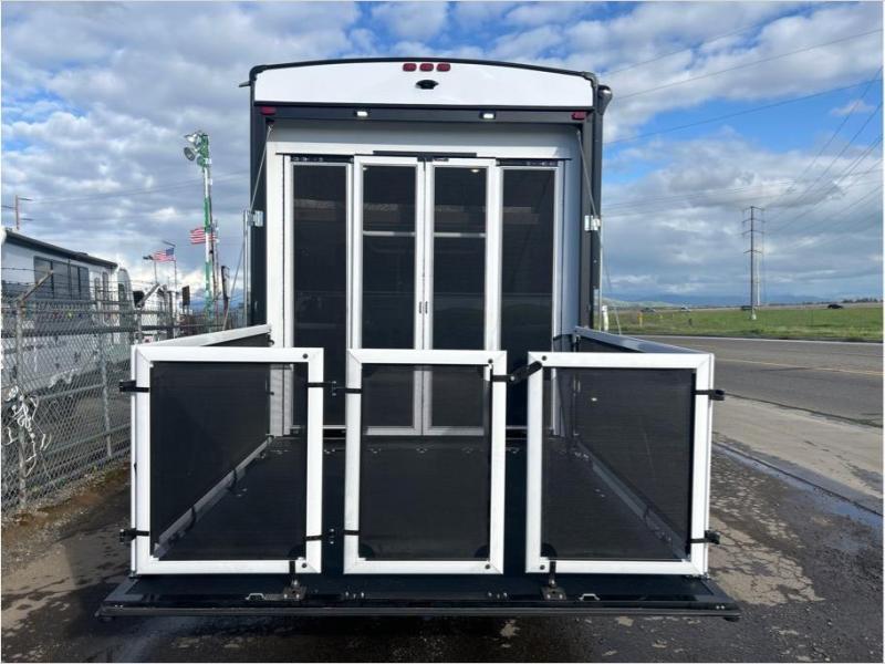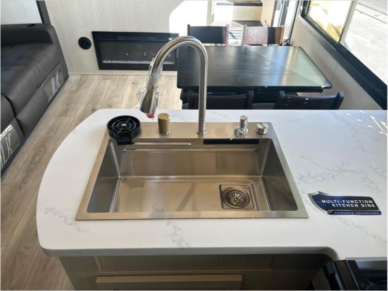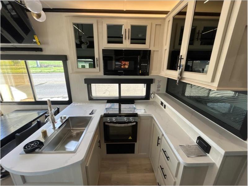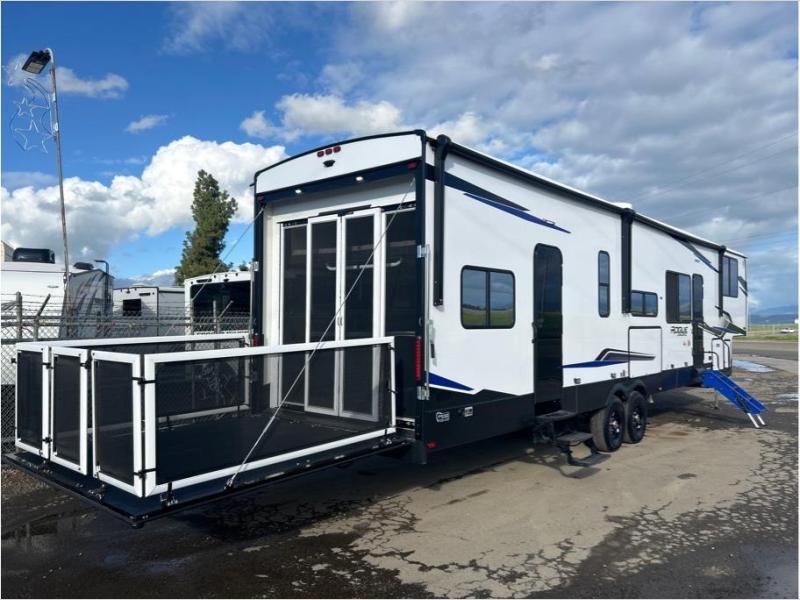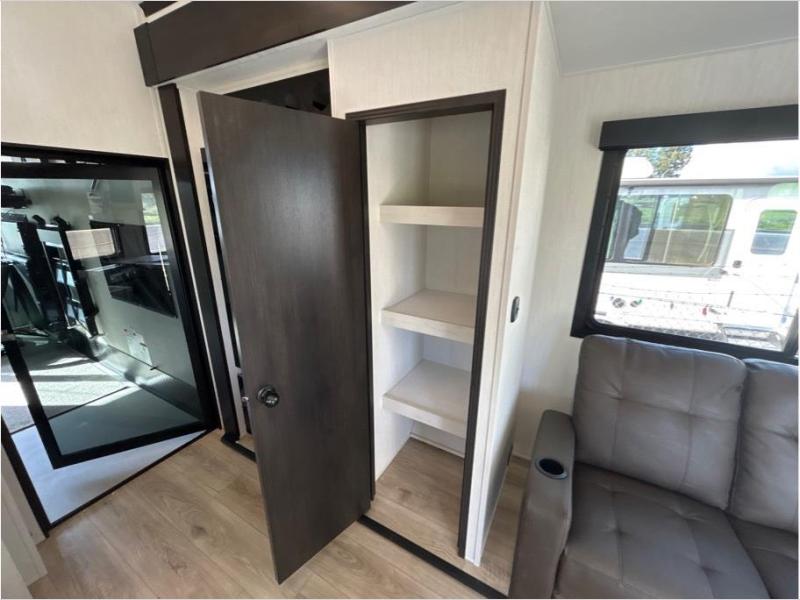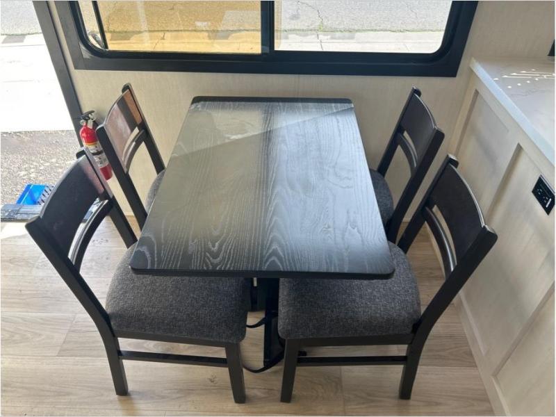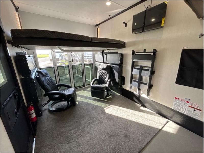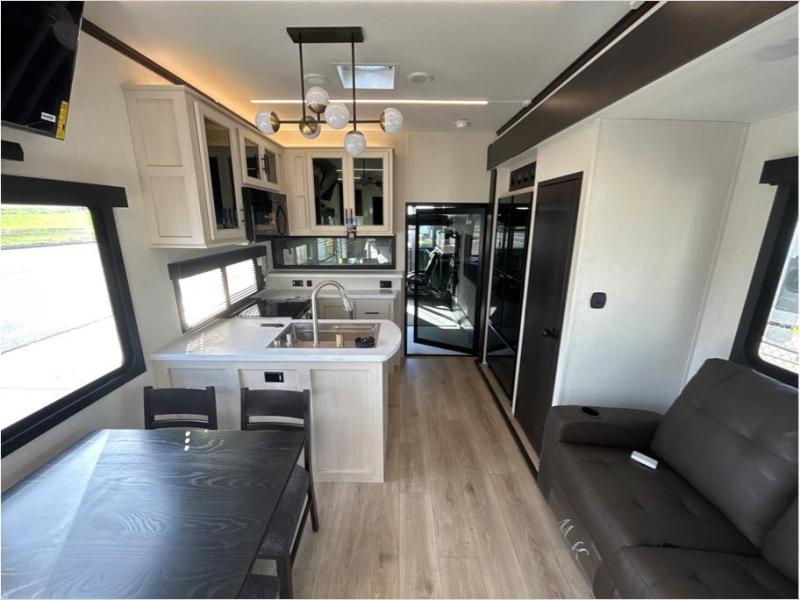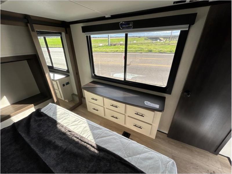 This toy hauler is perfect for a larger group since it can sleep up to eight with the added loft in the garage. There are also dual flip-up sofas here, along with a queen bed above and a half bath for added convenience! The dual entry full bath is up front, creating a master bedroom you are sure to love. There is a king bed slide out, a front wardrobe, and a dresser to keep your things organized. Head to the middle kitchen and living room to relax on the sofa within the large slide out, dine at the table with four chairs, and cook in the full kitchen. This unit also includes a fireplace to make it cozier, a large pantry to keep snacks stocked, and dual power awnings to expand your living space outdoors!
