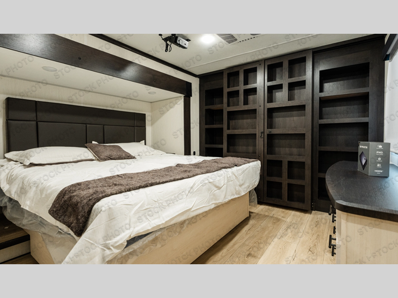 You can't go wrong when camping in this spacious fifth wheel! Once you've unloaded your gear, you can head in through the main entry door that leads to the combined kitchen and living room. There is a large island here to prep lunch, a deluxe pantry, a bar top with stools that overlooks a flip-up window, and even a half bath off of the kitchen for added convenience. A rear garage includes a sofa slide out across from a TV and fireplace, plus fold-up steps that lead to the loft with two bunks mats, TV prep and storage cubbies for your guests' things. You'll find your own bedroom up front with an RV king bed slide out, a front closet with two sliding wardrobe doors, a dresser, and TV prep if you want to watch movies in bed. And the spacious full bath is right next to the bedroom for easy nighttime use!